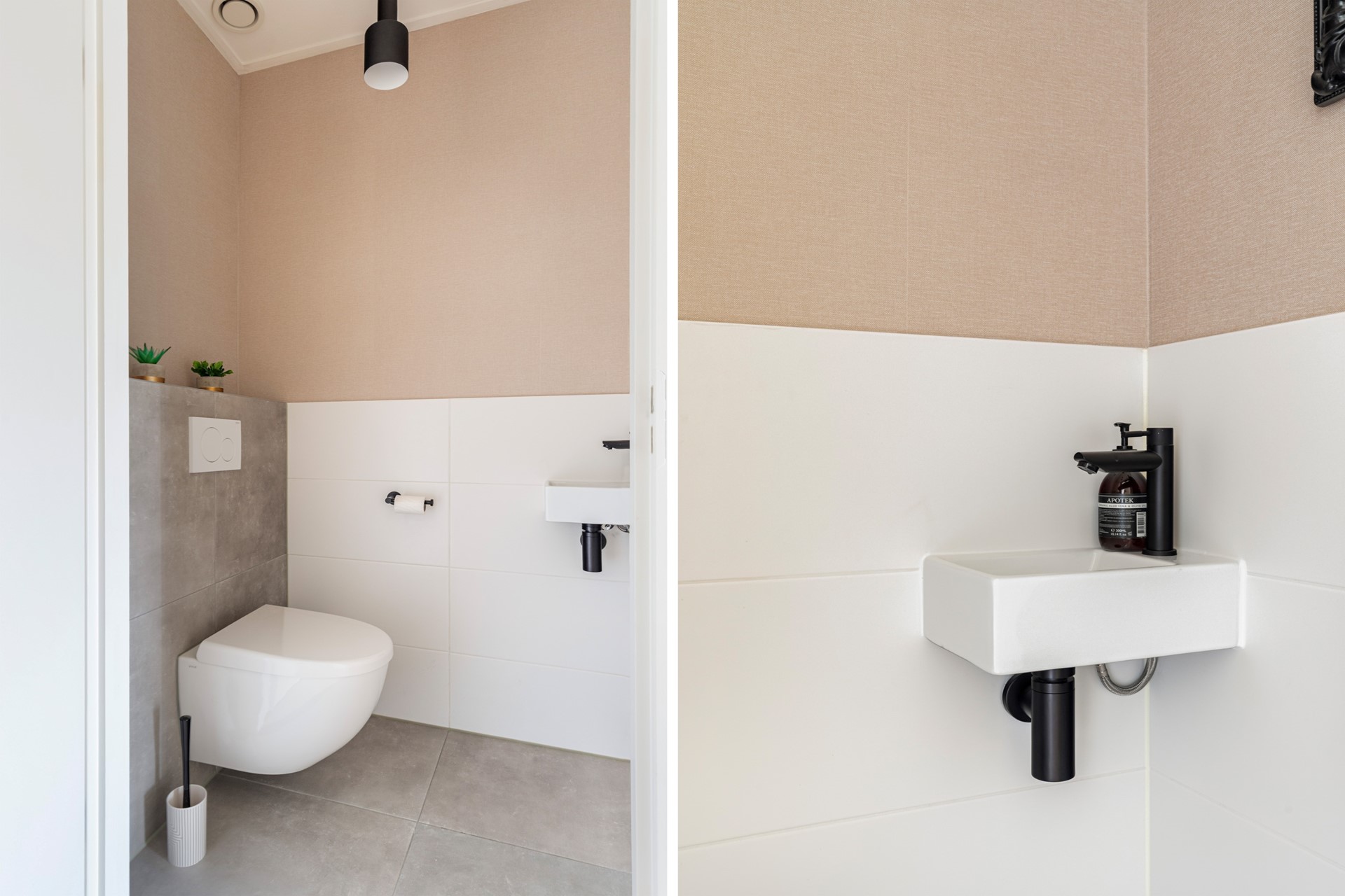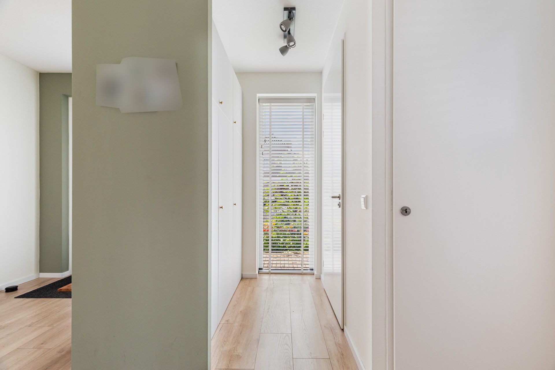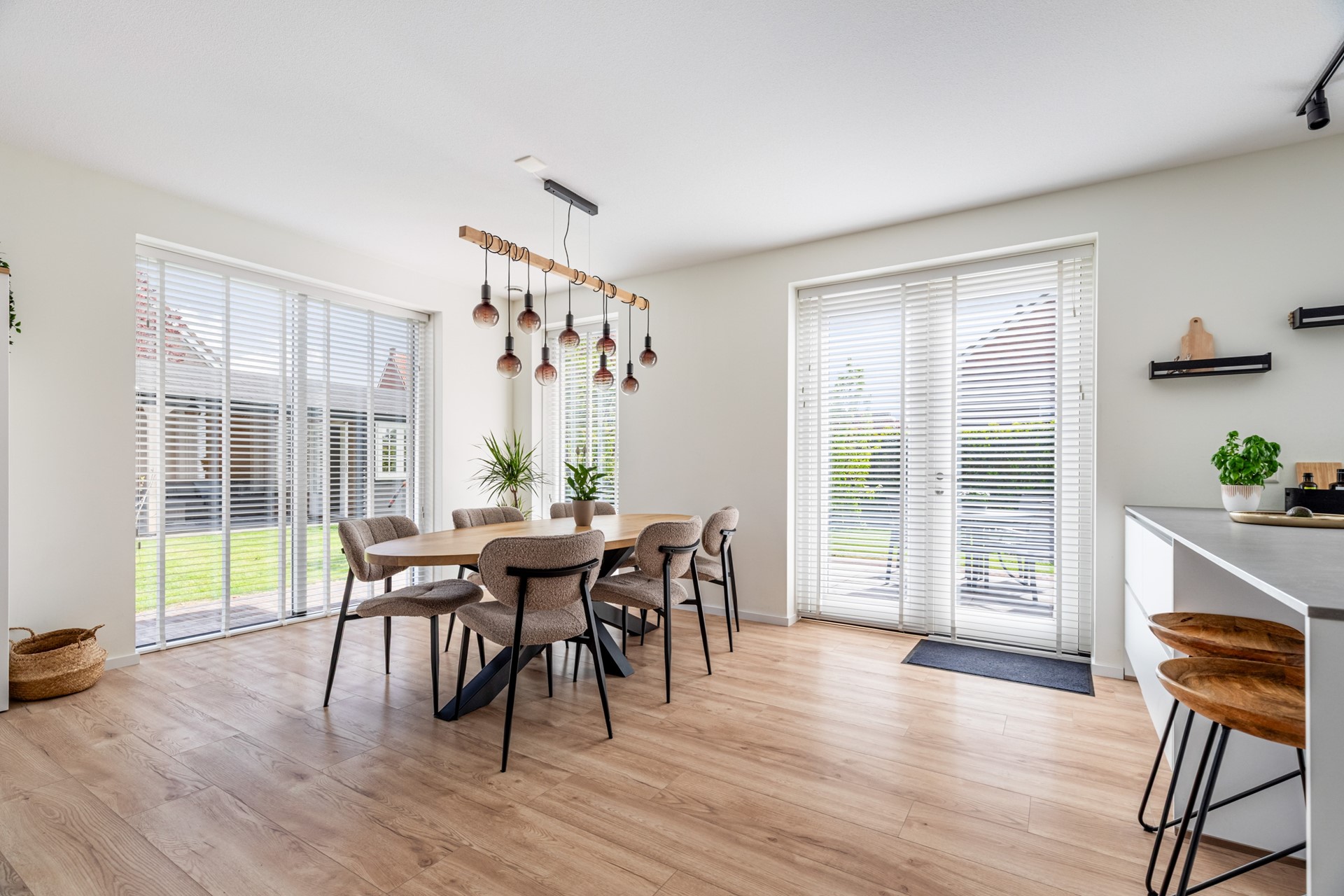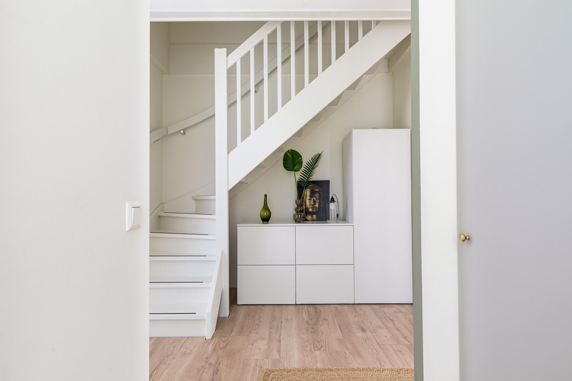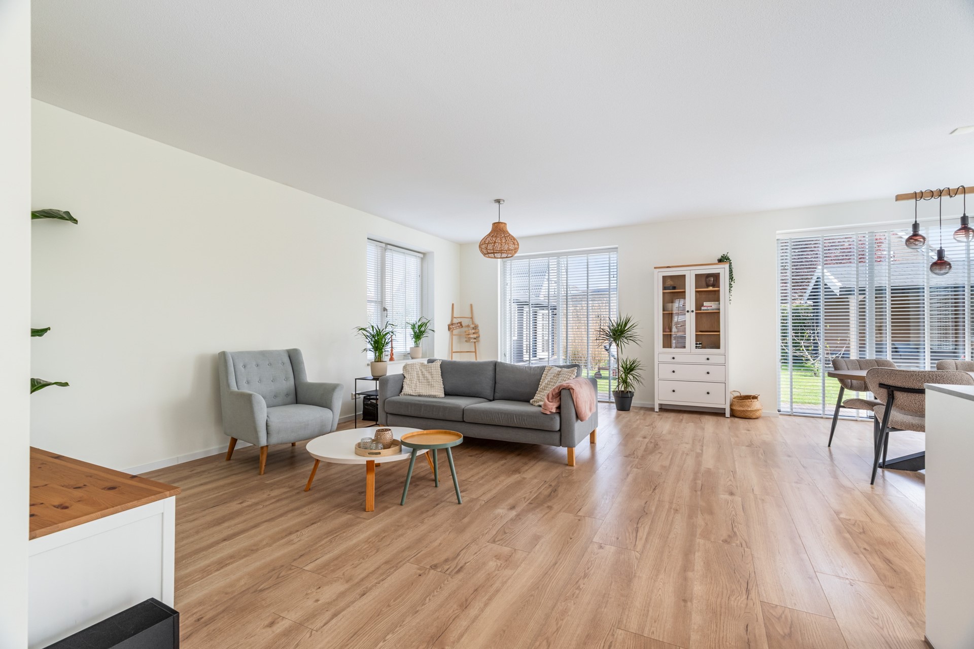 Binnenkomst in de hal met toilet, trapopgang en toegang tot de leefruimte. Wat direct opvalt is de strakke en hoogwaardige afwerking: een laminaat vloer in houtmotief in combinatie met gestuukte wanden en plafonds zorgt voor een moderne en rustige uitstraling. De woonkamer is ruim en licht en staat in directe verbinding met de tuin, wat zorgt voor een prettig binnen-buiten gevoel.