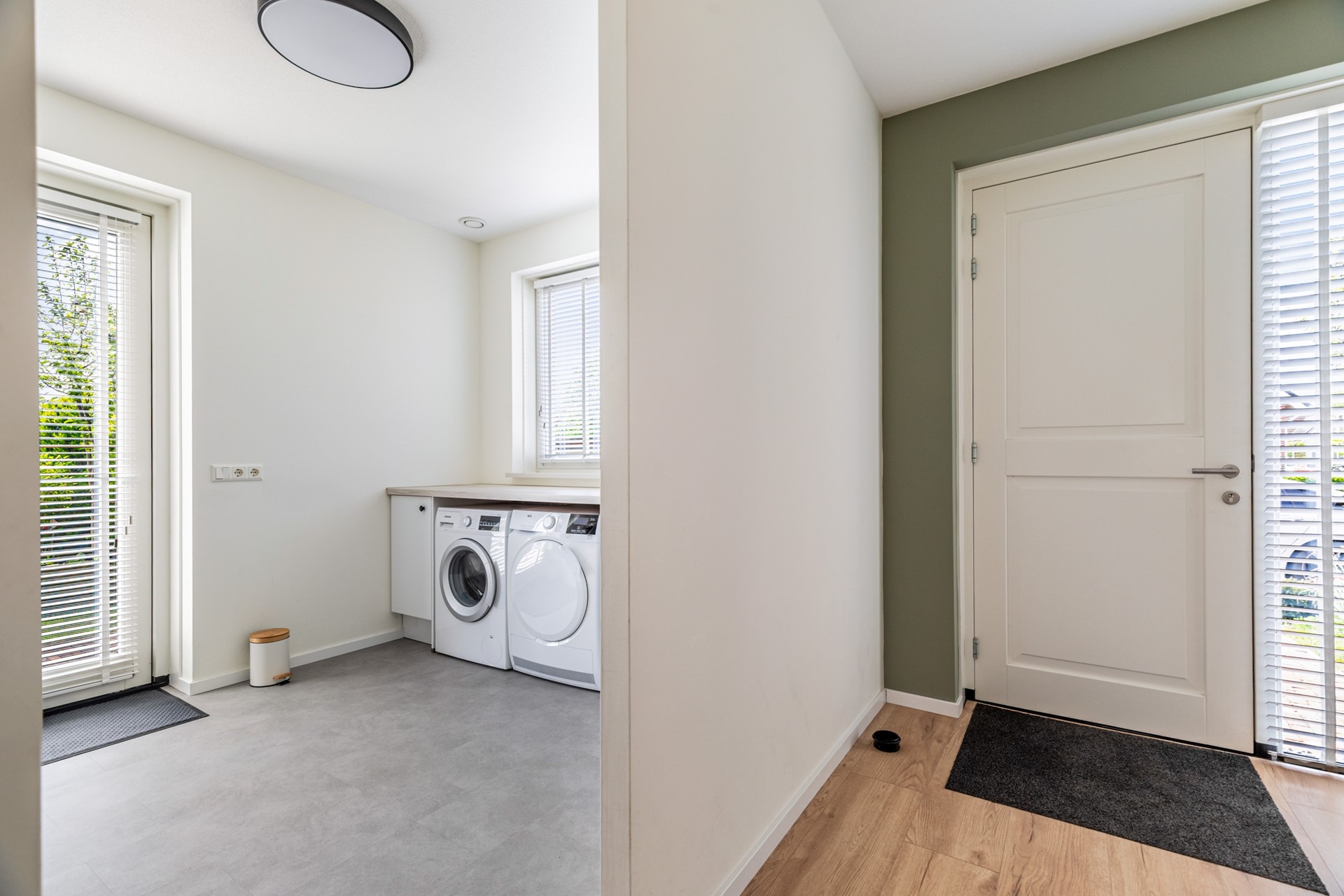 Aansluitend bevindt zich de ruime bijkeuken met wasmachineaansluiting en volop werk- en bergruimte. Vanuit hier geven openslaande deuren direct toegang tot de tuin, wat het geheel extra praktisch en comfortabel maakt.