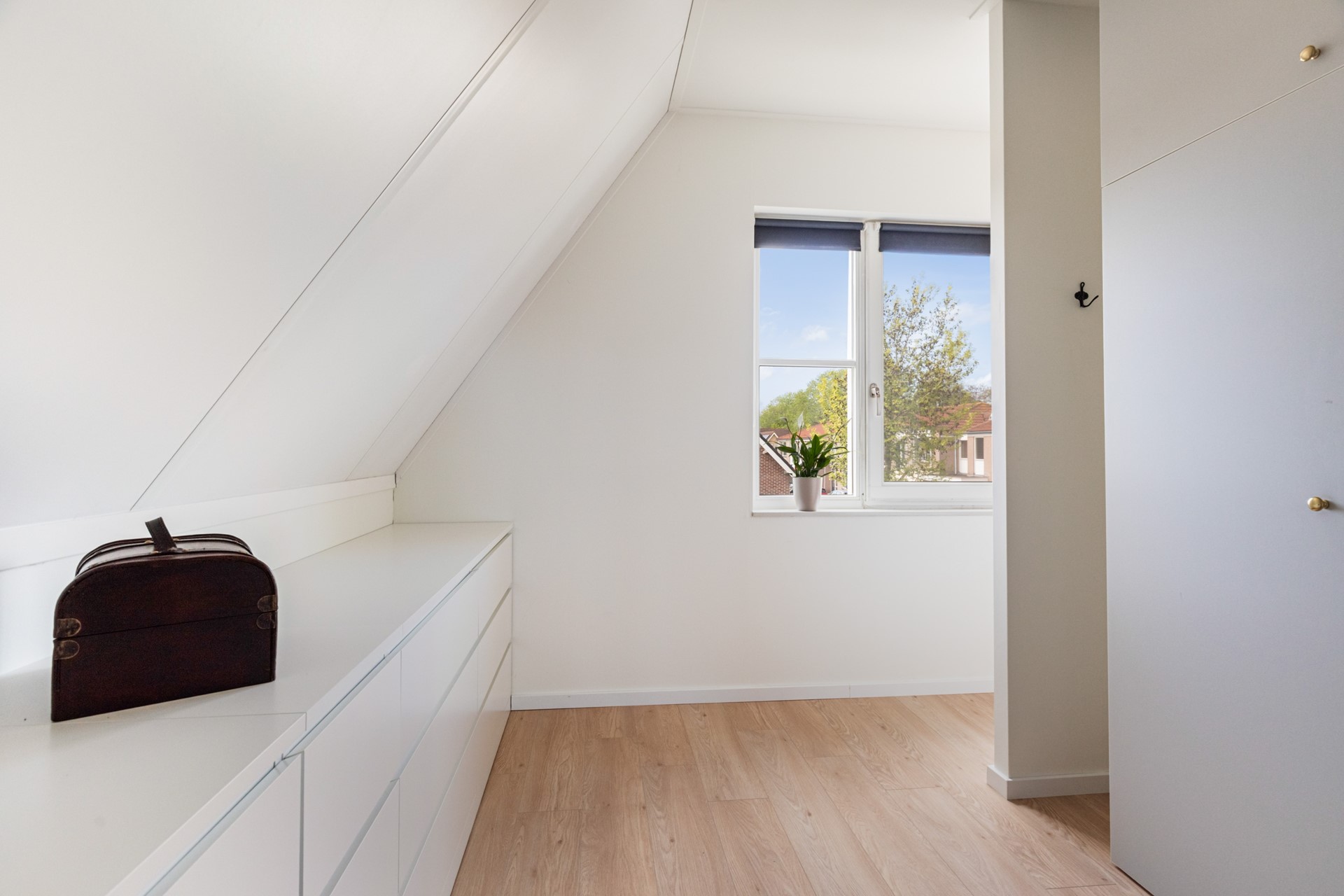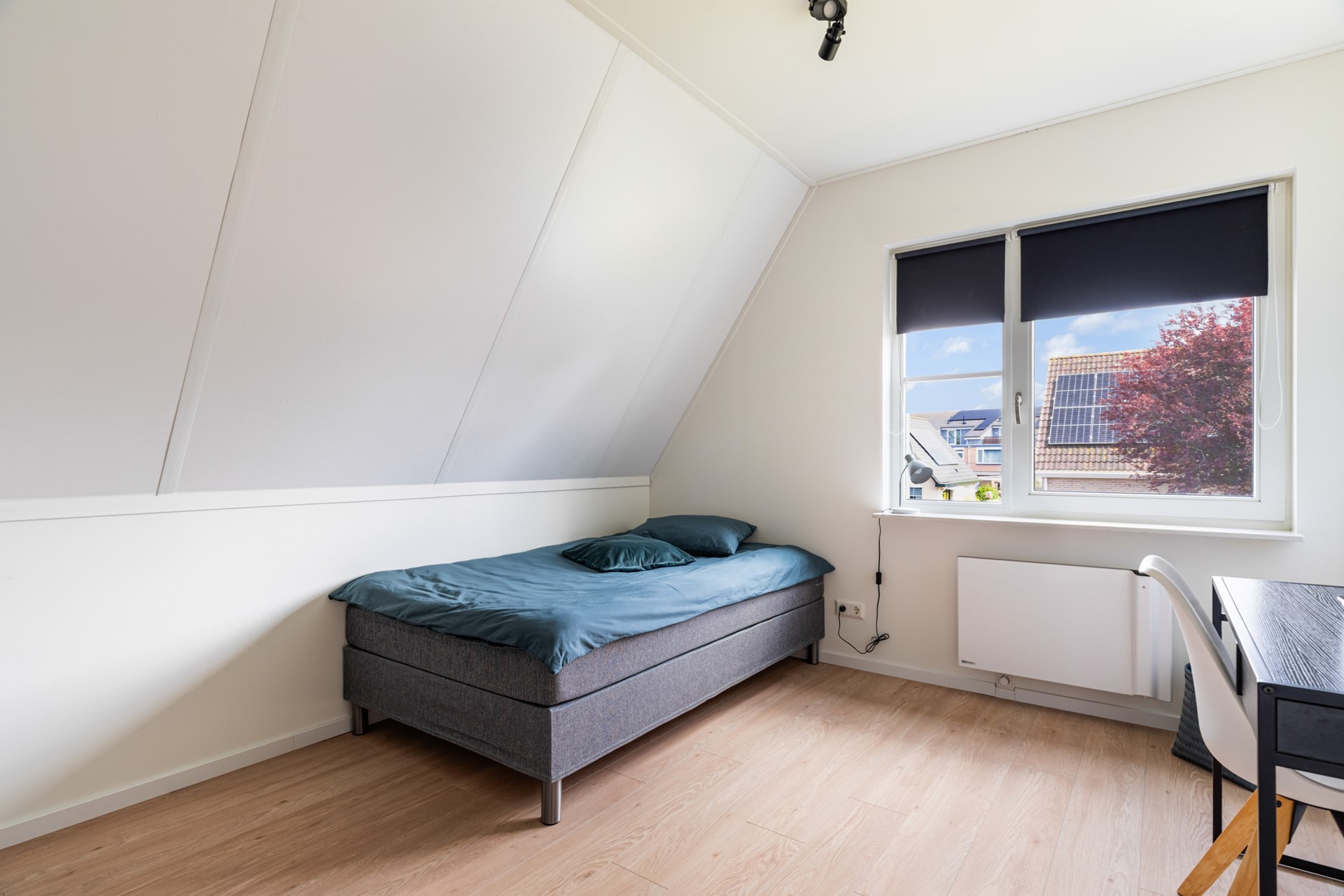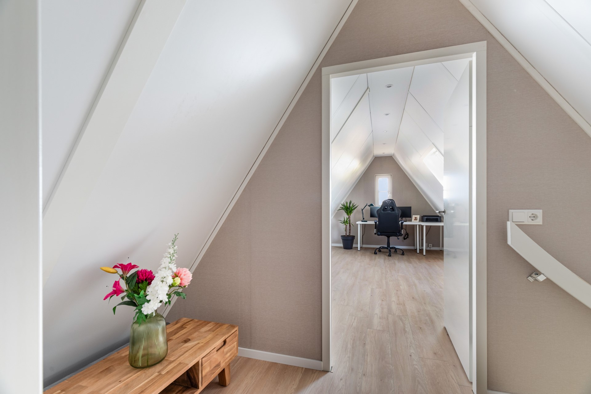 De zolderverdieping is volwaardig en multifunctioneel ingericht. Hier vind je een vierde slaapkamer, een werkruimte en praktische bergruimte. Dankzij het dakraam is er voldoende daglicht aanwezig, waardoor deze verdieping prettig aanvoelt en goed bruikbaar is voor verschillende doeleinden.