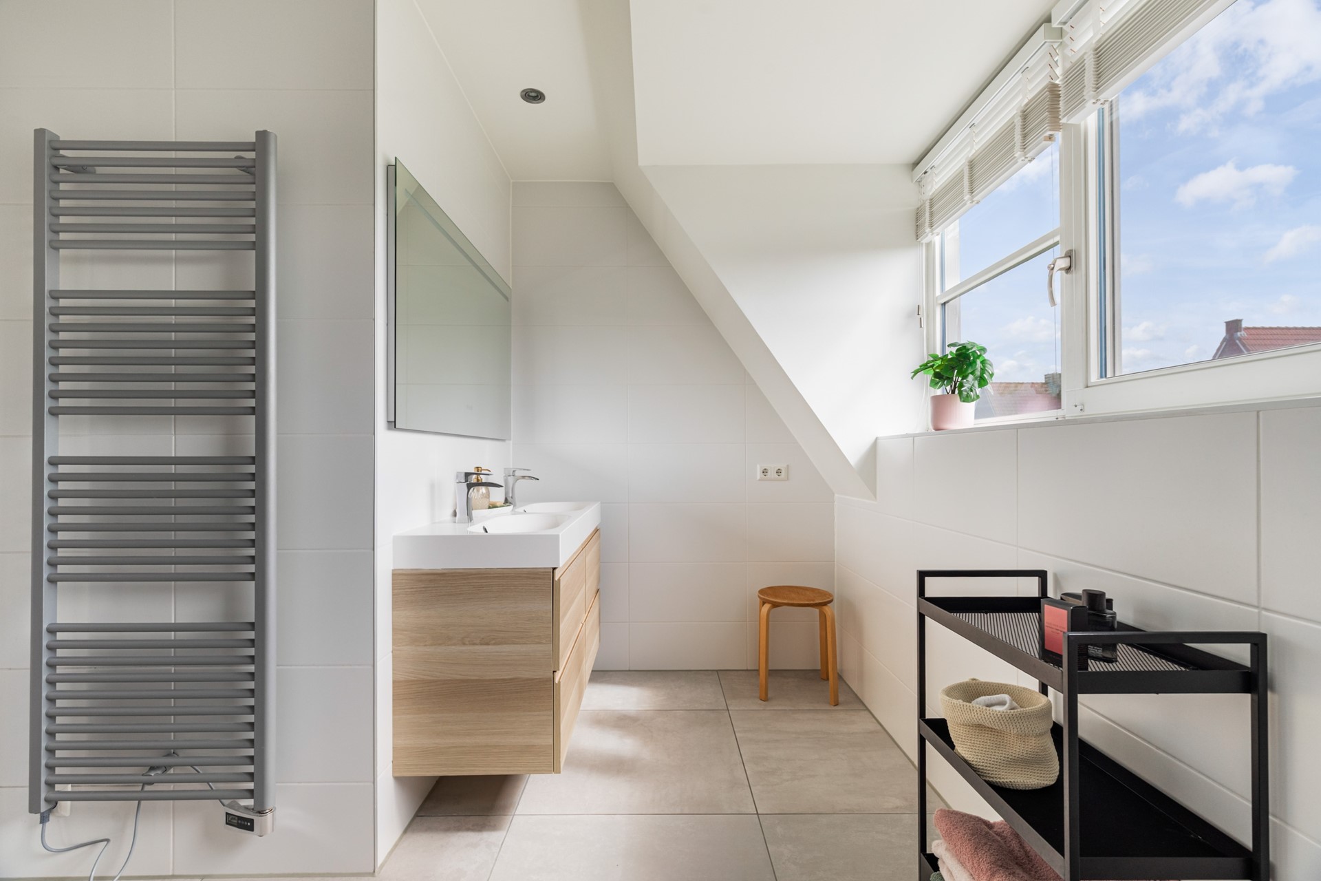 Aan de achterzijde bevinden zich twee gelijkwaardige slaapkamers, ideaal voor kinderen, gasten of als werkruimte. De badkamer is modern, volledig betegeld en voorzien van een dubbele wastafel en een ruime inloopdouche. Op de overloop bevindt zich daarnaast een separaat toilet, wat het gebruik extra comfortabel maakt.