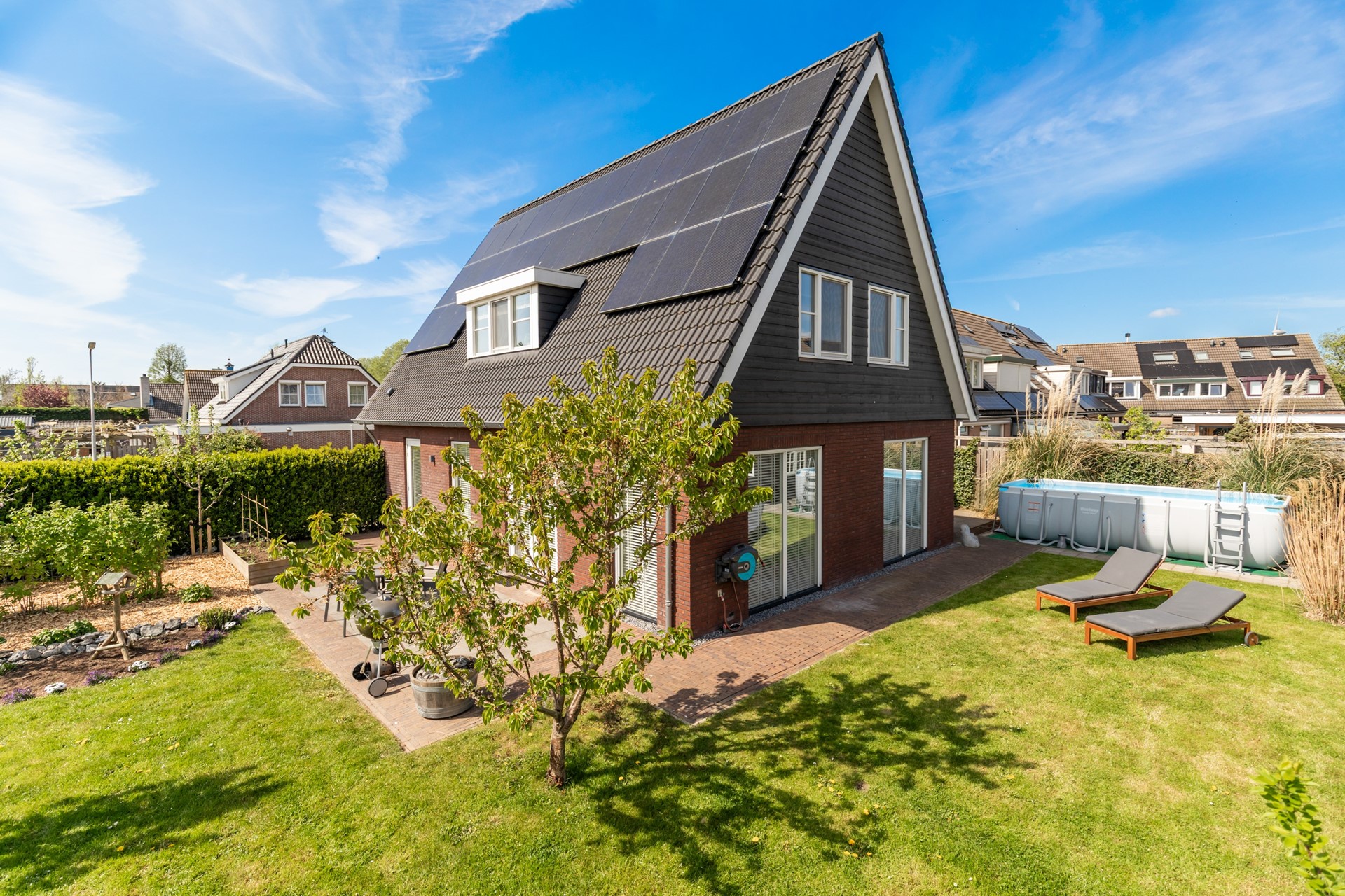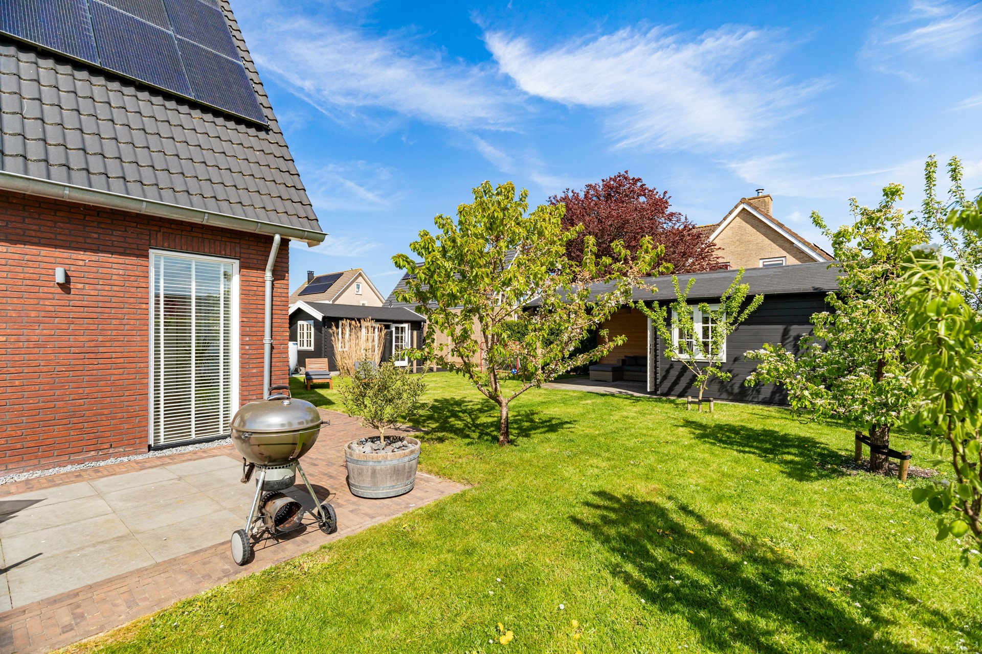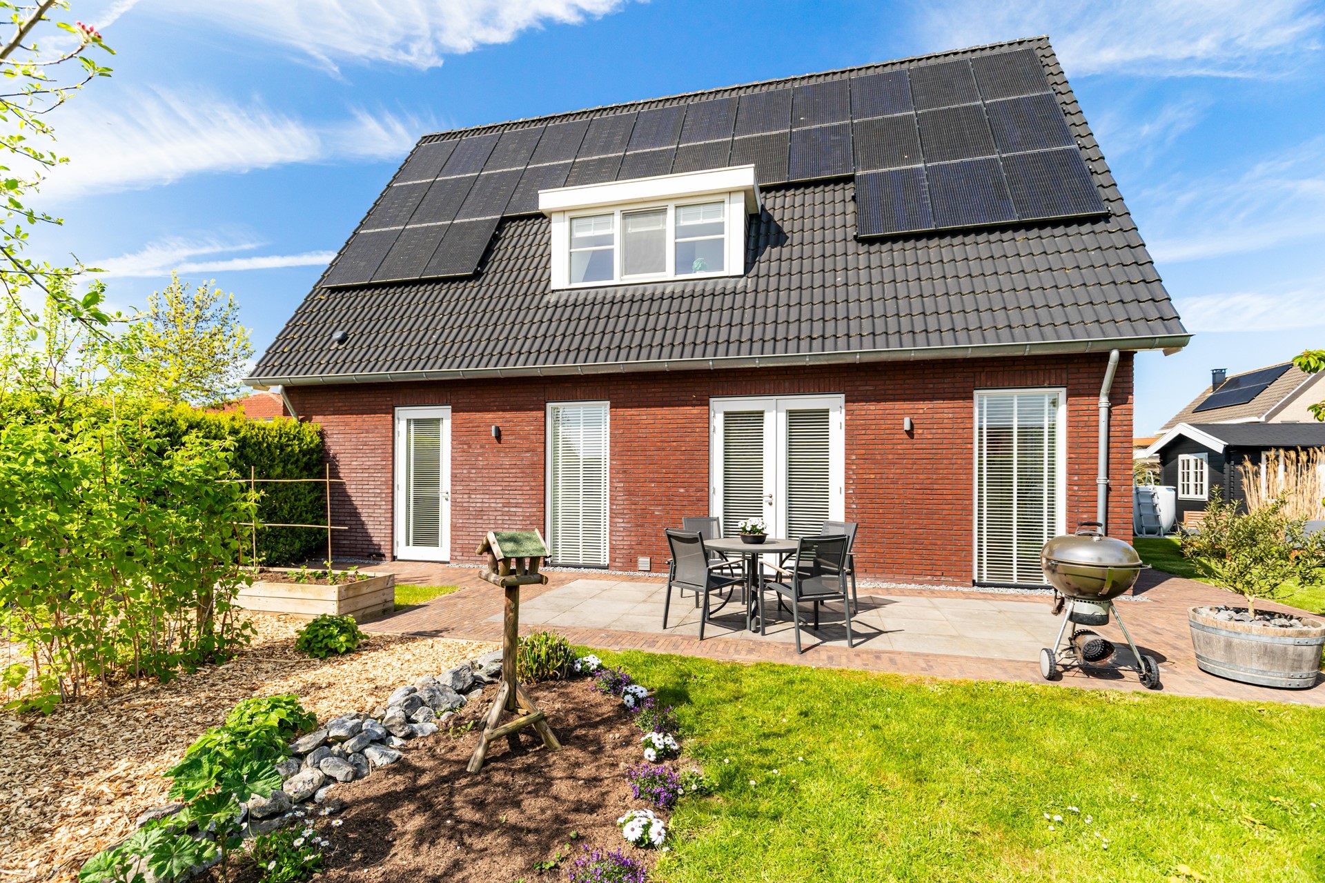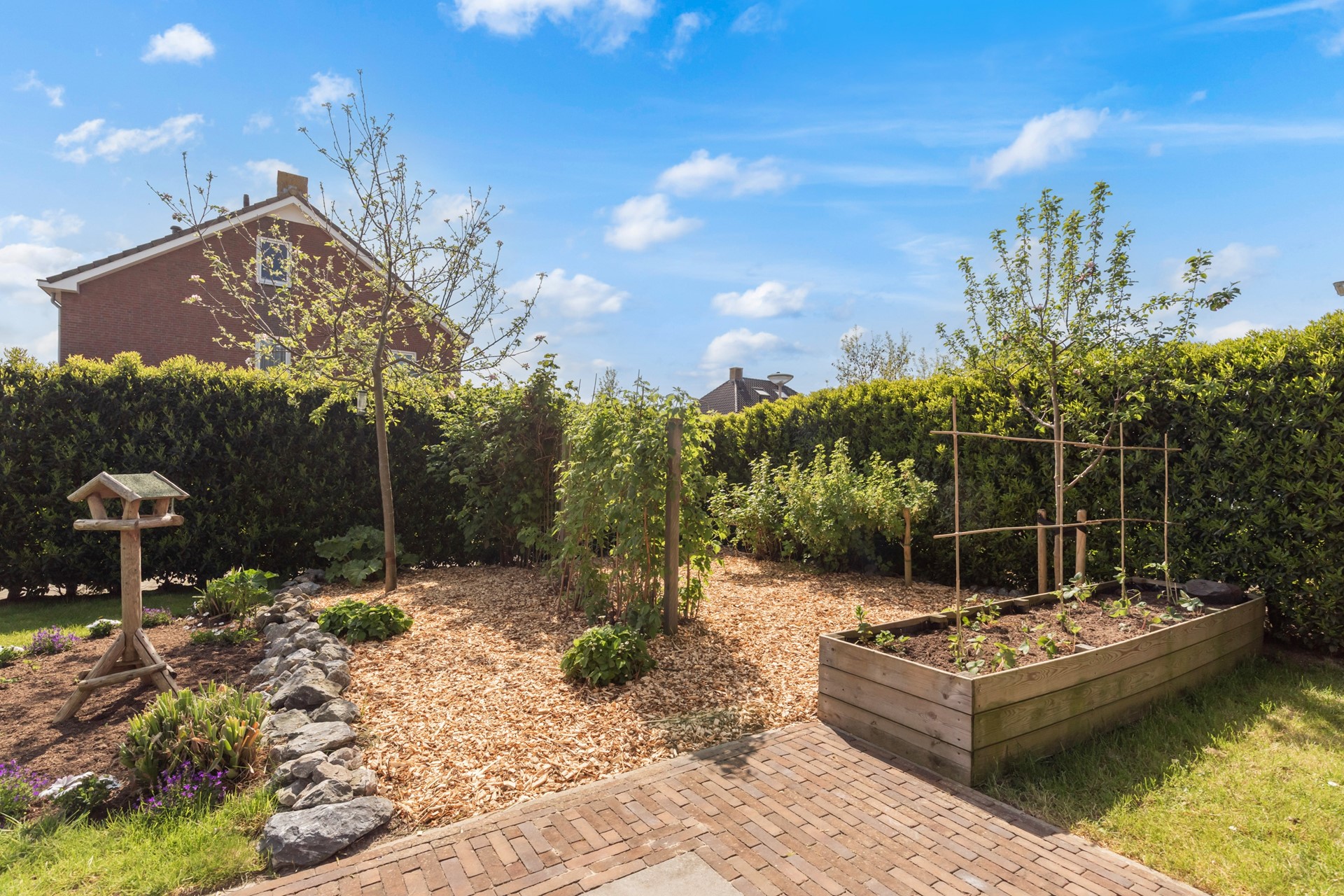 De woning beschikt over een royale tuin rondom, met een gunstige ligging op het zuiden. Hier kun je de hele dag van de zon genieten en heb je alle ruimte voor meerdere terrassen, een speelplek of juist een rustige loungehoek. Voor liefhebbers van buitenleven is dit echt een mooie toevoeging: in de tuin zijn fruitbomen en een moestuin aanwezig, waardoor je hier niet alleen geniet van de ruimte, maar ook van je eigen oogst.
