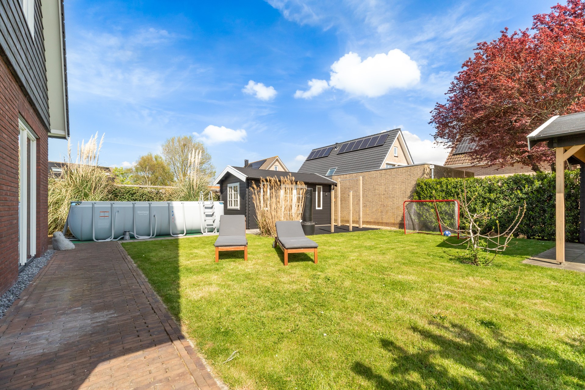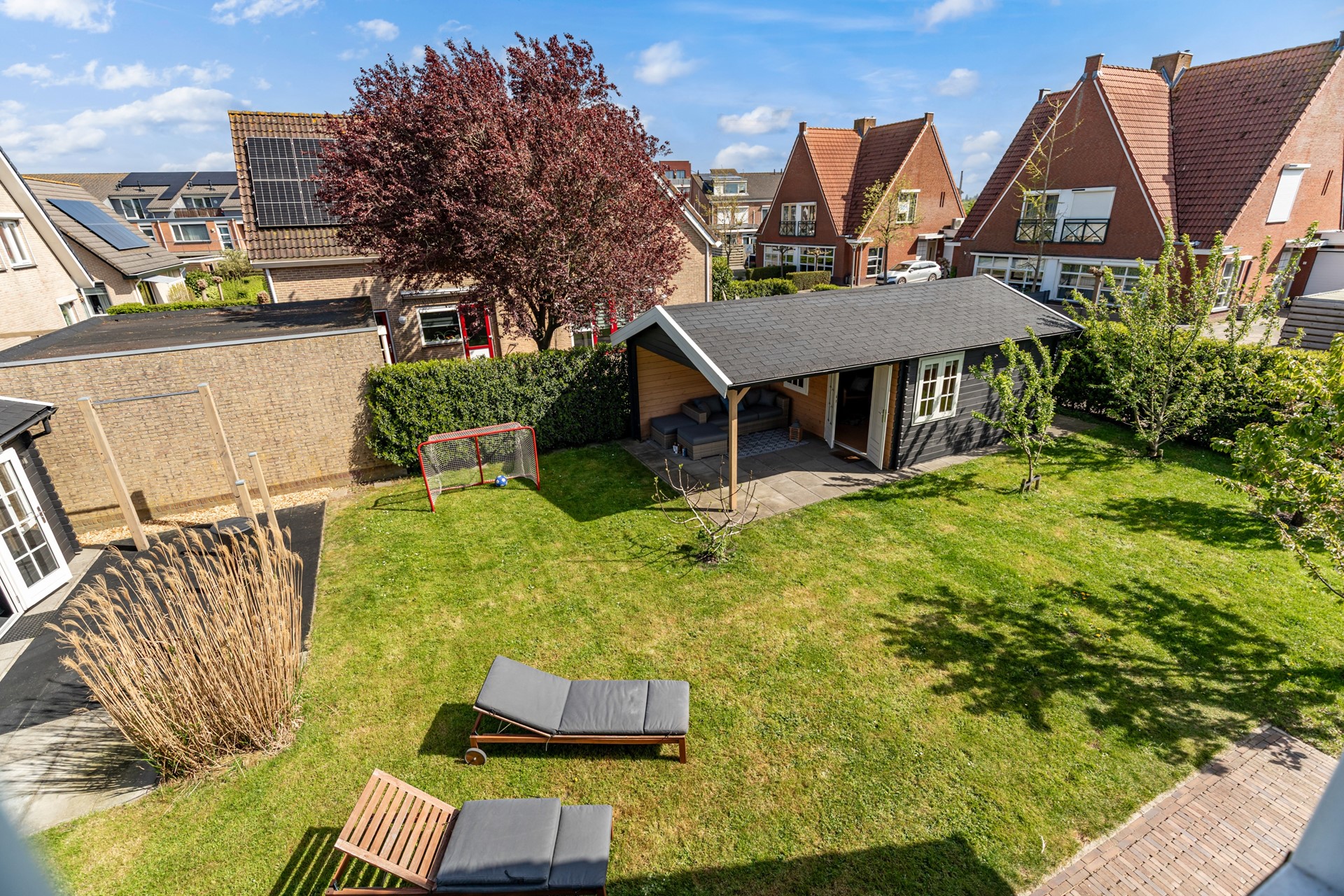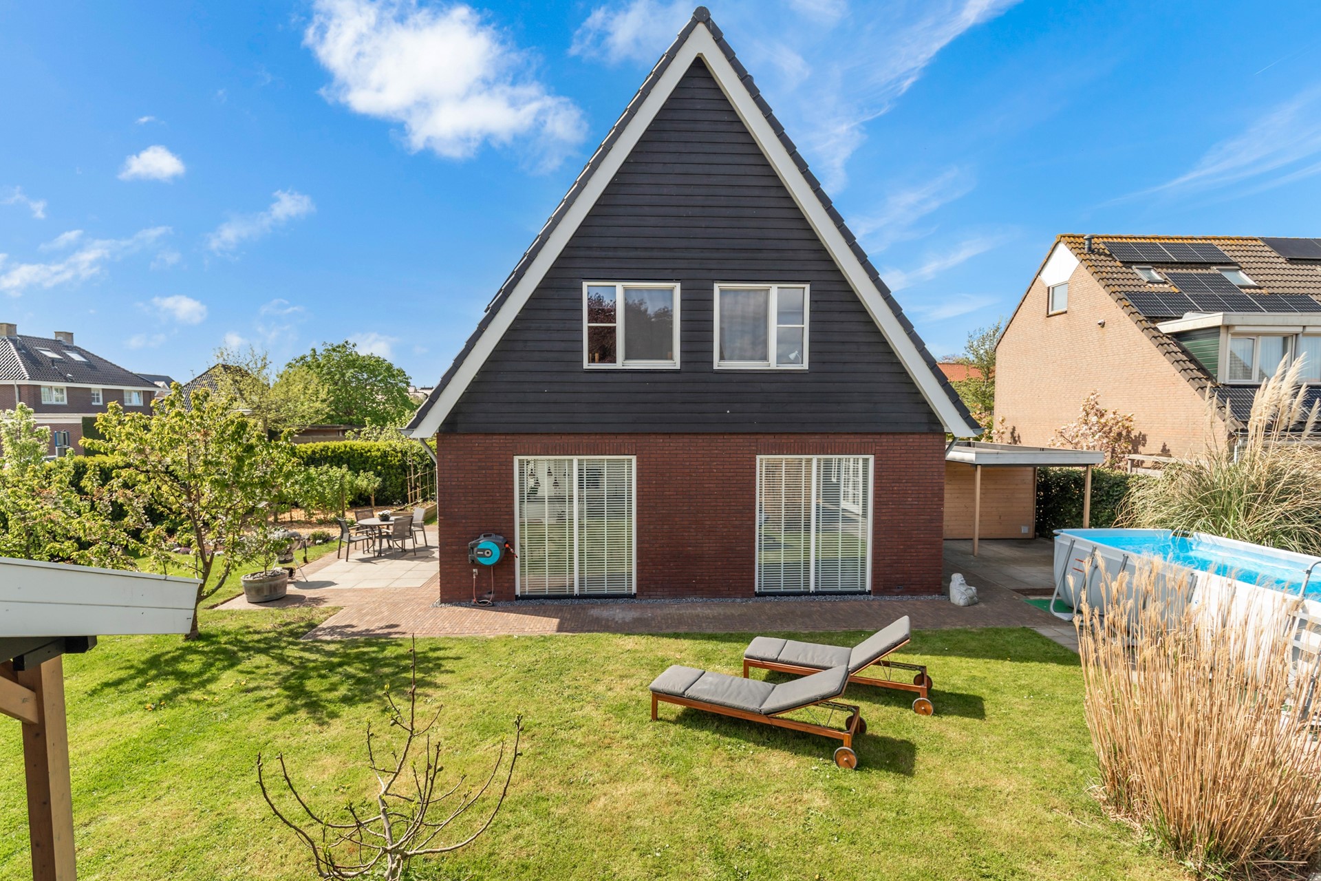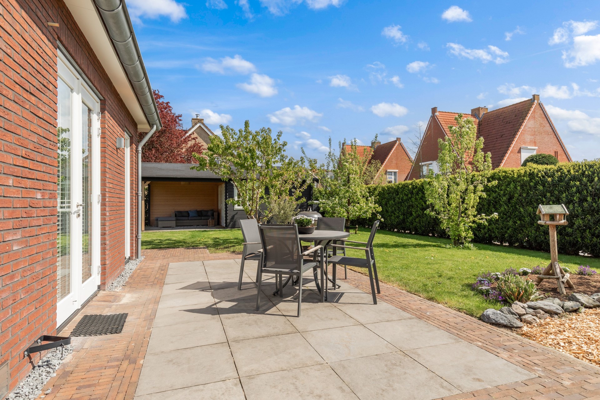 De woning beschikt over een royale tuin rondom, met een gunstige ligging op het zuiden. Hier kun je de hele dag van de zon genieten en heb je alle ruimte voor meerdere terrassen, een speelplek of juist een rustige loungehoek. Voor liefhebbers van buitenleven is dit echt een mooie toevoeging: in de tuin zijn fruitbomen en een moestuin aanwezig, waardoor je hier niet alleen geniet van de ruimte, maar ook van je eigen oogst.