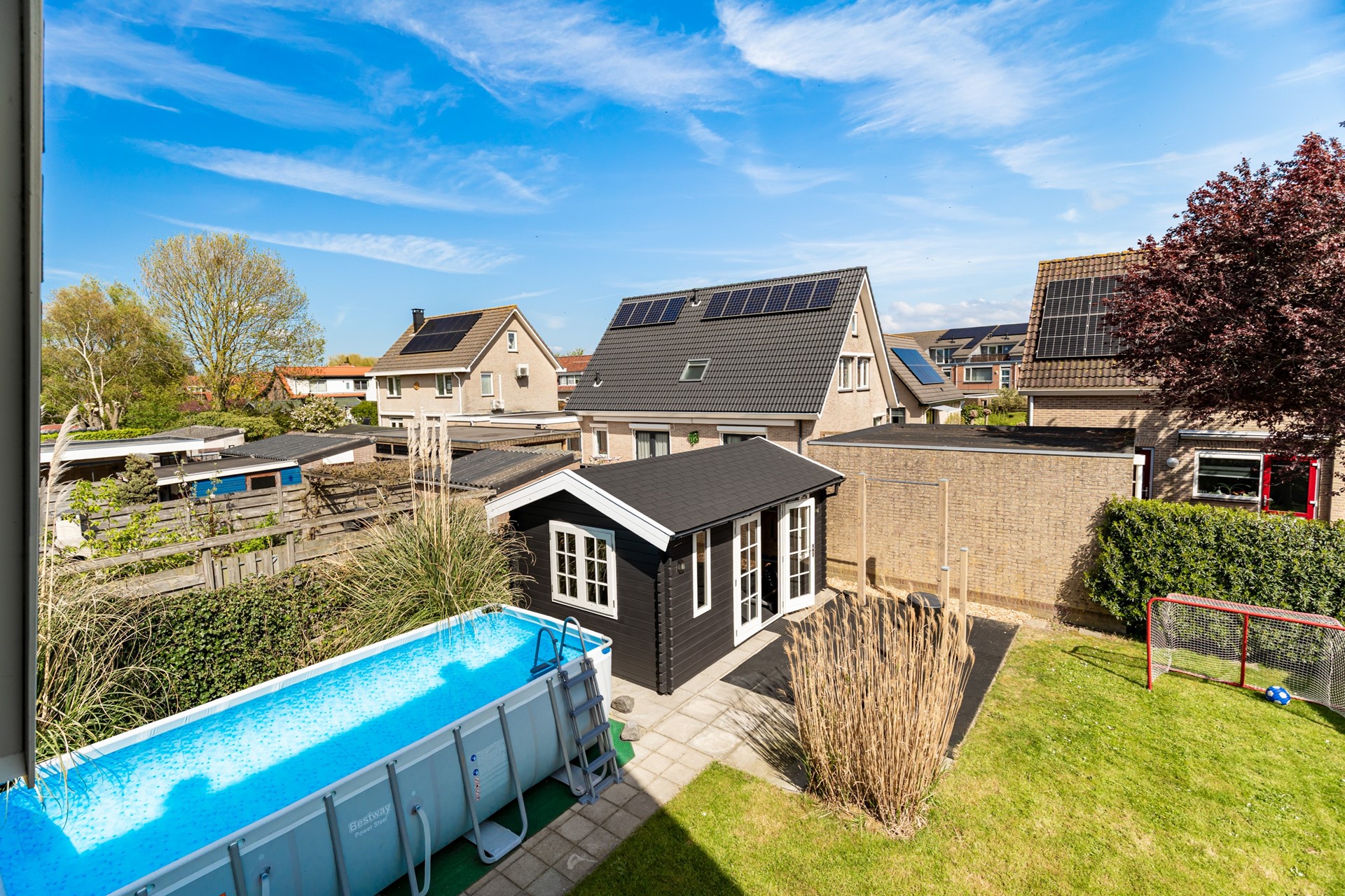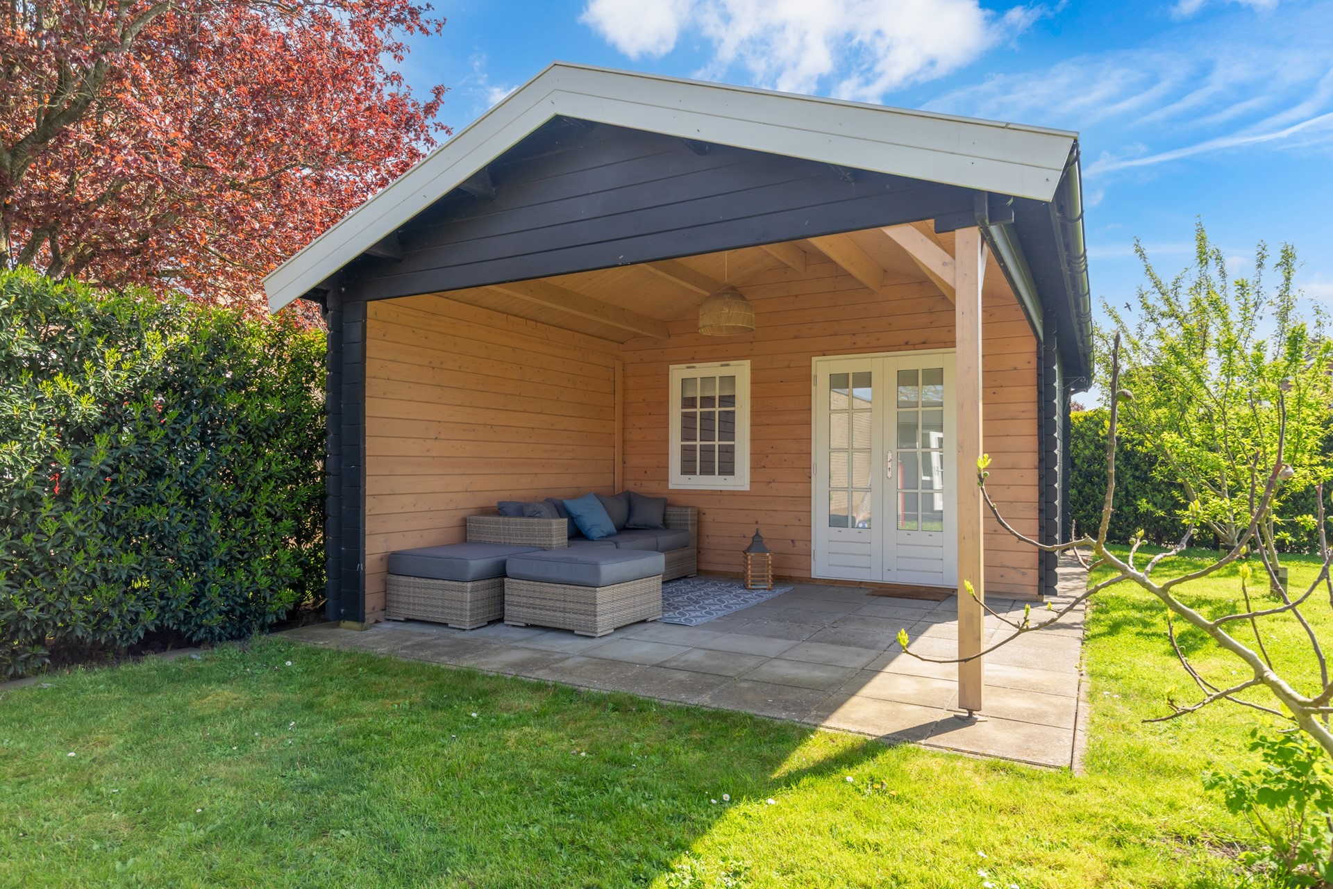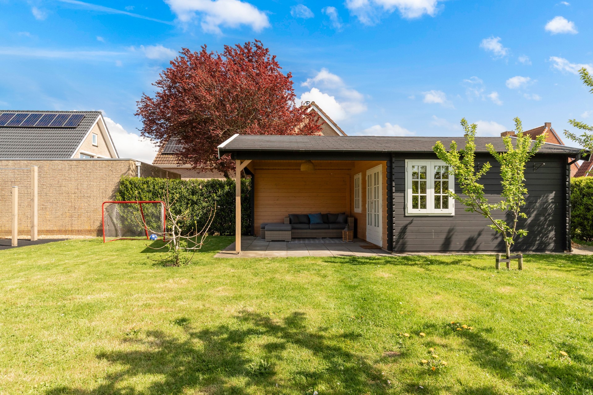 De vrijstaande houten berging biedt extra opslagruimte en parkeren kan eenvoudig op eigen terrein.