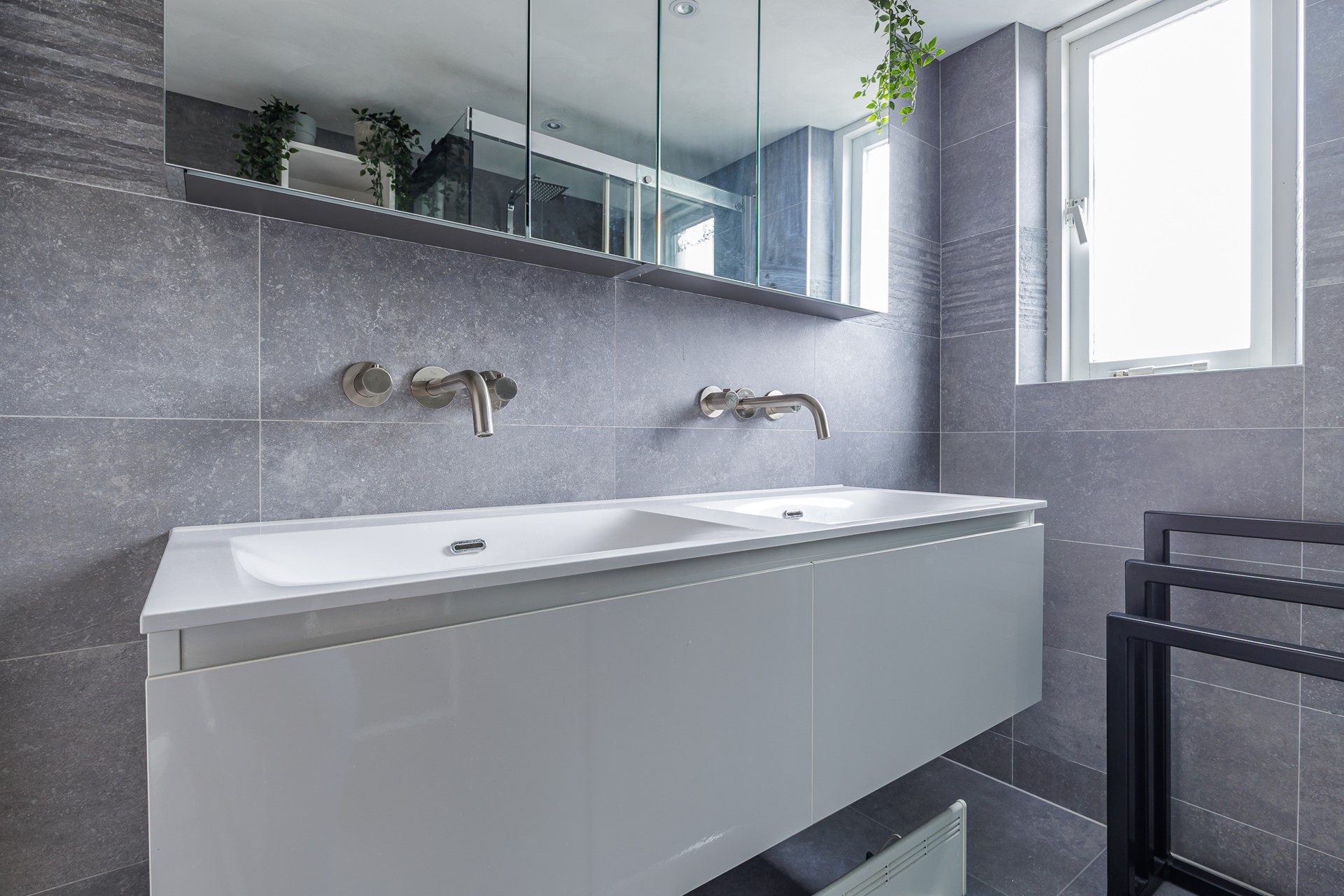 De badkamer, vernieuwd in 2019, is modern uitgevoerd en voorzien van een douche, wastafelmeubel en toilet.