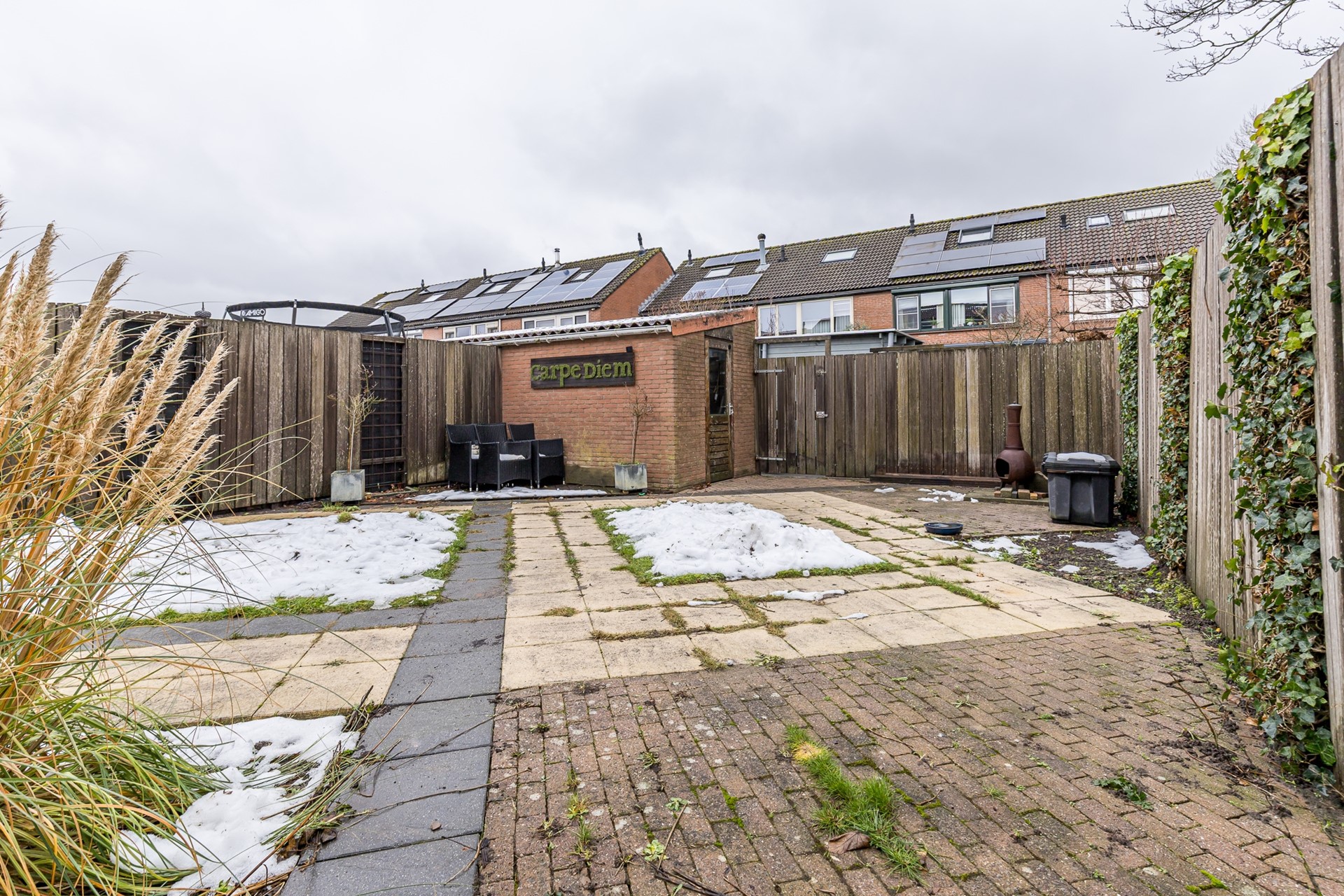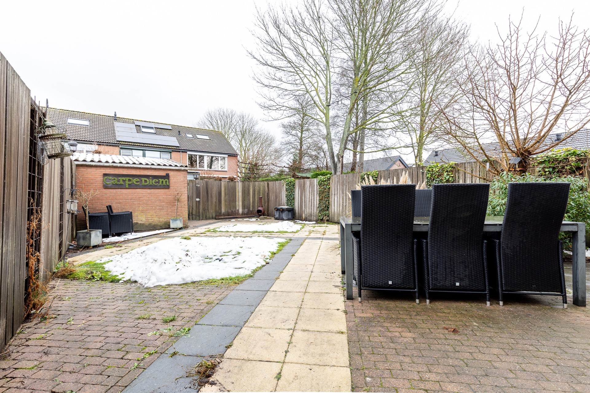 De royale achtertuin biedt volop mogelijkheden. Meerdere zitplekken, speelruimte voor kinderen en veel privacy maken dit tot een fijne buitenruimte waar binnen en buiten moeiteloos in elkaar overgaan. In de tuin staat een houten berging voor extra opslag. Daarnaast is er een berging direct aan de woning, waar de wasmachine- en drogeropstelling is geplaatst; een praktische toevoeging die het wooncomfort vergroot.