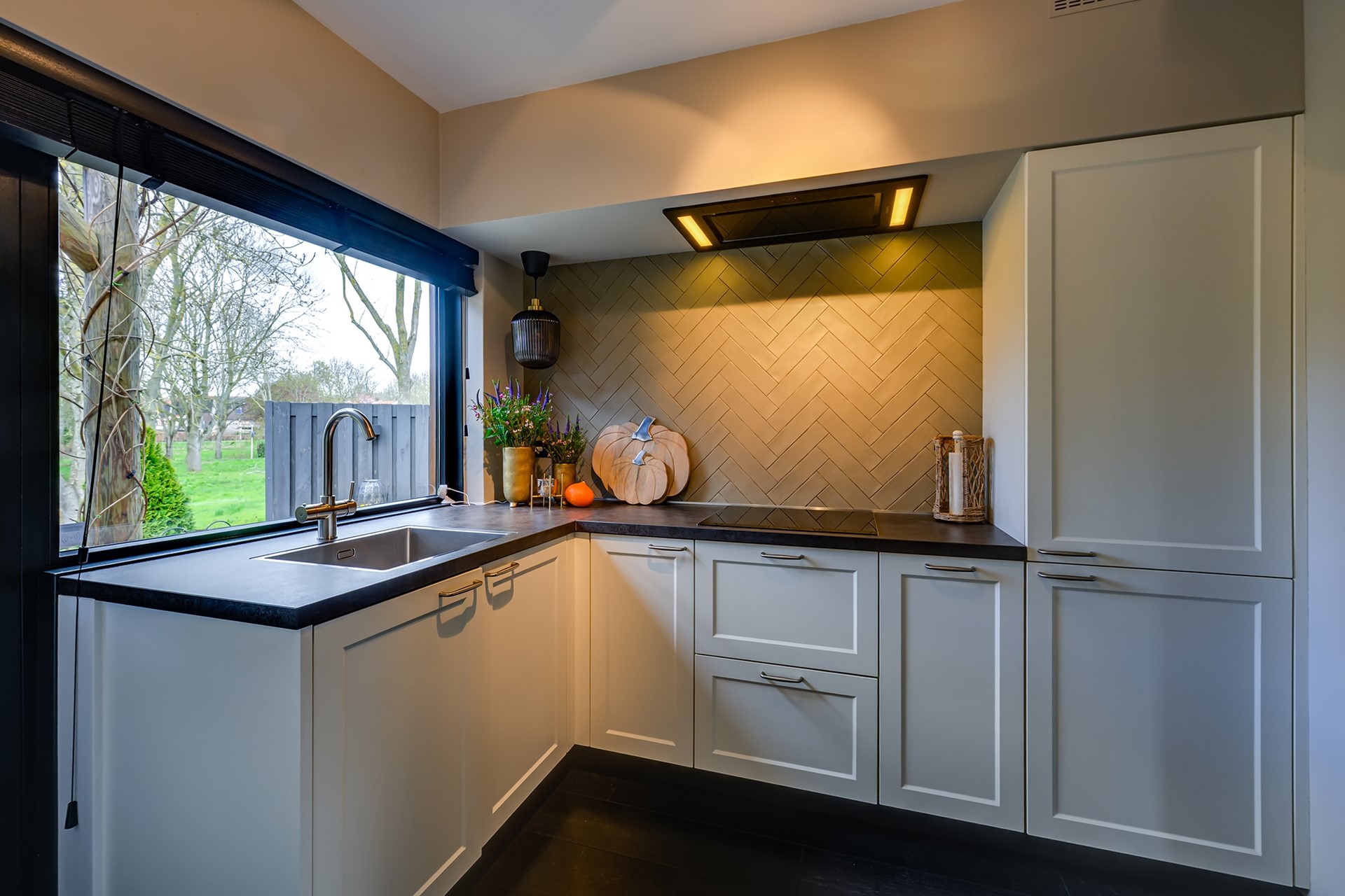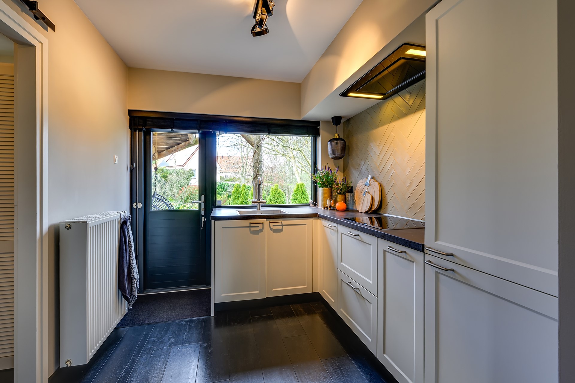 De woonkamer is uitgebouwd en heerlijk licht, met een fijne indeling en een sfeervolle houtkachel als echte eyecatcher. Vanuit hier heb je een mooi zicht op de groene omgeving en stap je zo naar buiten via de openslaande deuren naar de tuin. De open keuken met bijkeuken zorgen voor een speelse en praktische indeling. De keuken is opgesteld in een L-vorm en voorzien van alle benodigde inbouwapparatuur. Aansluitend is er de bijkeuken, hier is de vaatwasser, extra bergruimte en zijn de witgoed aansluitingen.
