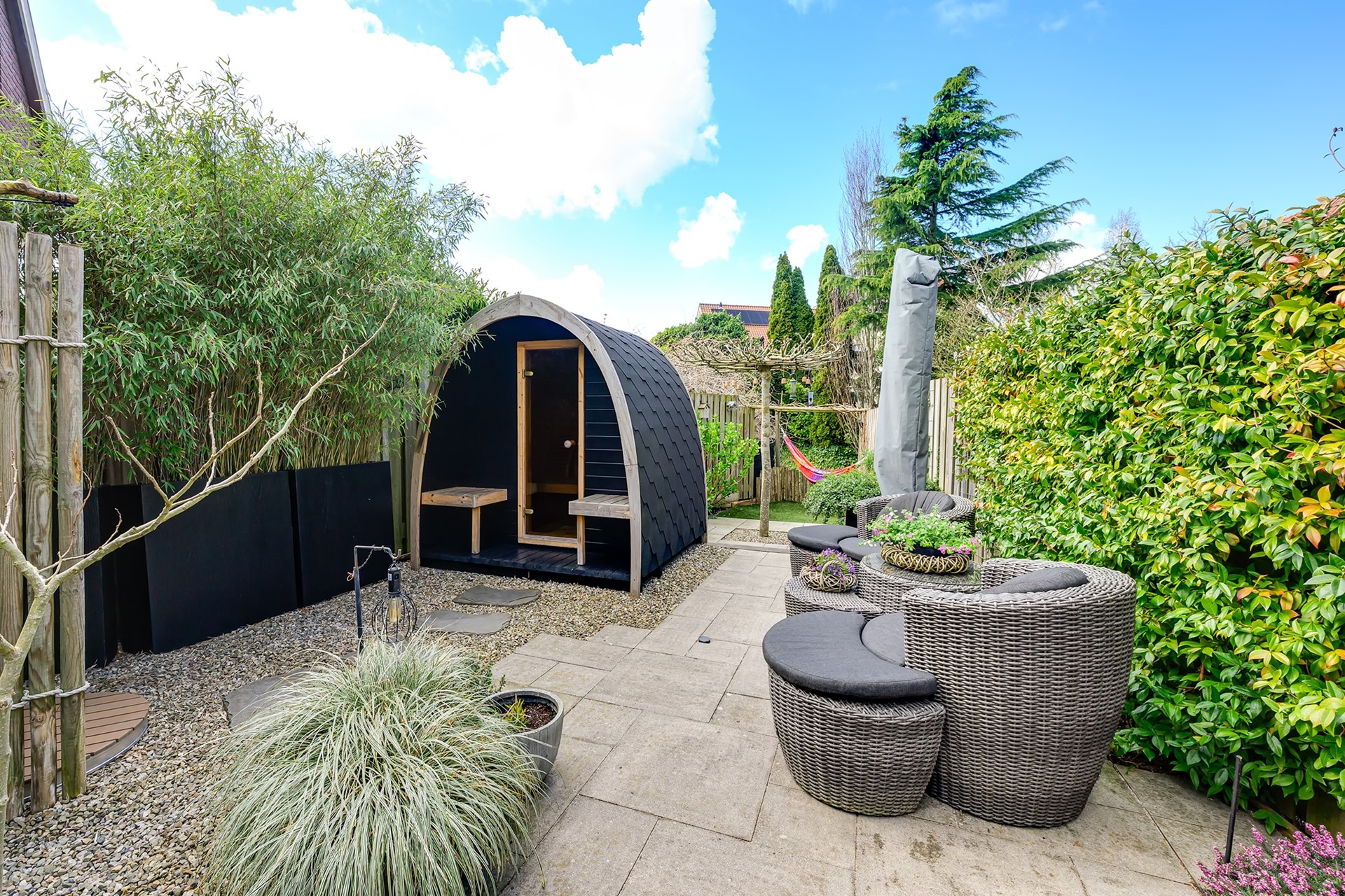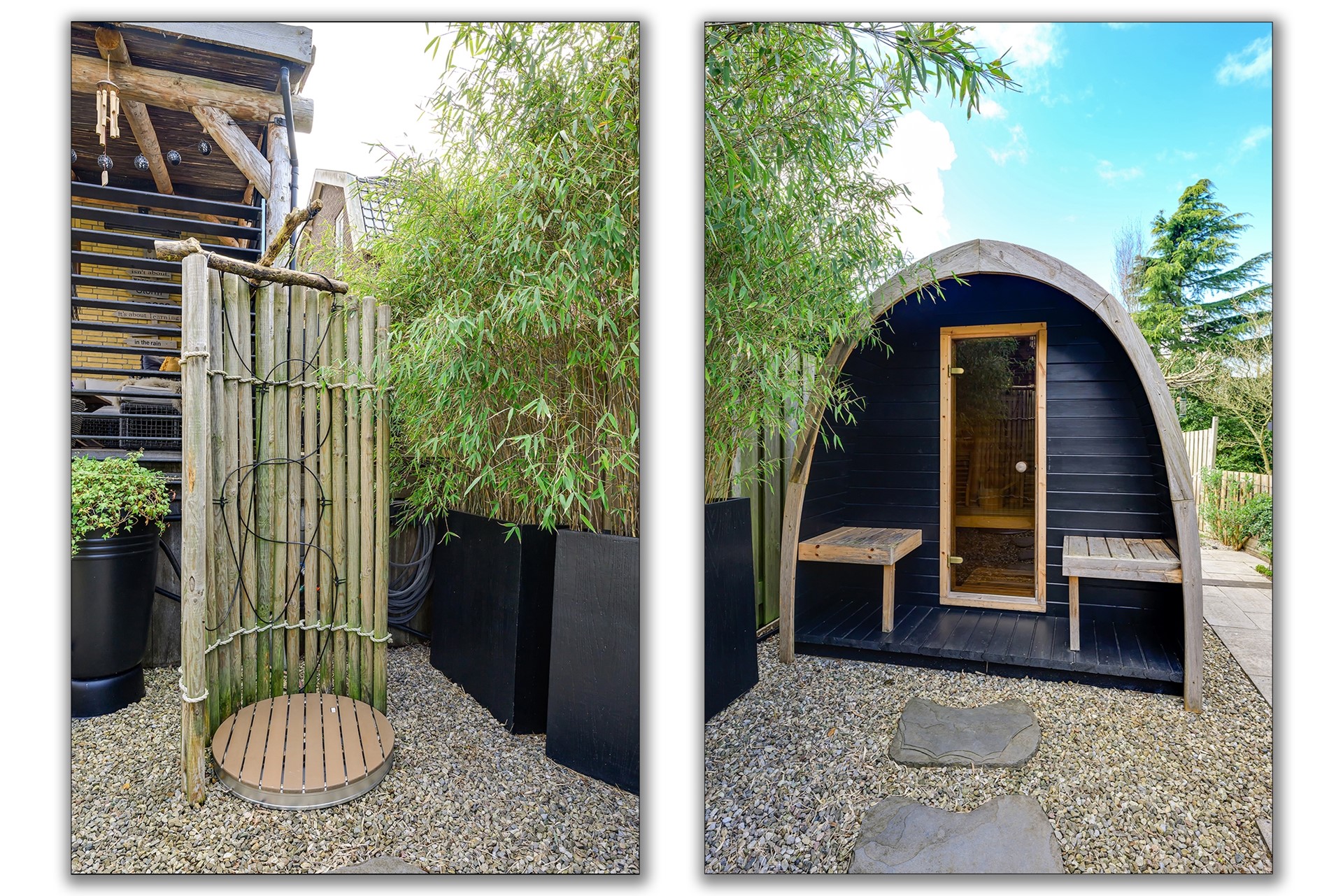 Of je nu de dag begint met een frisse douche in de buitenlucht of afsluit met een ontspannen saunamoment… hier voelt elke dag als vakantie. De tuin is fraai aangelegd met een combinatie van groen, bestrating en speelse hoogteverschillen, waardoor er altijd wel een plekje in de zon of schaduw te vinden is. De beschutte ligging zorgt bovendien voor veel privacy.
