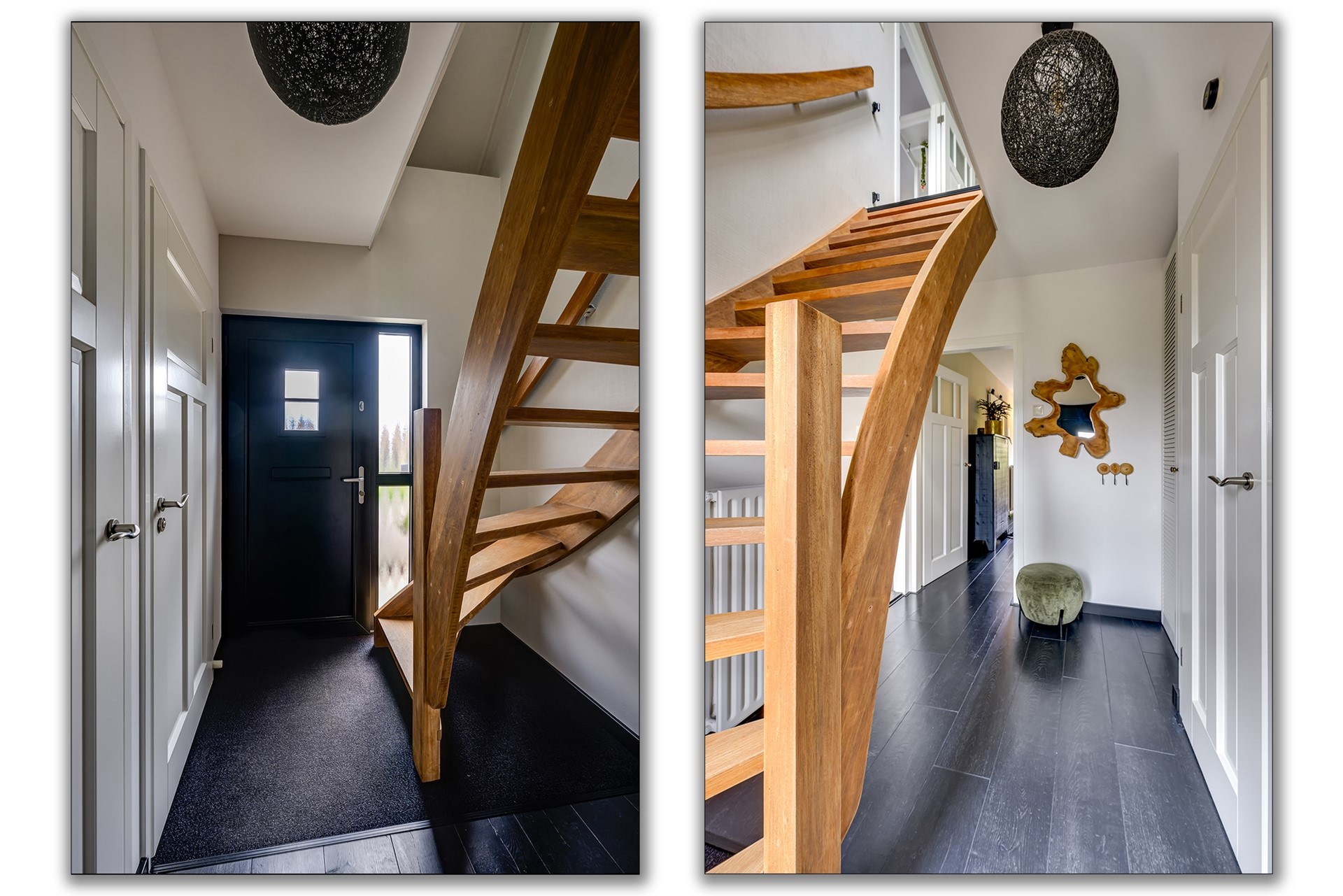 Bij aankomst valt direct de ruime opzet van de voortuin op, met parkeergelegenheid op eigen terrein en toegang tot de garage. Je komt de woning binnen in de hal met toilet, meterkast en de charmante houten trap.