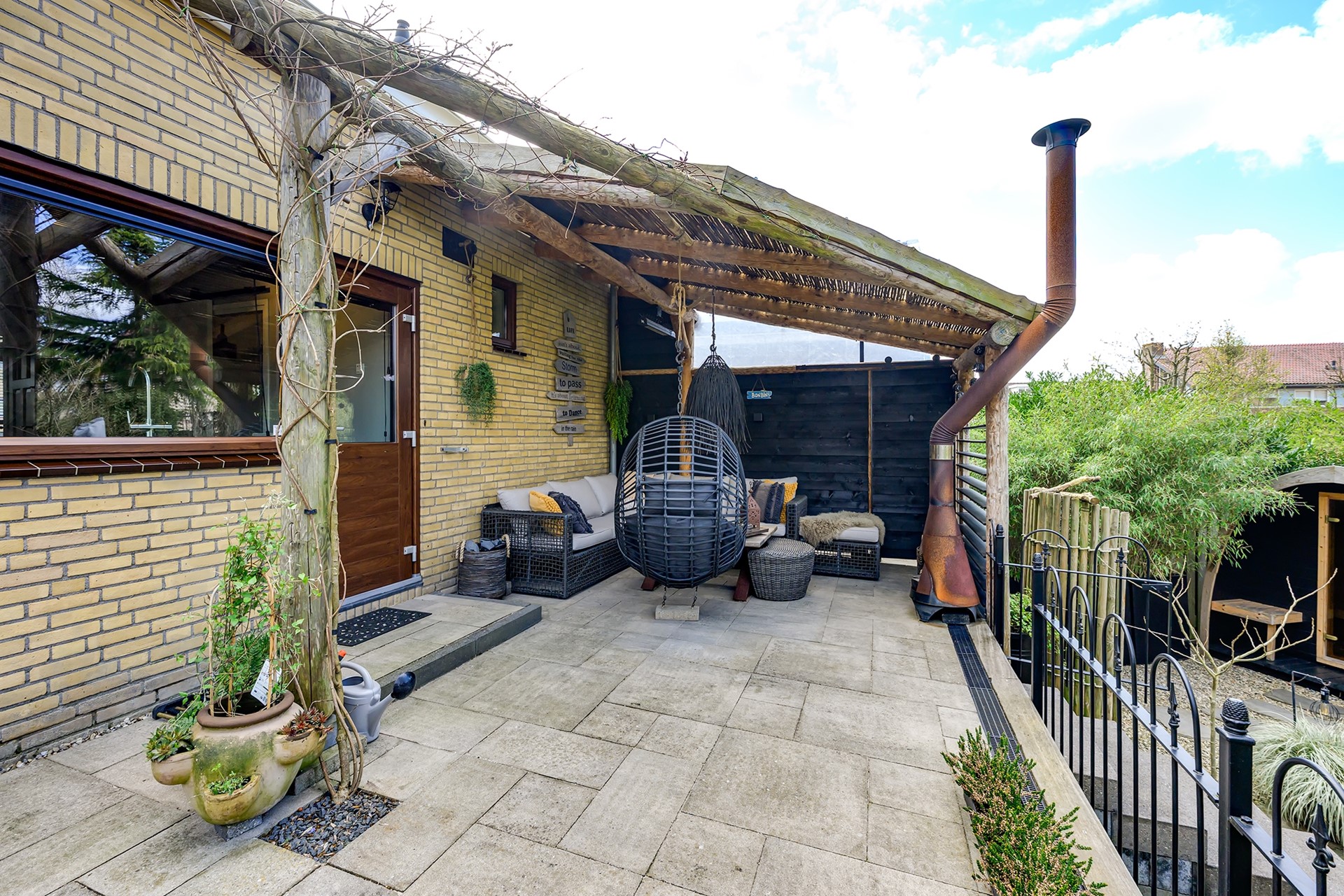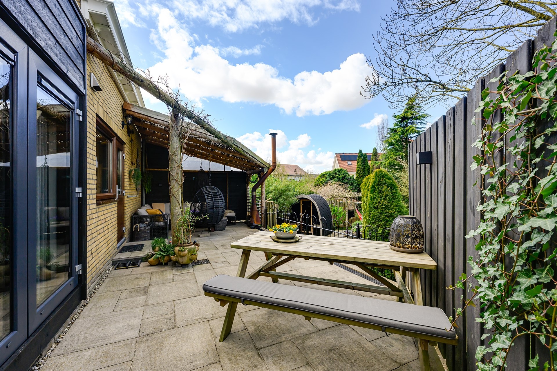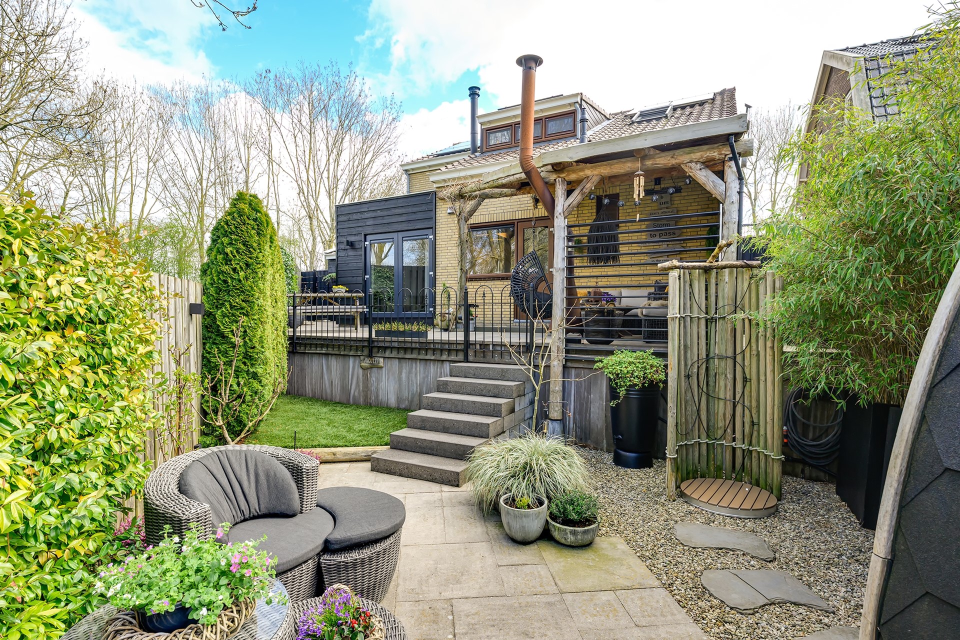 Deze tuin is echt een verlengstuk van de woning. Hier zijn meerdere sfeervolle plekken gecreëerd: een gezellige overkapping waar je tot in de late uurtjes kunt zitten bij de houtkachel, een zonnig terras omringd door groen én natuurlijk de eyecatcher: de sauna met buitendouche.