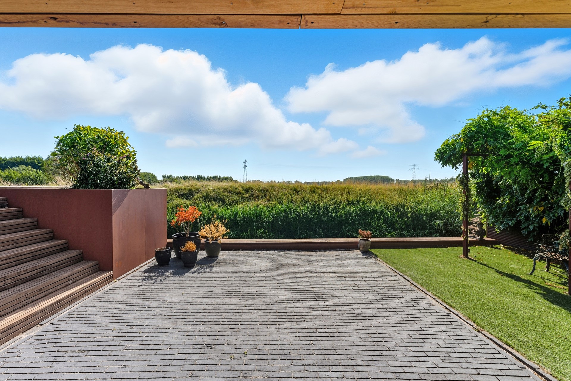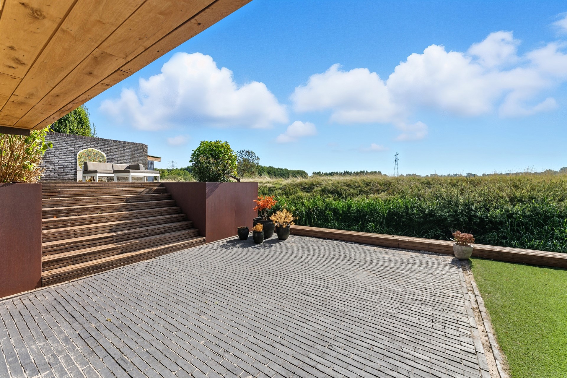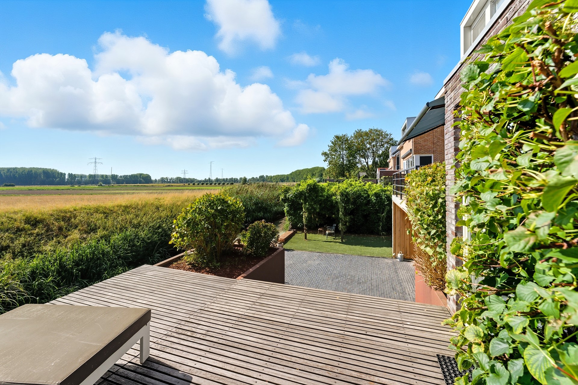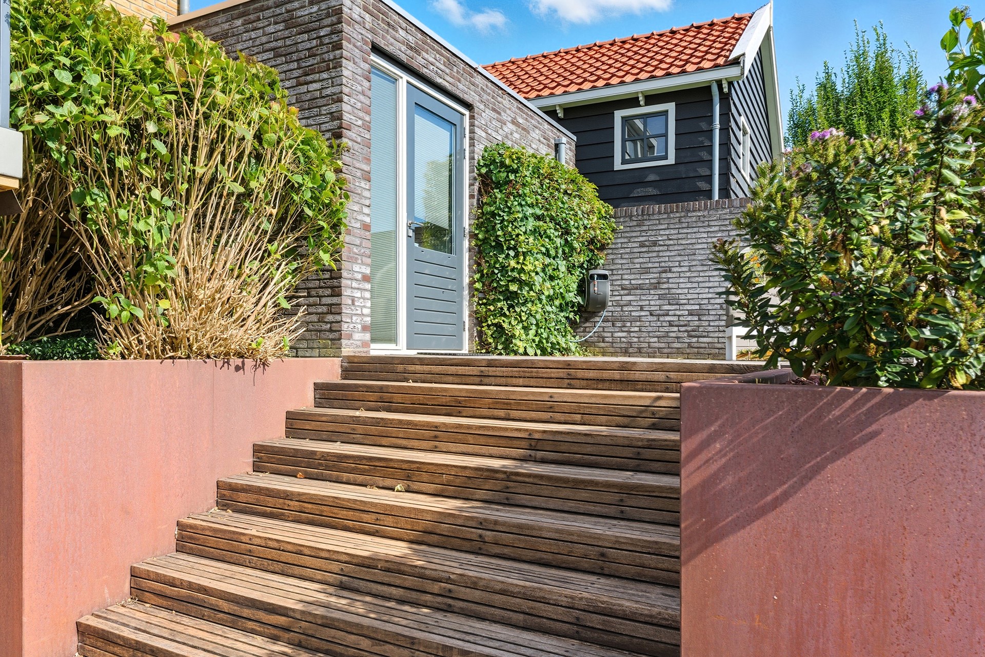 De tuin is hier écht een verlengstuk van de woning en misschien wel één van de grootste eyecatchers. Dankzij de speelse niveauverschillen, hoogwaardige materialen en strakke lijnen heeft de tuin een luxe, moderne uitstraling. Je geniet hier volop van rust, privacy én een fenomenaal vrij uitzicht over de polder en het water, een uitzicht dat elk seizoen blijft verrassen. Door de ligging op het zuiden is de tuin heerlijk zonnig.