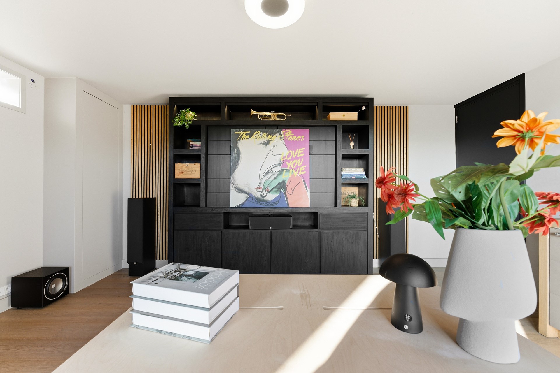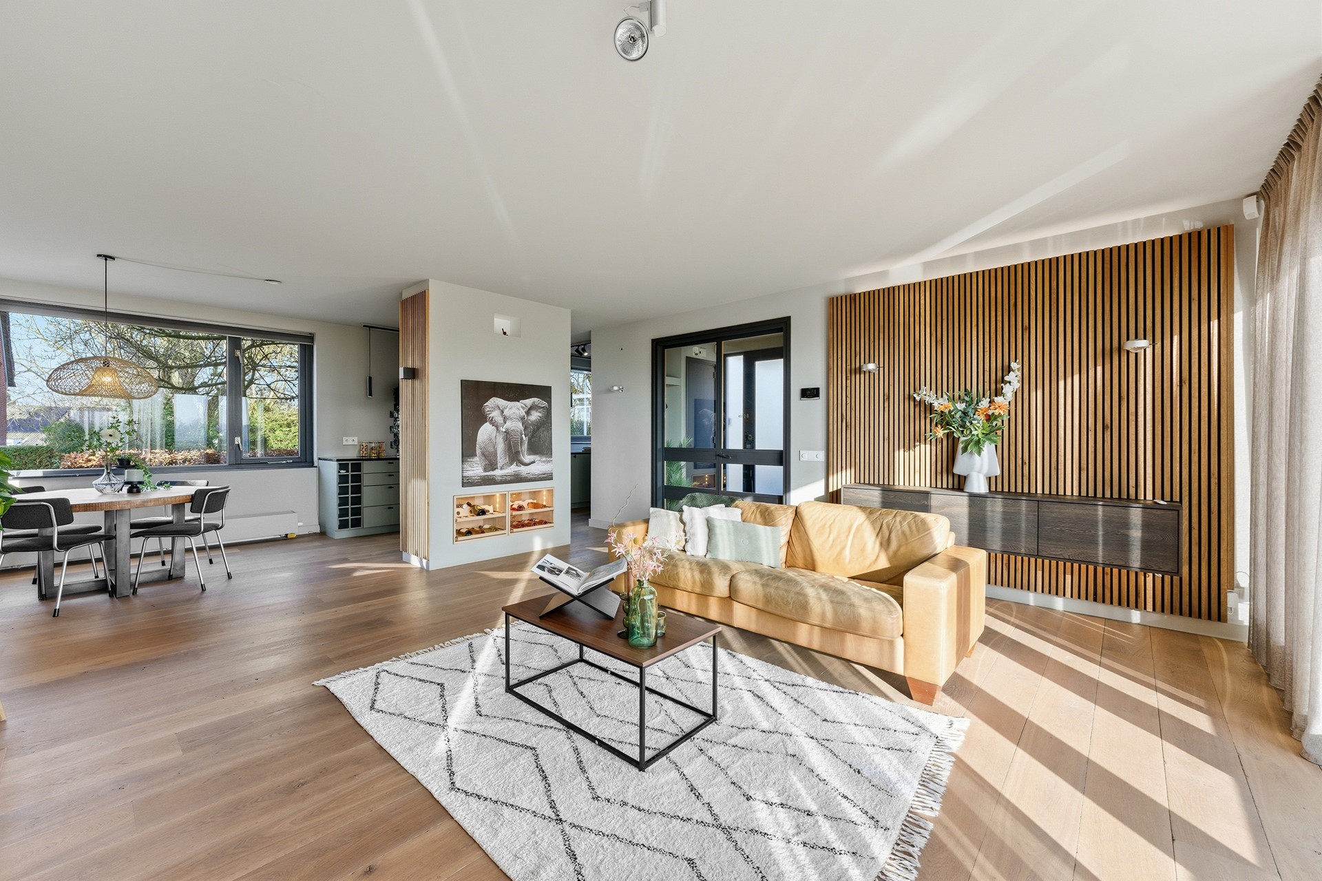 3. Prachtige woonkamer met cinewall, gashaard, wijnkasten en openslaande deuren naar het terras met geweldig uitzicht