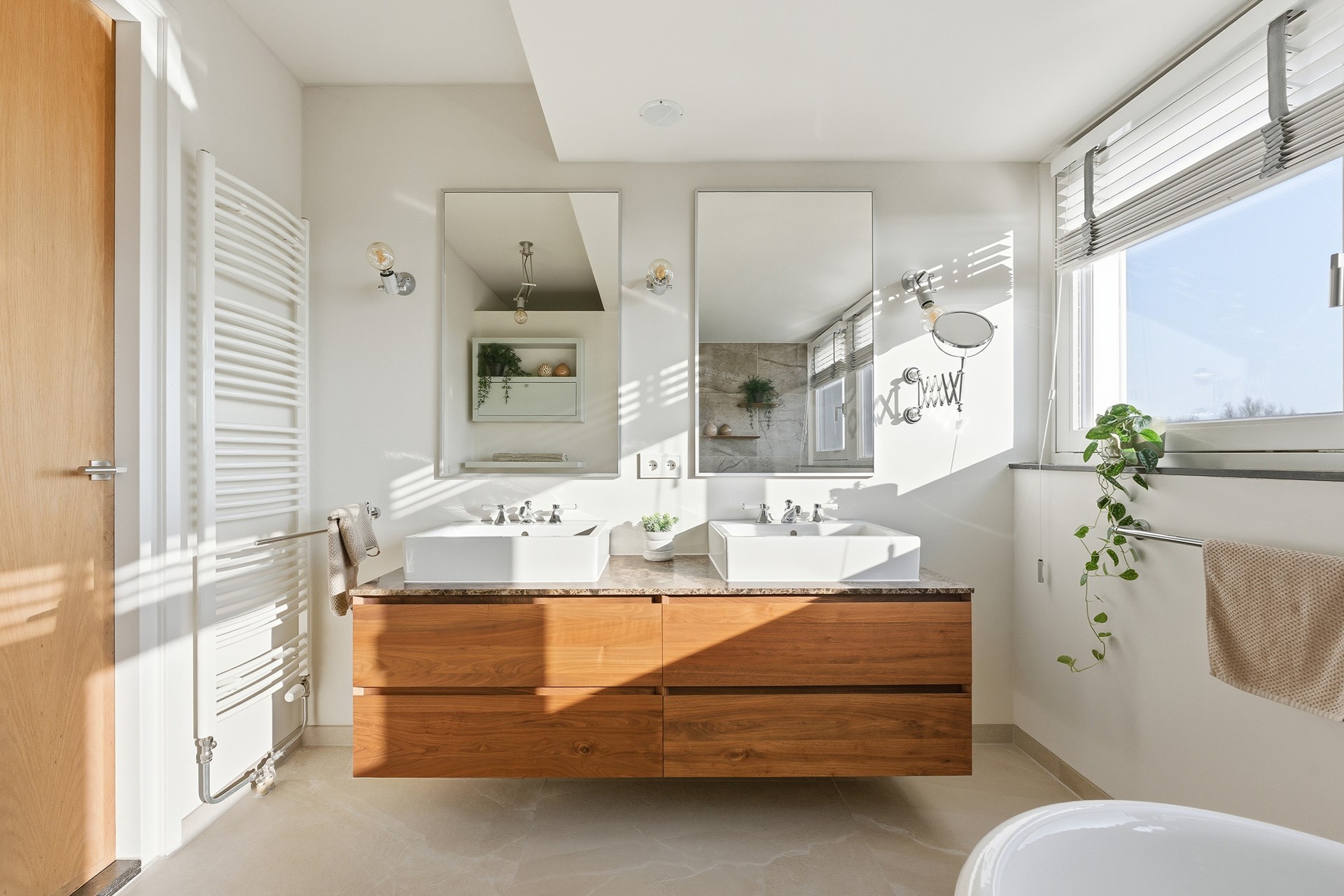 7. Charmante en luxe badkamer met dubbele wastafel, inloopdouche en vrijstaand bad