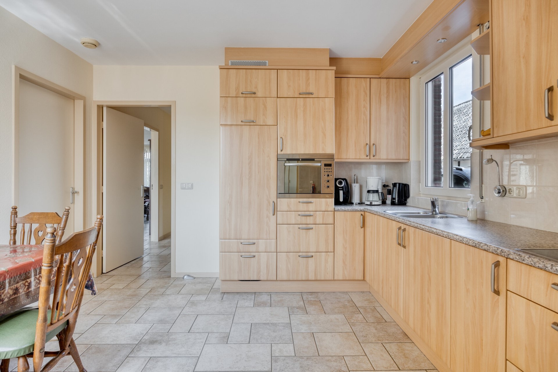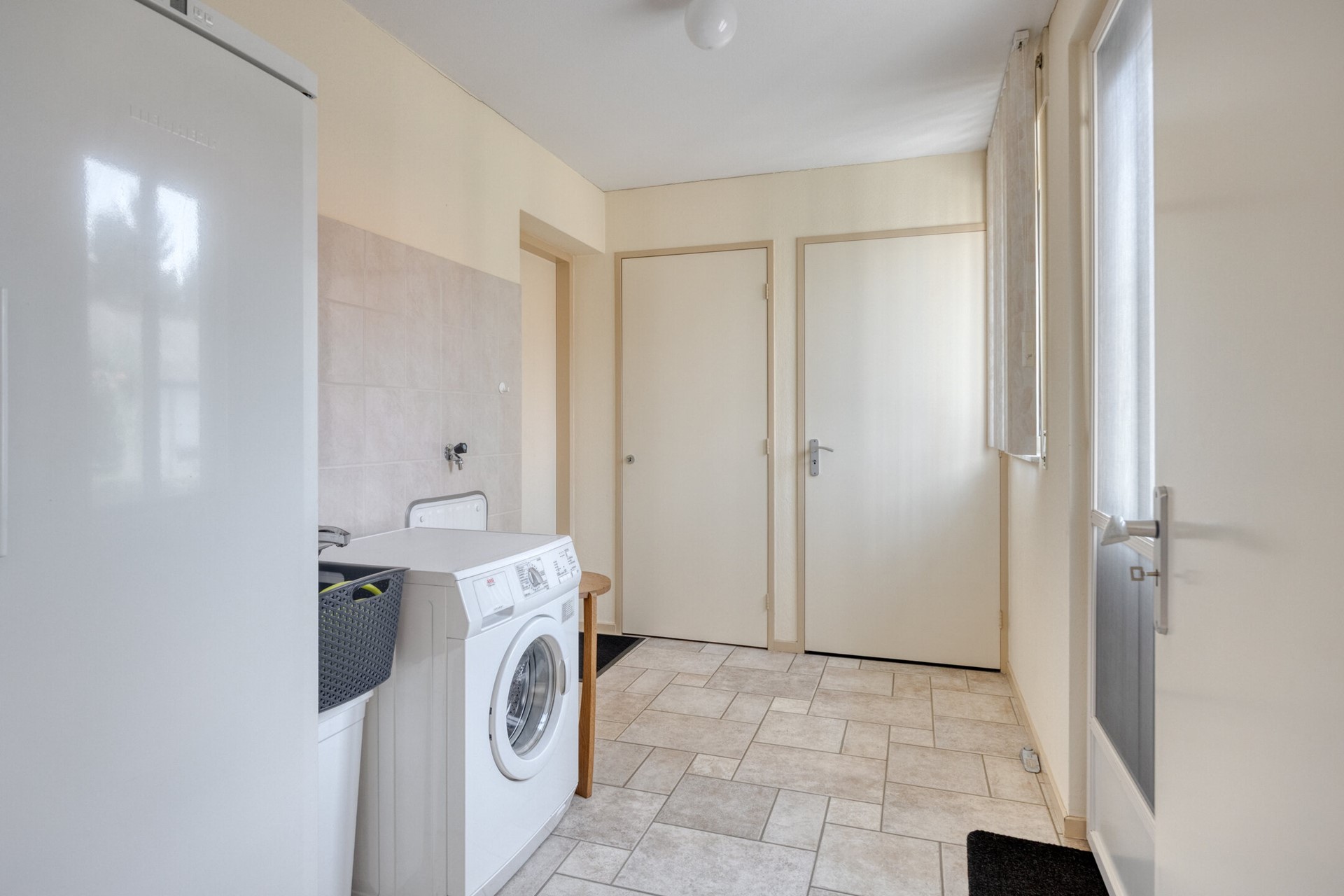 De fraaie woonkamer is ruim van opzet (ca. 40 m²) en heeft veel lichtinval door de grote raampartij aan de voorzijde, een raam in de zijgevel en de schuifpui aan de achterzijde naar het overdekt terras. De keuken (ca. 13 m²) beschikt eveneens over veel lichtinval door de aanwezige ramen met zicht op de oprit en de achtertuin. De keuken beschikt over een keurige keukenopstelling met apparatuur (keramische kookplaat, afzuigkap, combimagnetron, koelkast) en voldoende werk- en kastruimte. In de praktische bijkeuken bevinden zich de witgoedaansluitingen en een handige bergkast. De slaapkamer (ca. 12 m²) is gelegen aan de voorzijde van de woning. De badkamer is voorzien van een ligbad, aparte douche en een vaste wastafel met wandmeubel. Het gehele woongedeelte op de begane grond is voorzien van een doorlopende tegelvloer met vloerverwarming.