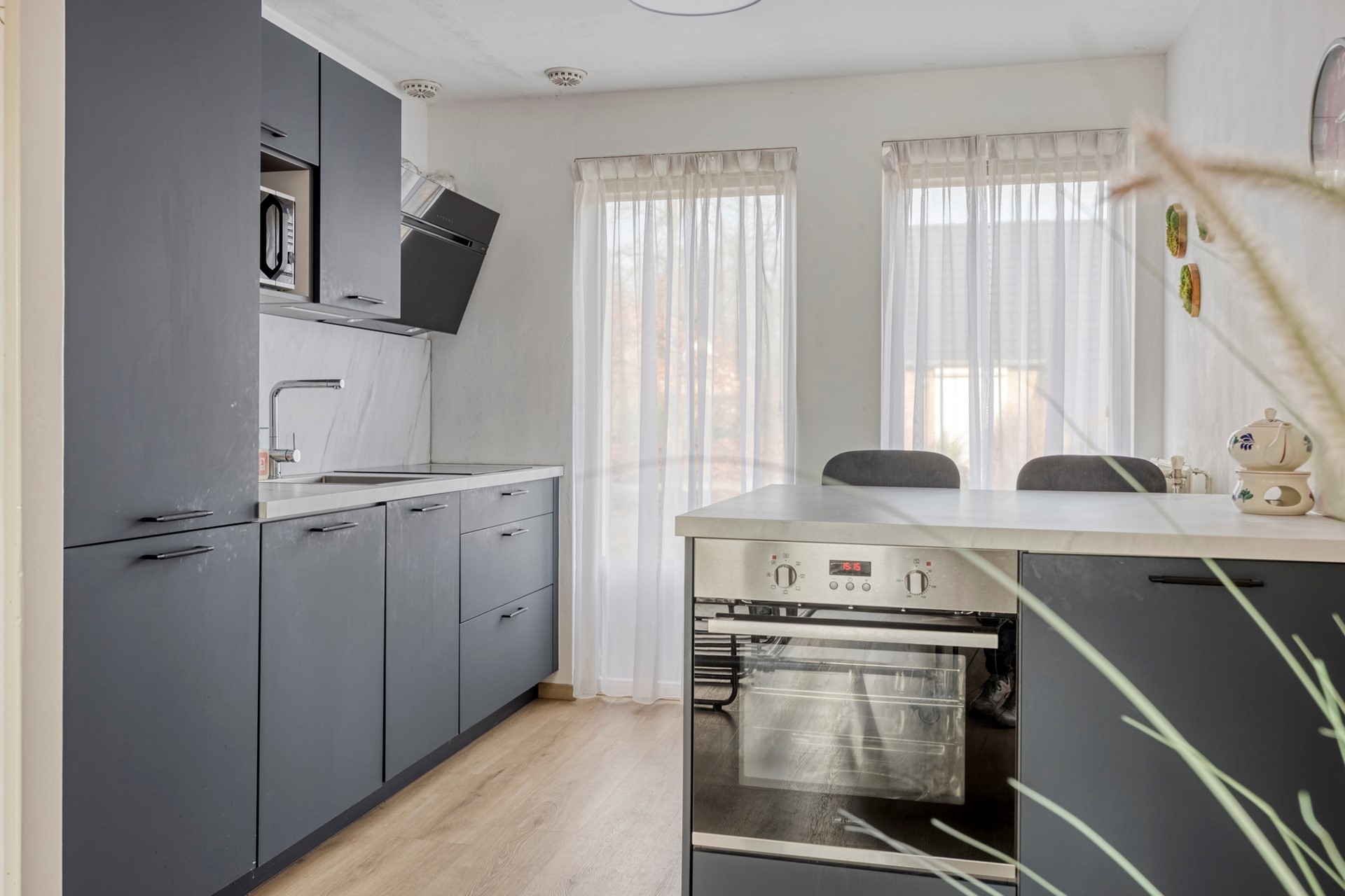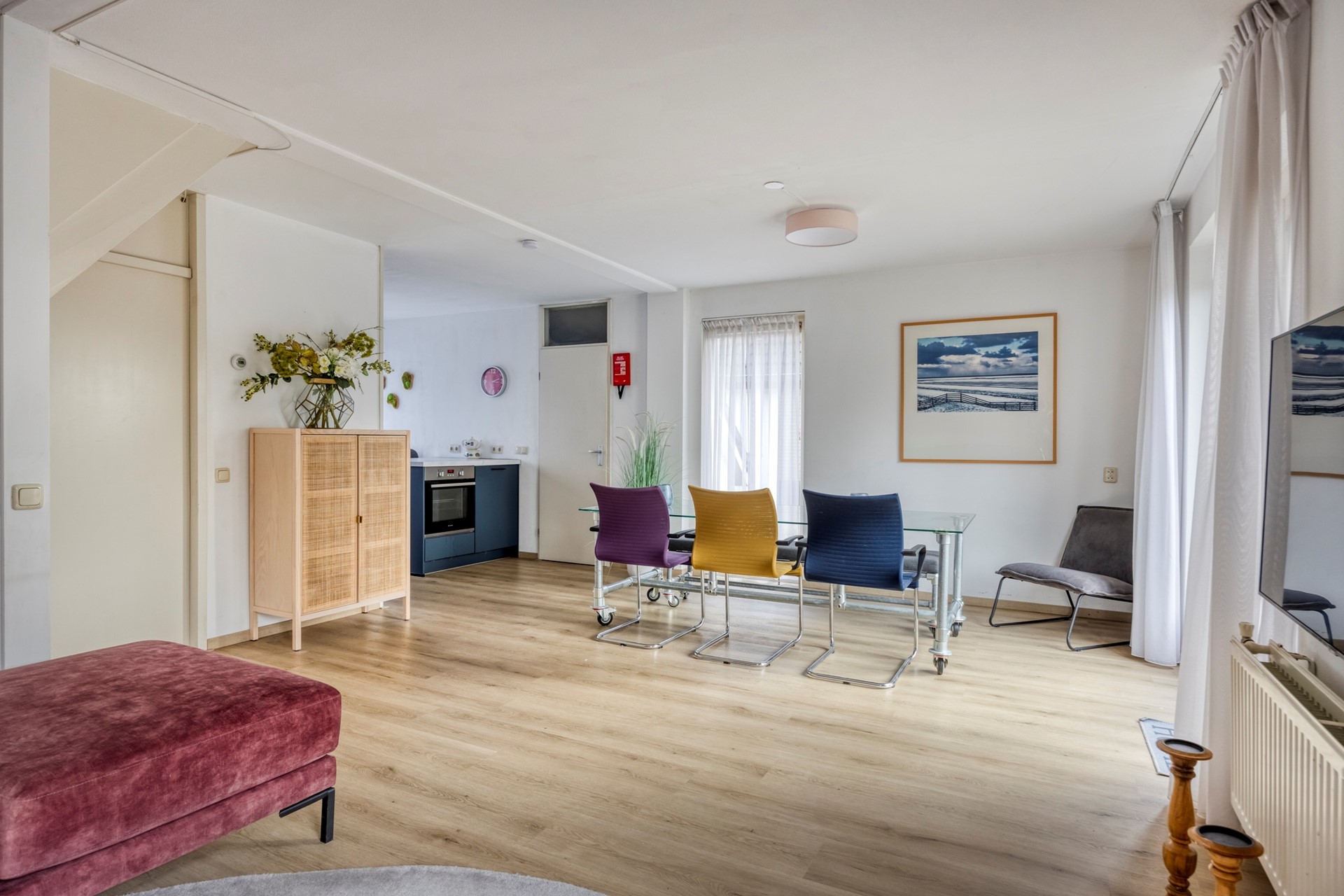 De woonkamer is ruim van opzet, voorzien van een laminaatvloer en openslaande deuren naar het terras. De open keuken is eveneens voorzien van een laminaatvloer en een moderne keukenopstelling met apparatuur (inductiekookplaat, afzuigkap, oven, magnetron, oven, vaatwasser, koelkast, diepvries) en voldoende werk- en kastruimte. In de praktische berging bevinden zich de witgoedaansluitingen, de c.v.-opstelling en een buitendeur.