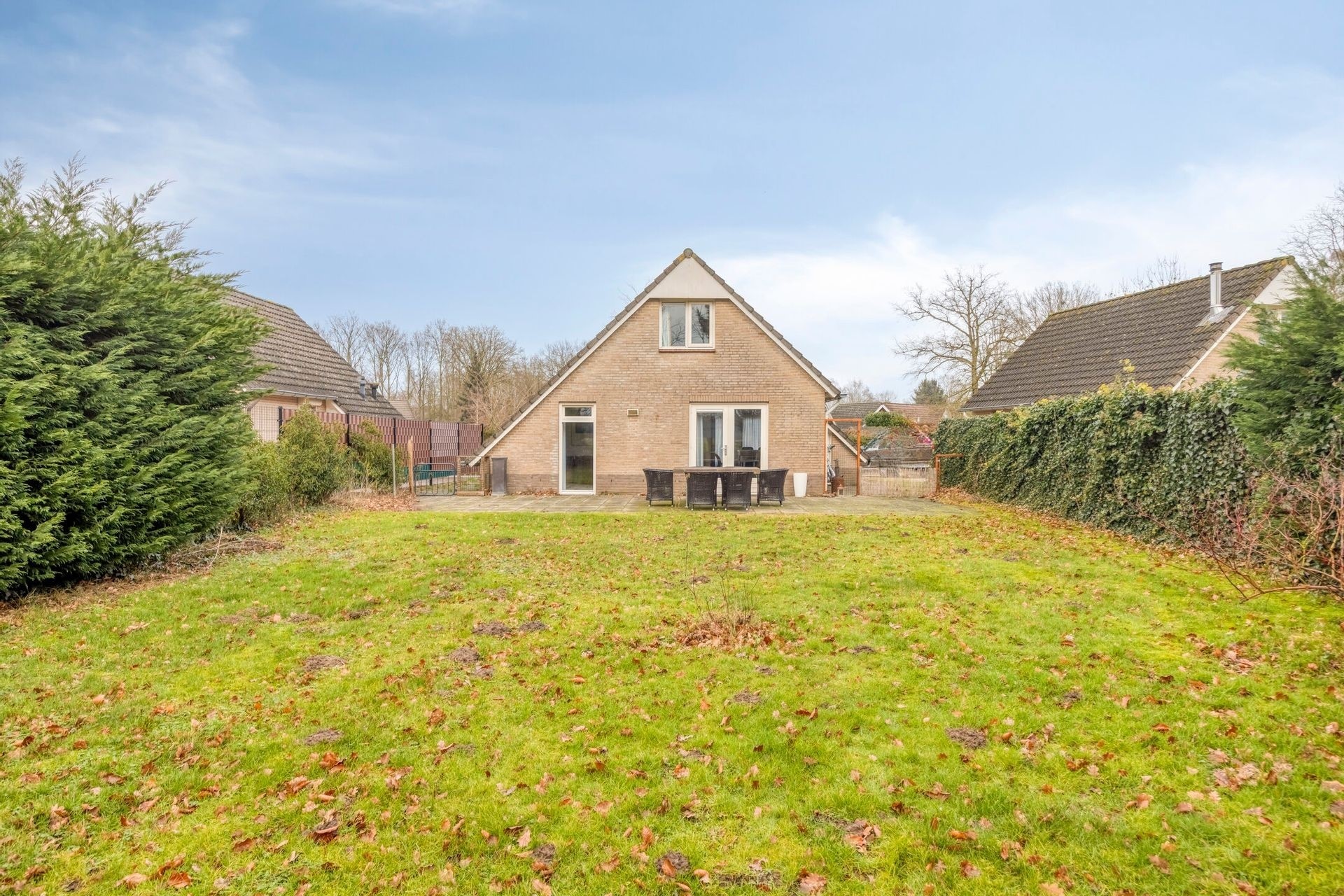 De recreatiebungalow is gelegen op een fijn perceel van ca. 568 m². De oprit biedt parkeergelegenheid op eigen terrein en geeft toegang tot de woning en de achtertuin. De achtertuin biedt veel privacy en een prachtig uitzicht over de achtergelegen landerijen en bos en vanuit de tuin kun je zo het bos in wandelen. De tuin is voorzien van een terras, gazon en beplanting. In deze fijne tuin kun je genieten van het buitenleven en heerlijk ontspannen in de zon.