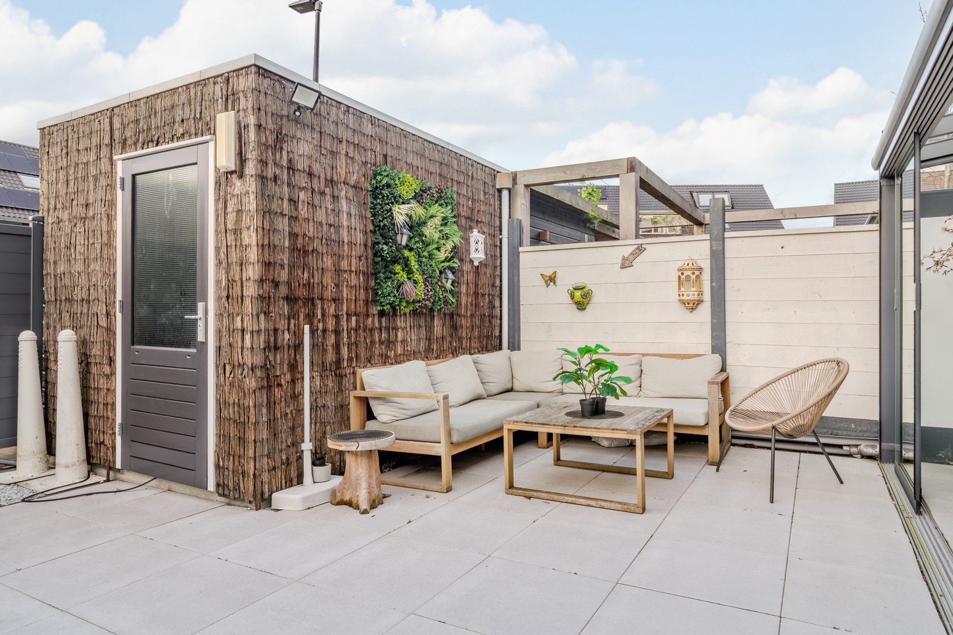 Beide tuinen zijn voorzien van onderhoudsvrije bestrating met groot type licht tegels. De achtertuin is afgeschermd door toegangspoort en solide schuttingen rondom waardoor privacy gegarandeerd is.