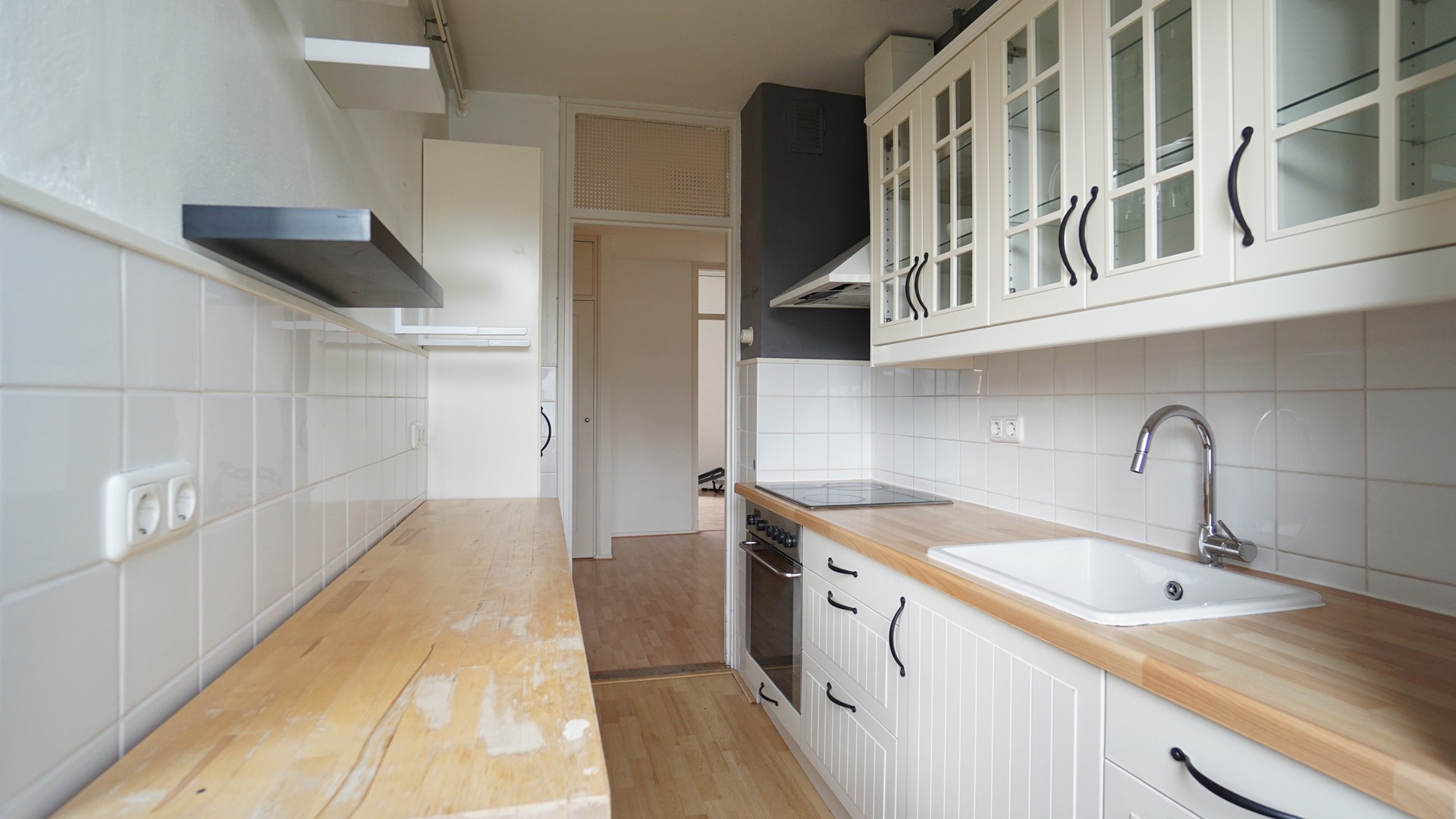 De woning is deels gemoderniseerd en voorzien van inbouwkeuken met kookplaat, oven, afzuigkap, koel-diepvriescombinatie. Verder zijn er 2 ruime slaapkamers en een grote hal in het appartement aanwezig. Op de begane grond is een praktische berging gesitueerd voor opslag en stalling fietsen.