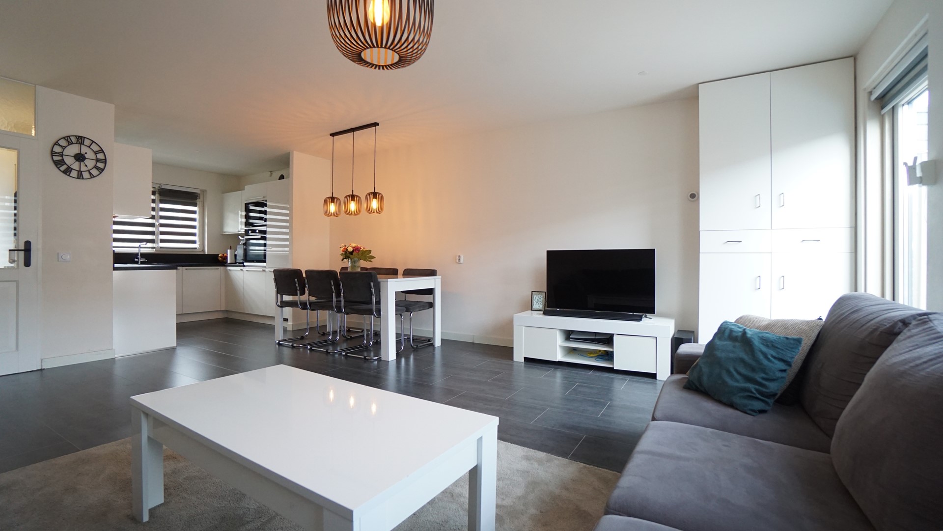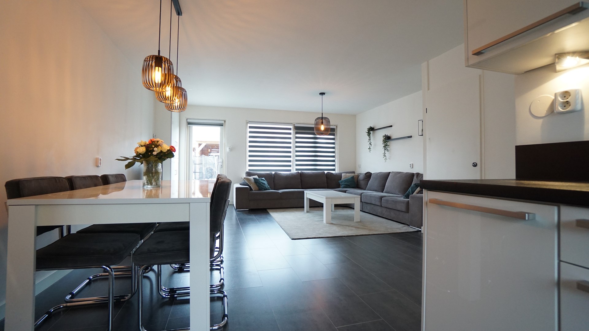 woonkamer. De woonkamer geeft een ruimtelijk gevoel dit mede omdat er een ruime open keuken is met vernieuwde inrichting. De begane grond is voorzien van laminaattegels.