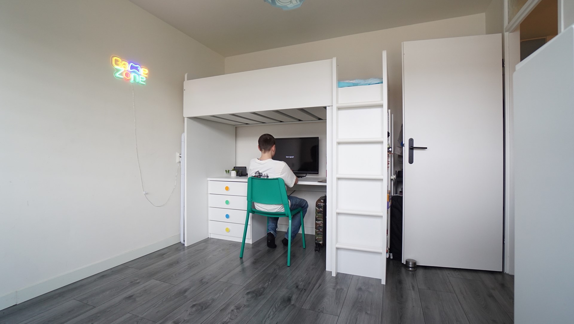 De verdieping heeft eveneens een mooie laminaatvloer met een wat warmere uitstraling. Er zijn twee grote slaapkamers van circa 12m² die beiden veel lichtinval bieden. De derde slaapkamer, groot circa 6m², kan gebruikt worden als studeer- of babykamer en maakt gebruik van de gedeelde dakkapel. De moderne badkamer die recent is vernieuwd biedt een comfortabel grote inloopdouche en wastafelmeubel met dubbele kraan. De achterzijde van de woning heeft over de grootste breedte een dakkapel voor extra stahoogte alsmede zonnescherm op de parterre.