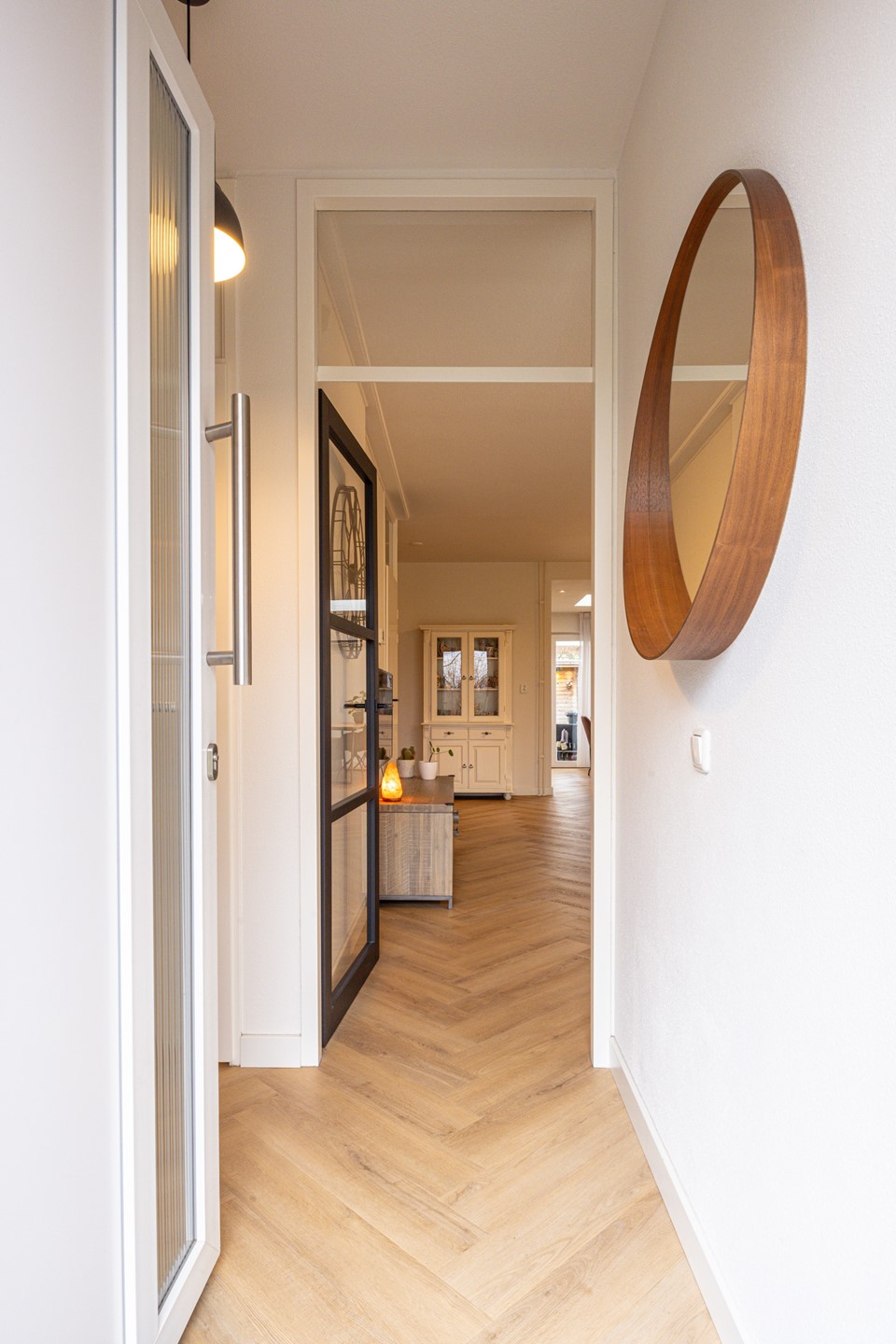 Bij aankomst valt direct de verzorgde voortuin op, die zorgt voor een nette en uitnodigende eerste indruk. Via de entree kom je binnen in de ontvangsthal, die is afgewerkt met een visgraatvloer en direct een warme sfeer uitstraalt. In de hal bevinden zich de garderobe, de meterkast en het toilet. Het toilet is uitgevoerd met een zwevend closet en een fonteintje.