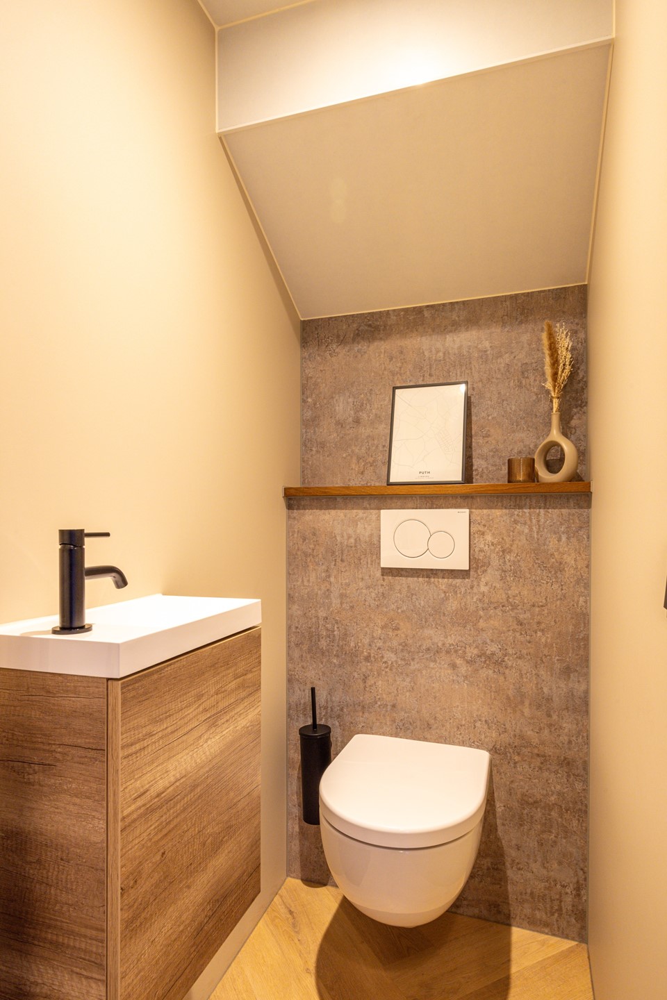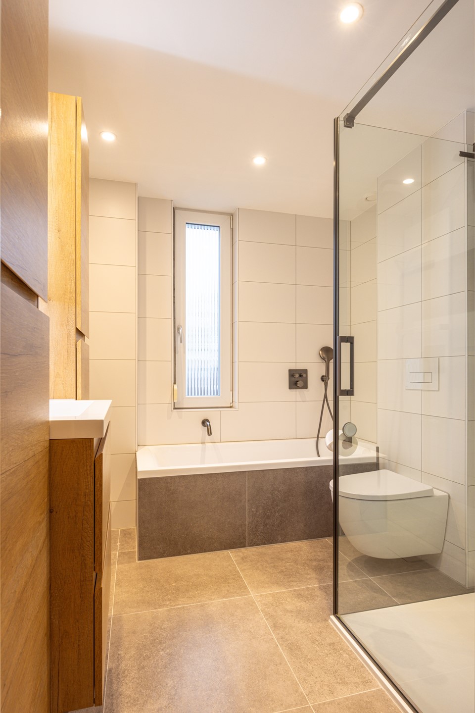 De badkamer is in 2024 vernieuwd en uitgevoerd in een rustige en verzorgde stijl. De ruimte is voorzien van inbouwspots en beschikt over een douchecabine met regendouche en glazen douchewand, een badkamermeubel met veel opbergruimte, een wastafel met spiegel, een ligbad en een zwevend toilet. Ook hier is een rolluik aanwezig.