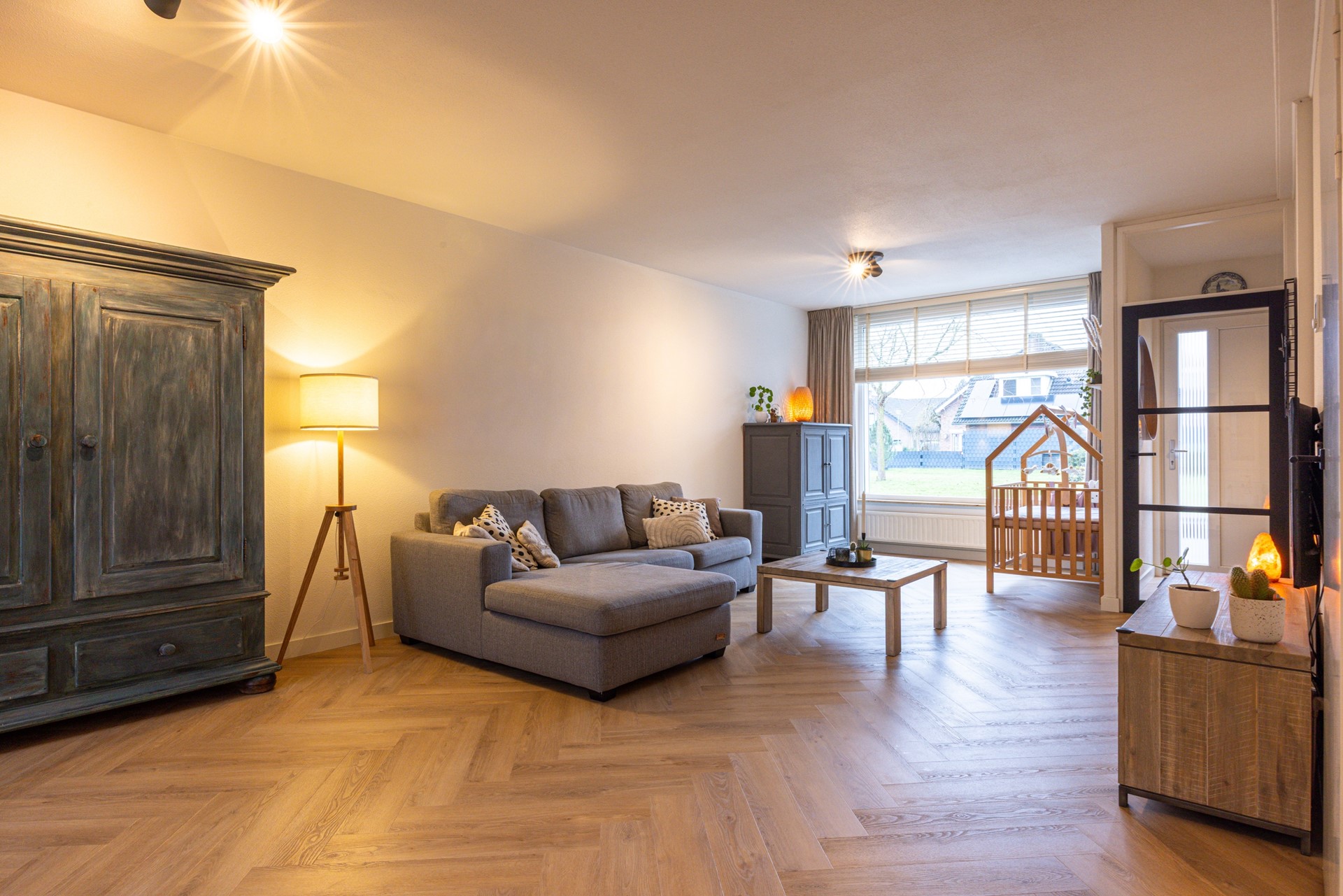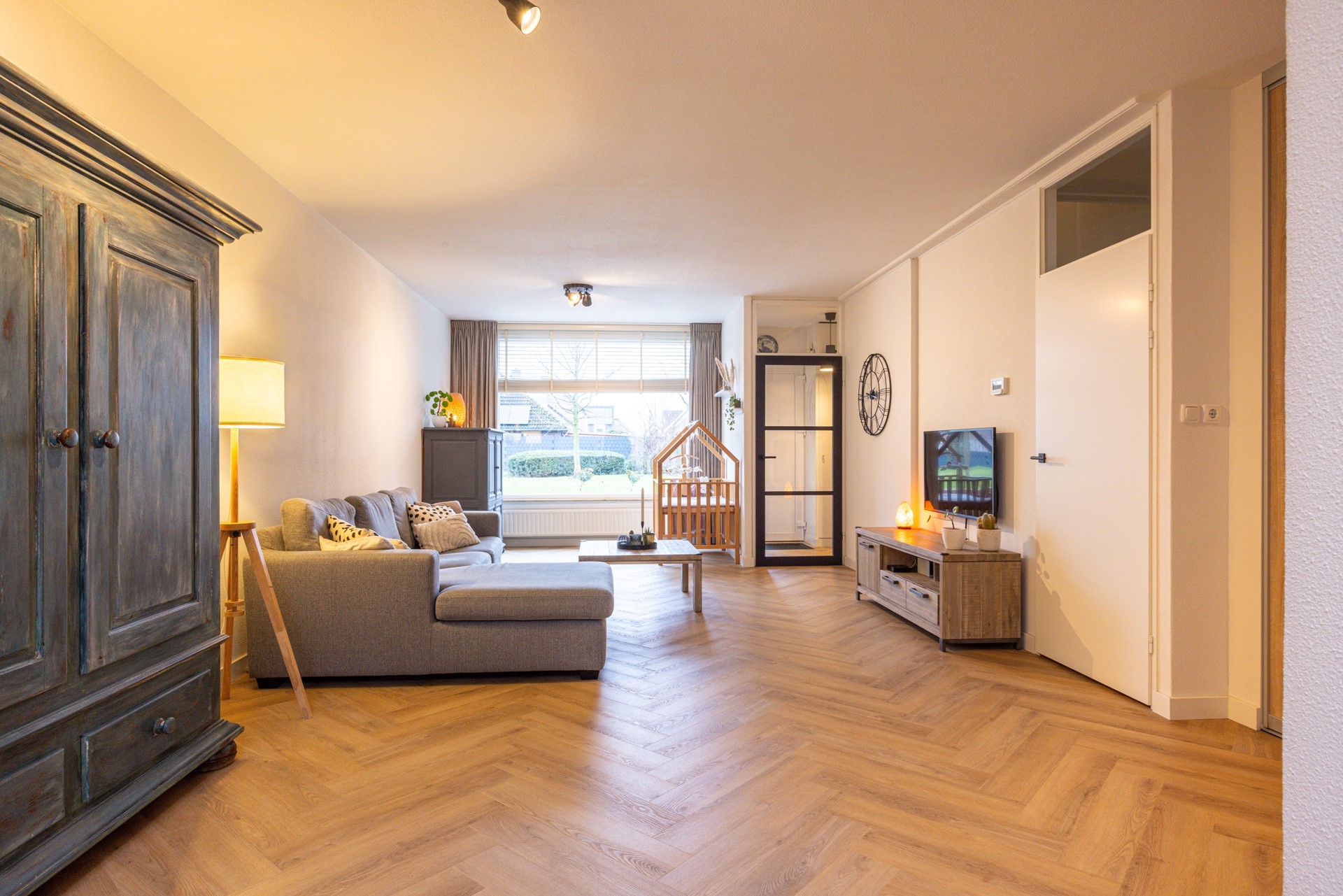 Vanuit de hal bereik je de woonkamer, die eveneens is voorzien van een fraaie PVC visgraatvloer. De woonkamer profiteert van een prettige lichtinval en biedt volop ruimte voor een comfortabele zithoek. Een vaste inbouwkast met schuifdeuren zorgt voor extra bergruimte en draagt bij aan een opgeruimd geheel. Het aanwezige rolluik aan de voorzijde biedt extra comfort en privacy. Via het tussenportaal is de trapopgang naar de eerste verdieping bereikbaar.