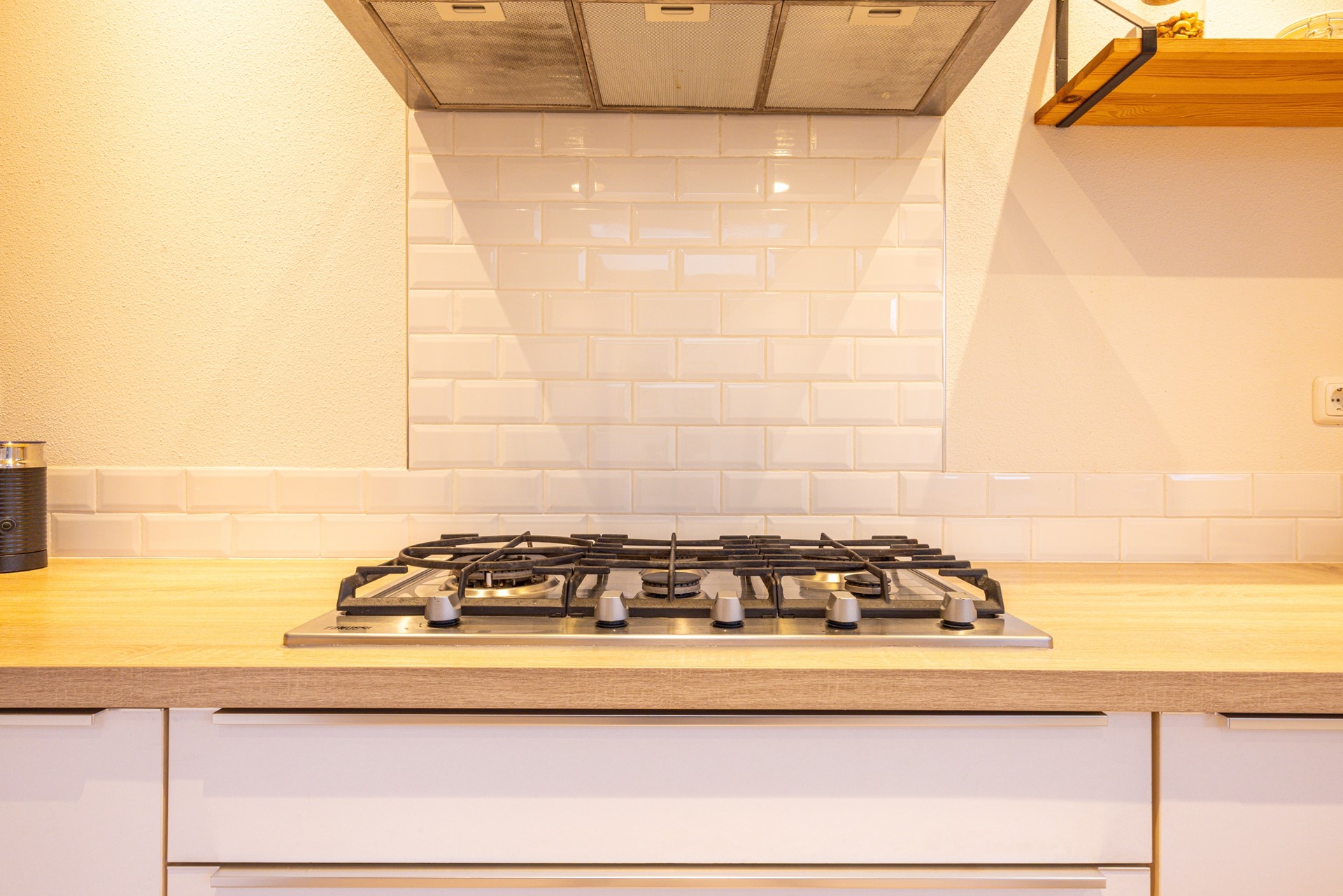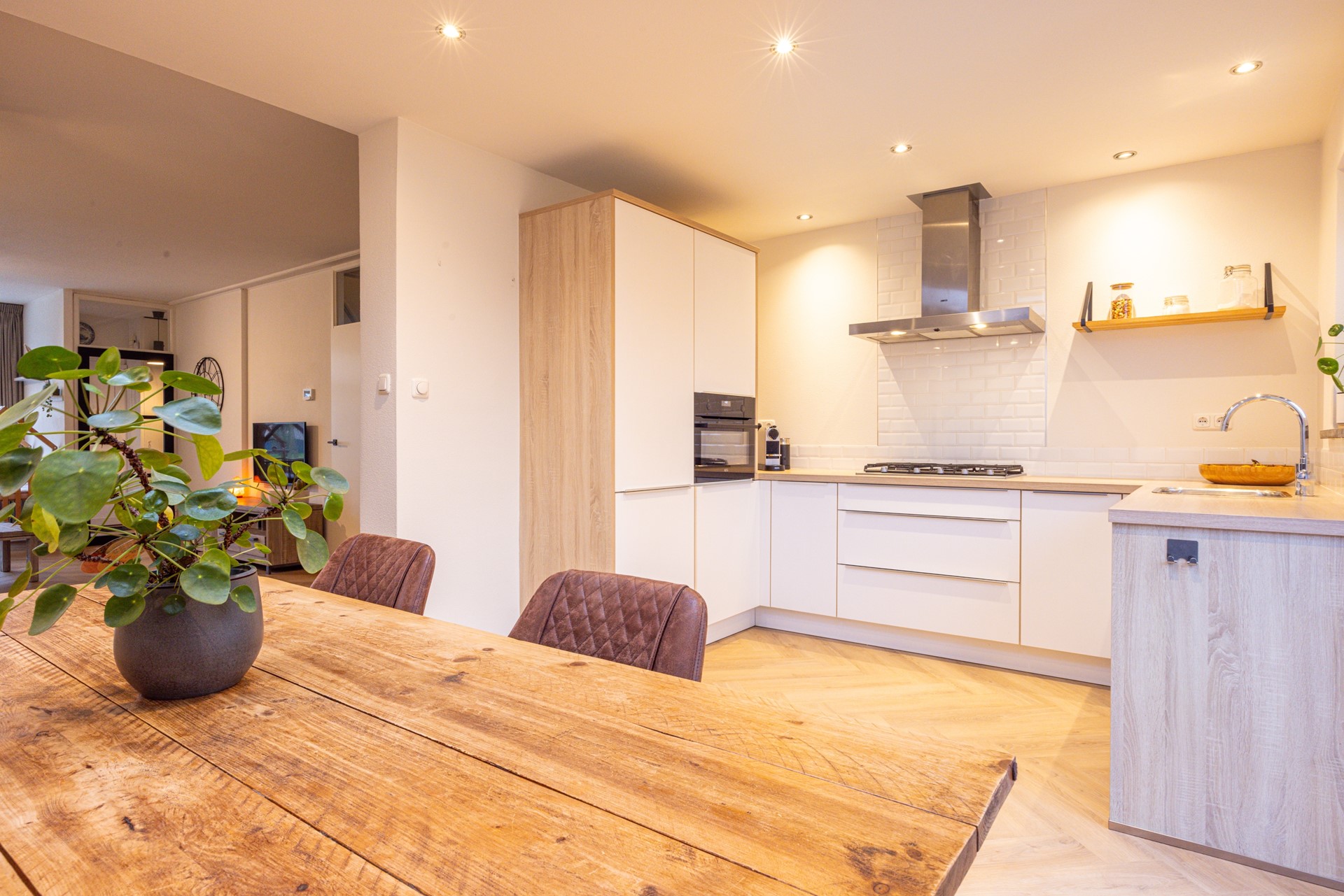 Aan de achterzijde van de woning bevindt zich de uitgebouwde leefkeuken. Door deze aanbouw is een royale ruimte ontstaan die naadloos aansluit op de woonkamer. De open keuken is uitgevoerd in een U-opstelling en beschikt over dezelfde visgraatvloer, wat zorgt voor een mooi geheel. Dankzij de aanwezige inbouwspots en de ruime werk- en kastruimte is het een aangename plek om te koken en te verblijven. De keuken is uitgerust met onder meer een 5-pits gasfornuis met afzuigkap, een combi heteluchtoven, een koelkast, een vriezer en een vaatwasser. Daarnaast is hier een airco geplaatst die zowel kan koelen als verwarmen.