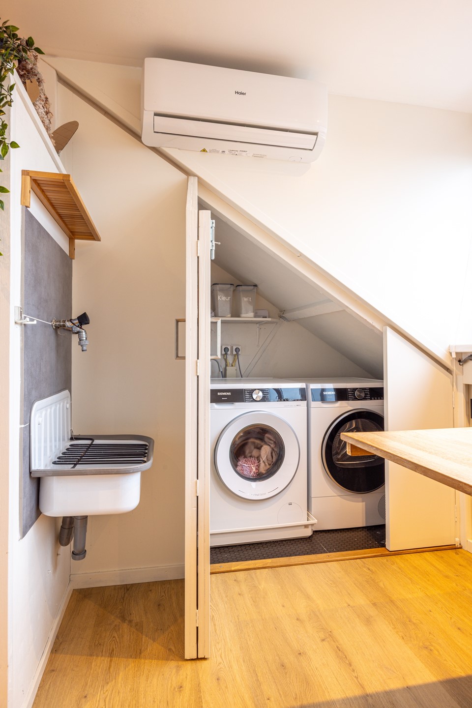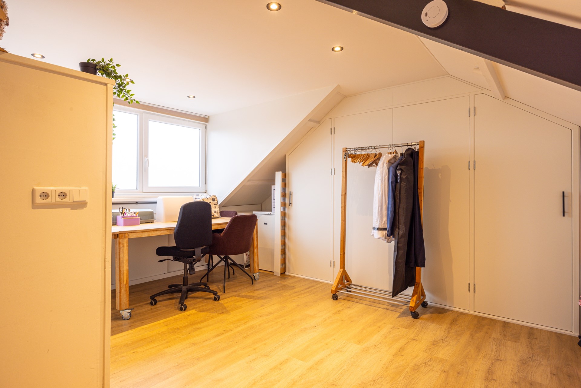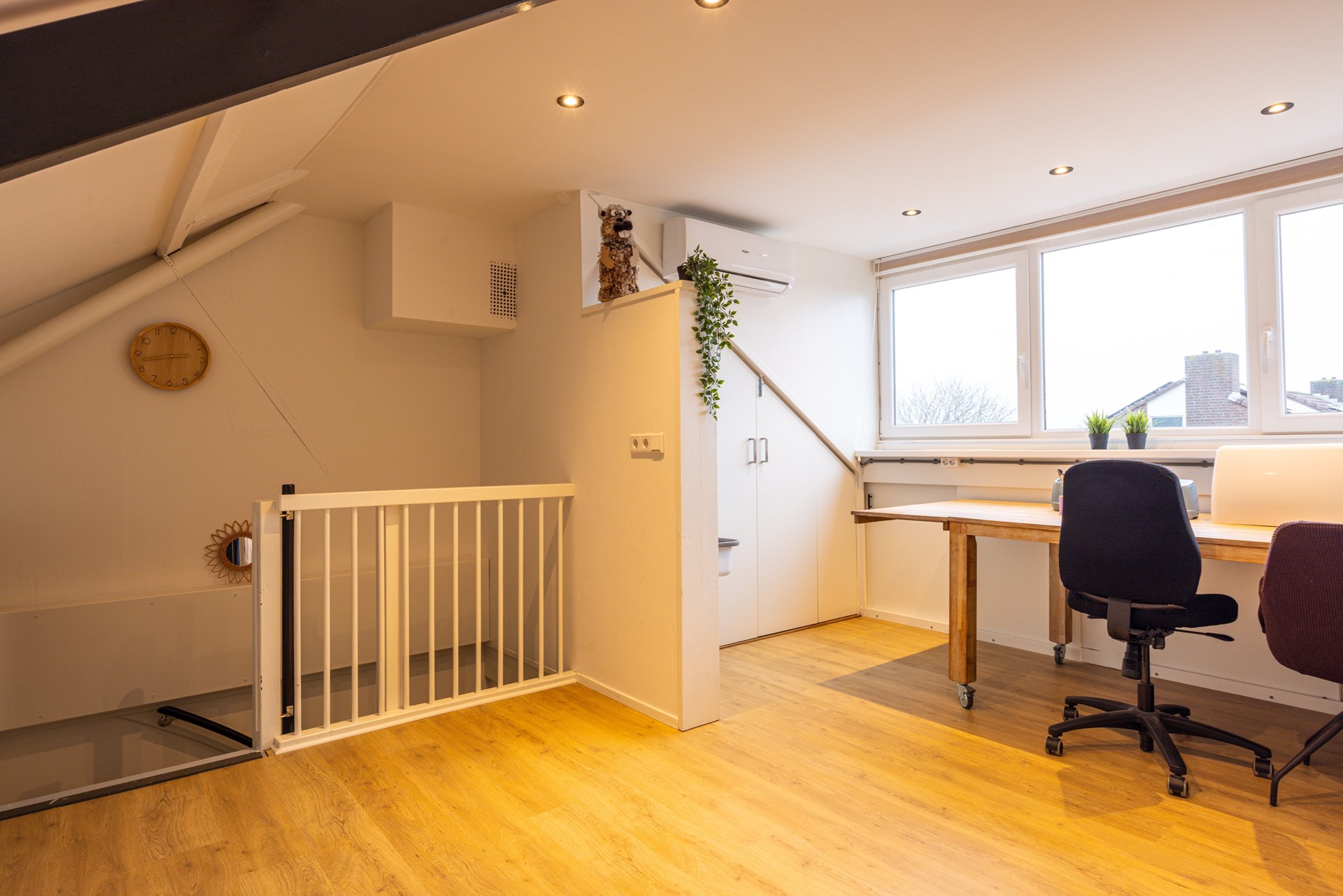 Via een vaste trap bereik je de tweede verdieping. Deze verdieping is afgewerkt met een laminaatvloer en beschikt over een dakkapel, waardoor er veel daglicht binnenvalt. De ruimte is voorzien van inbouwspots en een airco die kan koelen en verwarmen, wat zorgt voor een aangename temperatuur gedurende het hele jaar. De aanwezige inbouwkasten bieden volop bergruimte en de witgoedaansluitingen zijn netjes weggewerkt in een kast. Dankzij de goede afmetingen en het prettige lichtinval is deze verdieping uitstekend geschikt als vierde slaapkamer, werkkamer of hobbyruimte.