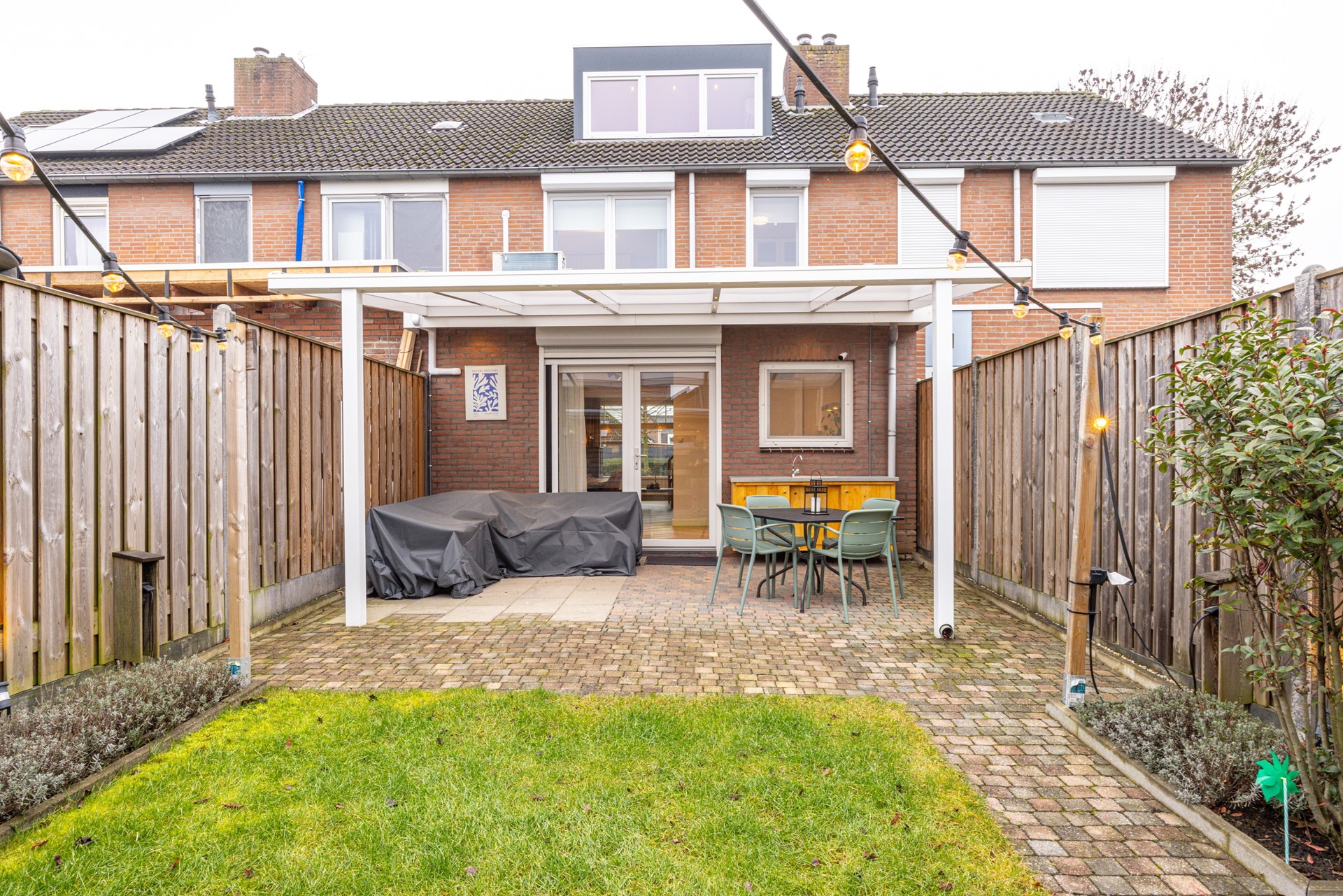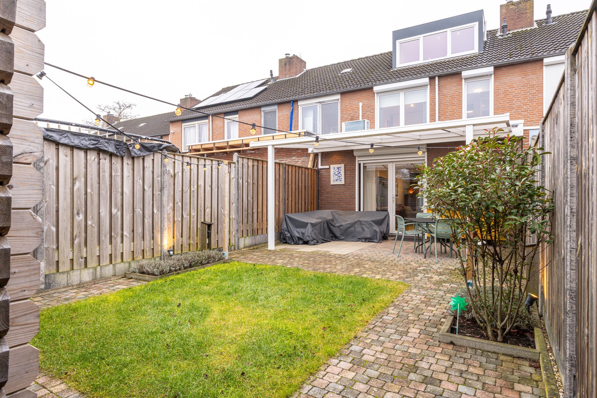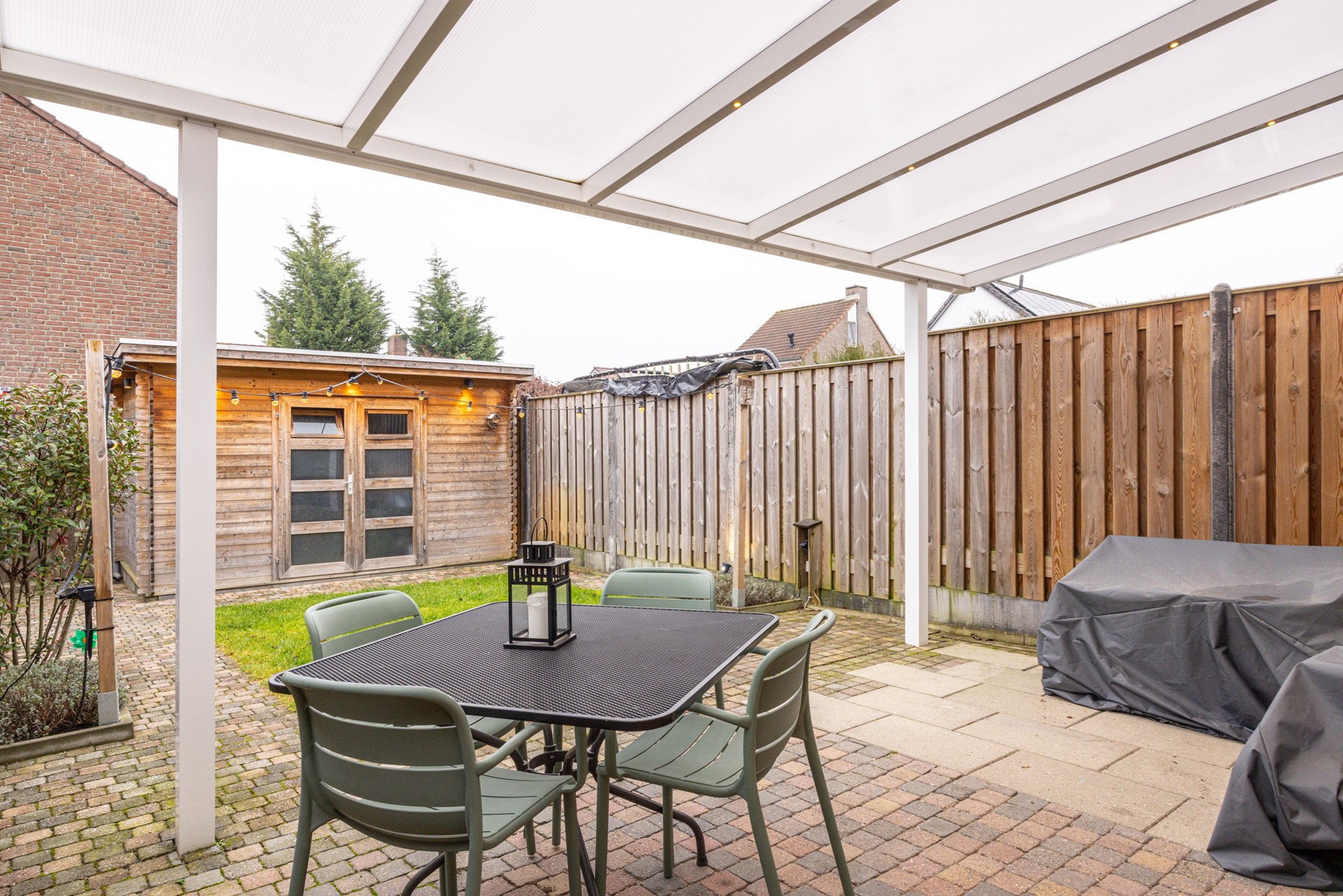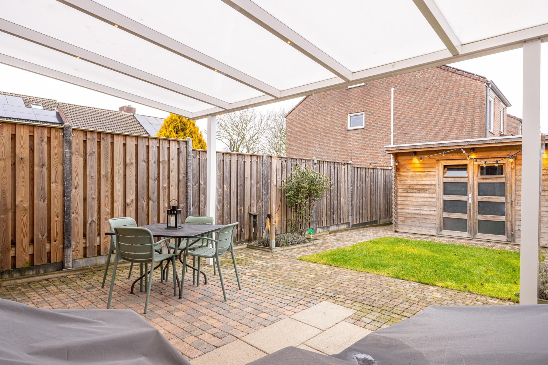 De achtertuin is verzorgd aangelegd en biedt een prettige combinatie van terras, groen en praktische voorzieningen. Direct aan de woning bevindt zich een overdekt terras met verlichting, waardoor je hier al vroeg in het voorjaar en tot in de avonduren comfortabel buiten kunt zitten.