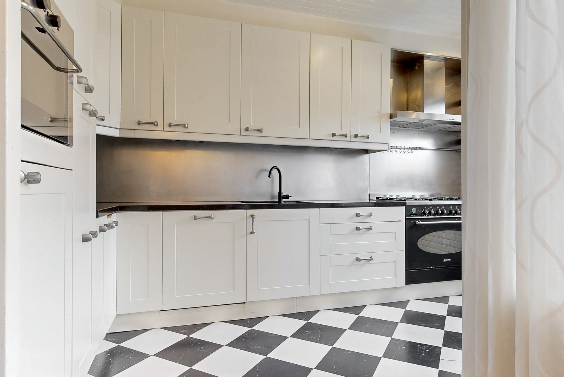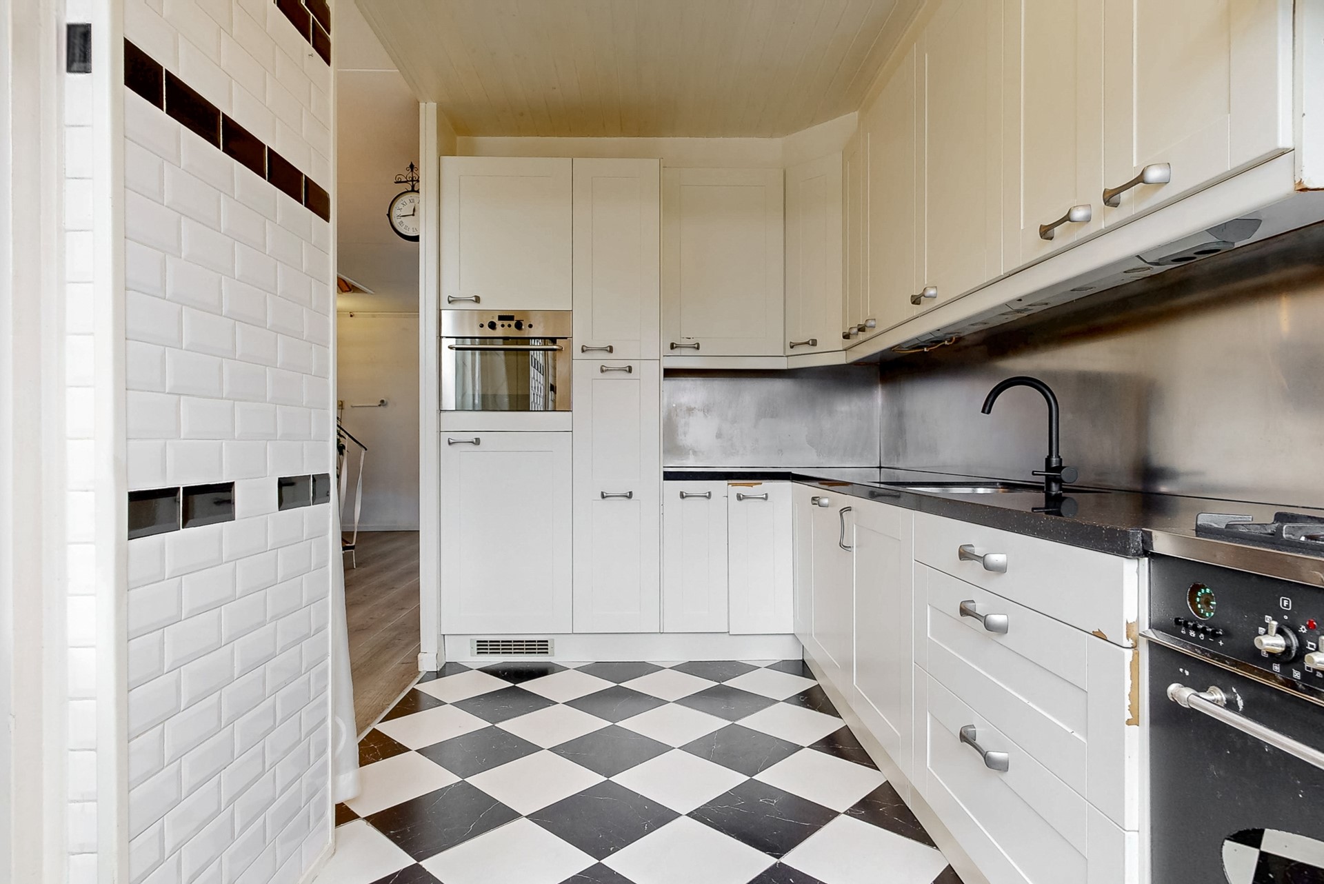 De keuken staat in open verbinding met de woonkamer en is door de uitbouw opvallend ruim. Op de vloer liggen tegels, de wanden zijn betegeld en het plafond is uitgevoerd in houtwerk. De eenvoudige keukenopstelling met kaderdeurtjes en granieten werkblad is uitgerust met een fornuis met 6 gaspitten, een brede elektrische oven en een afzuigkap. Verder beschik je over een combimagnetron en een vaatwasmachine. Tijdens het koken kijk je via het raam leuk uit op de achtertuin. Via de deur stap je zo onder de overkapping. Op de vloer liggen dezelfde tegels als in de hal en je vindt hier een radiator, verlichting, buitenkraan en de wasmachine-aansluiting. Via de schuifdeur stap je de achtertuin in.