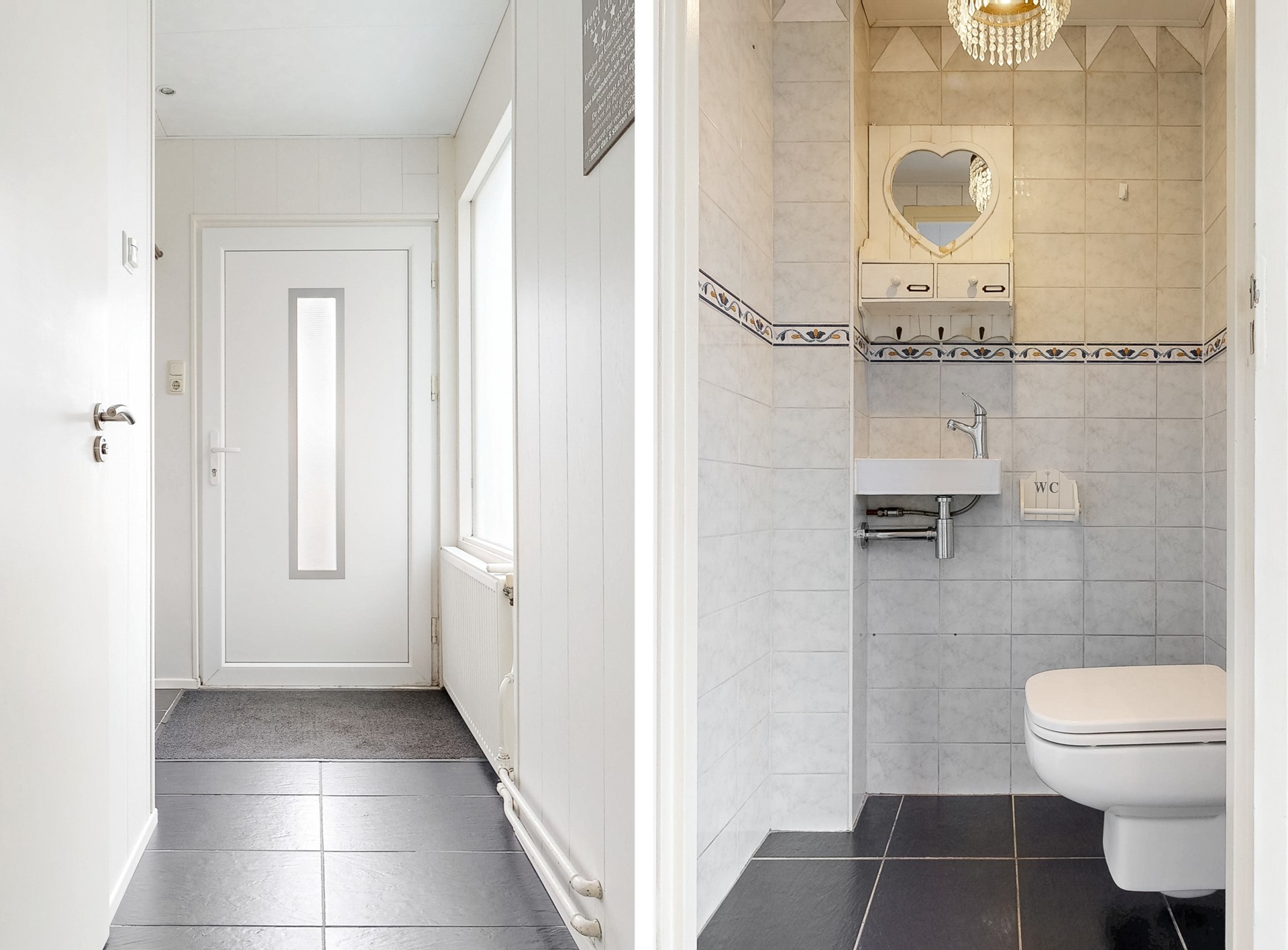 Via de voordeur stap je binnen in de hal, die in de uitbouw aan de voorzijde is gesitueerd. Dankzij het venster in de voordeur en het grote raam in de zijgevel profiteer je van veel lichtinval. De zwarte tegelvloer, schroten wanden en het systeemplafond met inbouwspots geven direct een functionele eerste indruk. Aan de rechterzijde bevindt zich een dubbele vaste kast met bergruimte aan de ene kant en de meterkast aan de andere. Voor deze kast is de garderobe gecreëerd. De toiletruimte is uitgevoerd met een wandcloset, fontein en een elektrisch ventilatiepunt.