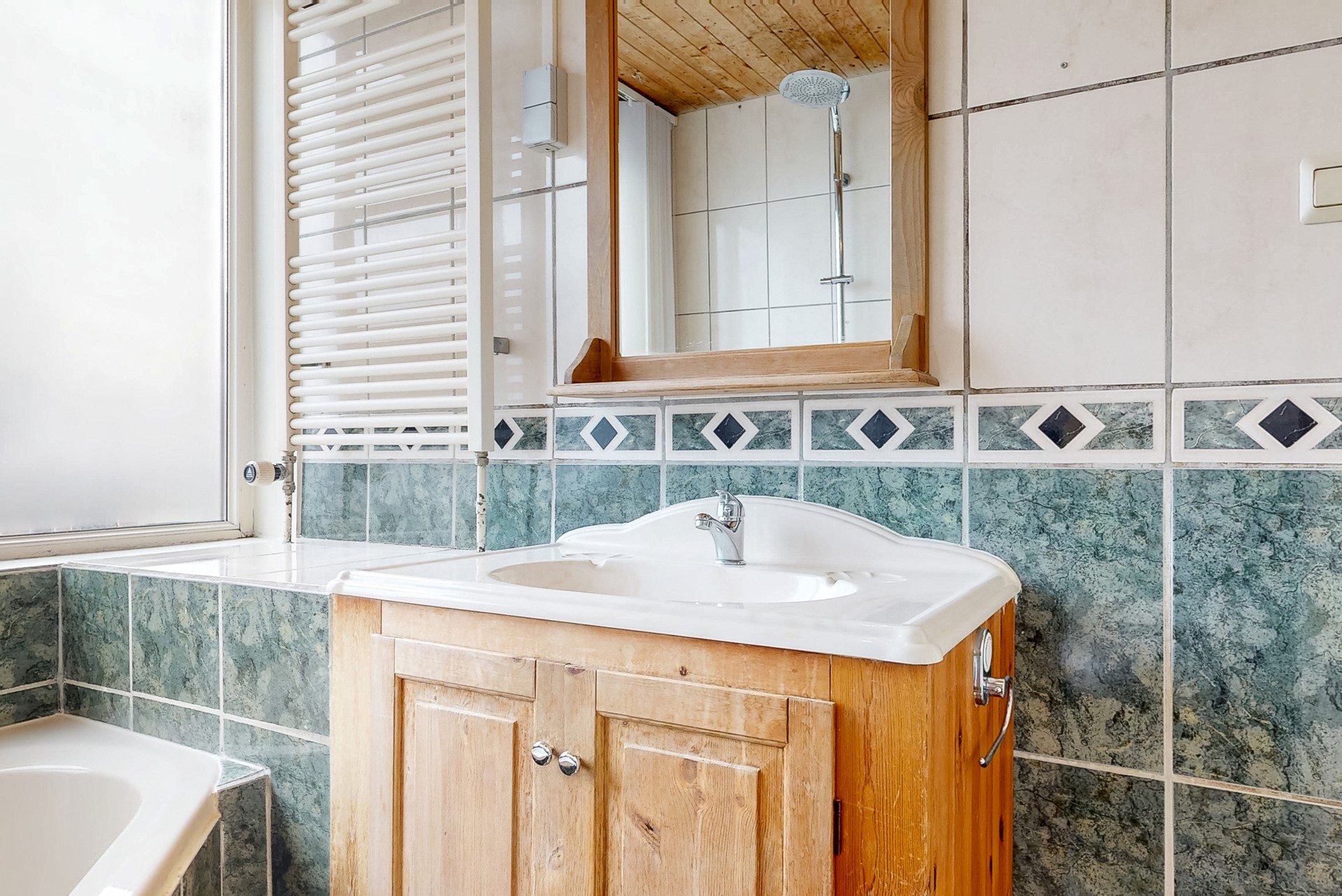 De badkamer is uitgevoerd met een royaal hoekbad met thermostaatkraan, regen- en handdouche, zodat je ook in bad kunt douchen. Er is een wastafelmeubel met houten onderkast, spiegel en verlichting. Het wandcloset en de designradiator maken de inrichting van deze badkamer compleet. Het royale raam zorgt voor lichtinval en ventilatie.
