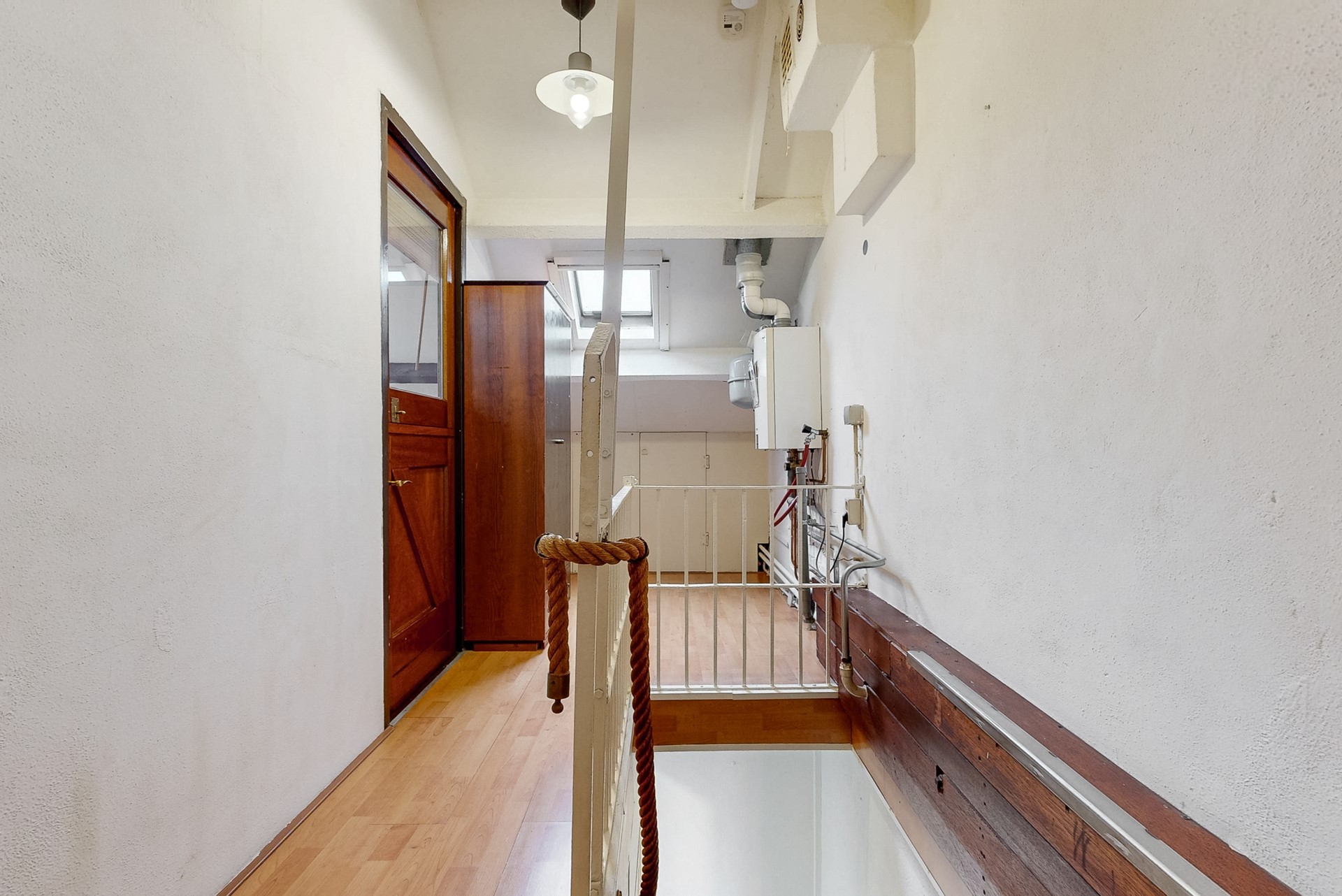 Via een vaste trap bereik je de voorzolder. Hier vind je een dakraam, de CV-installatie en aan weerszijden bergruimtes achter het knieschot.