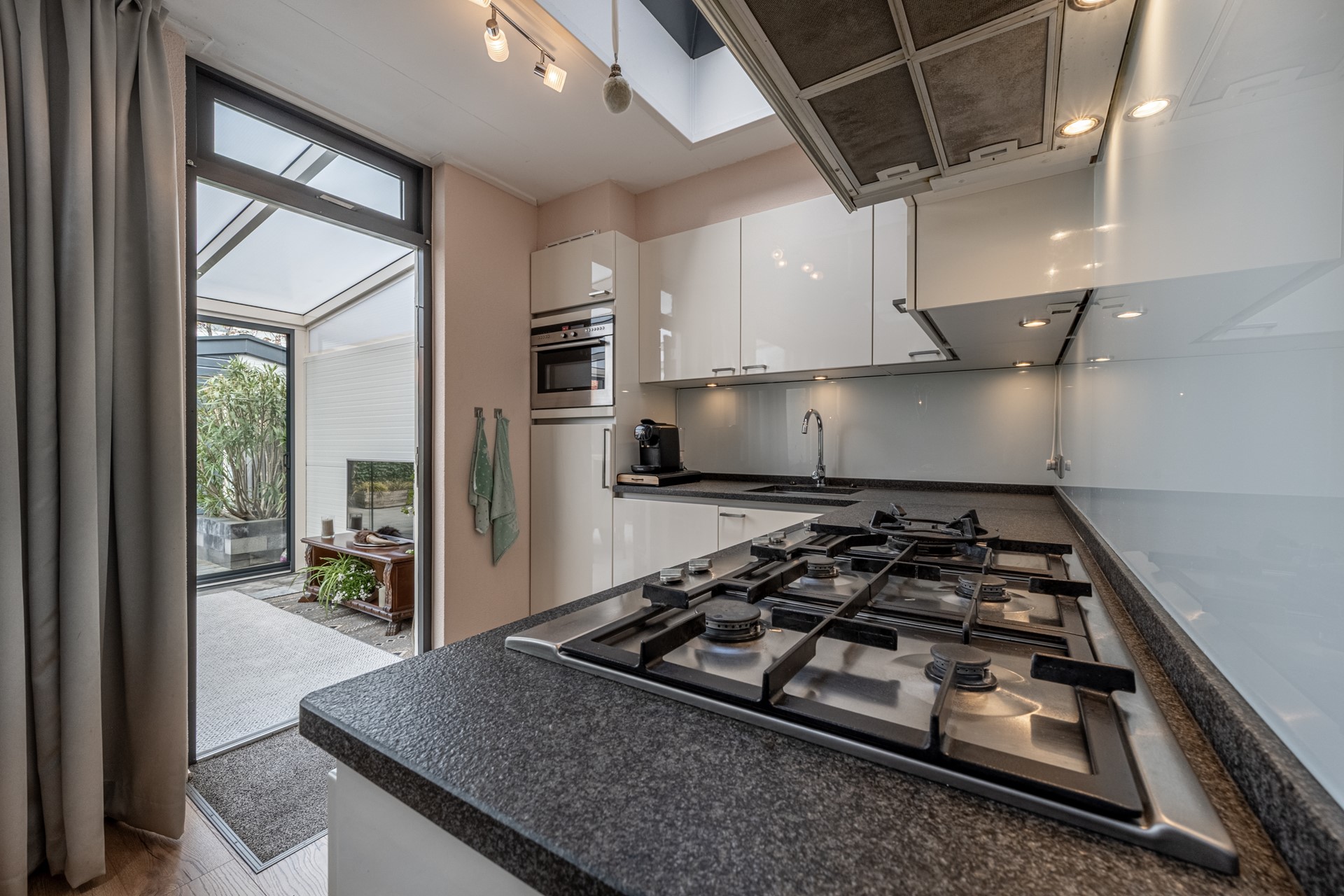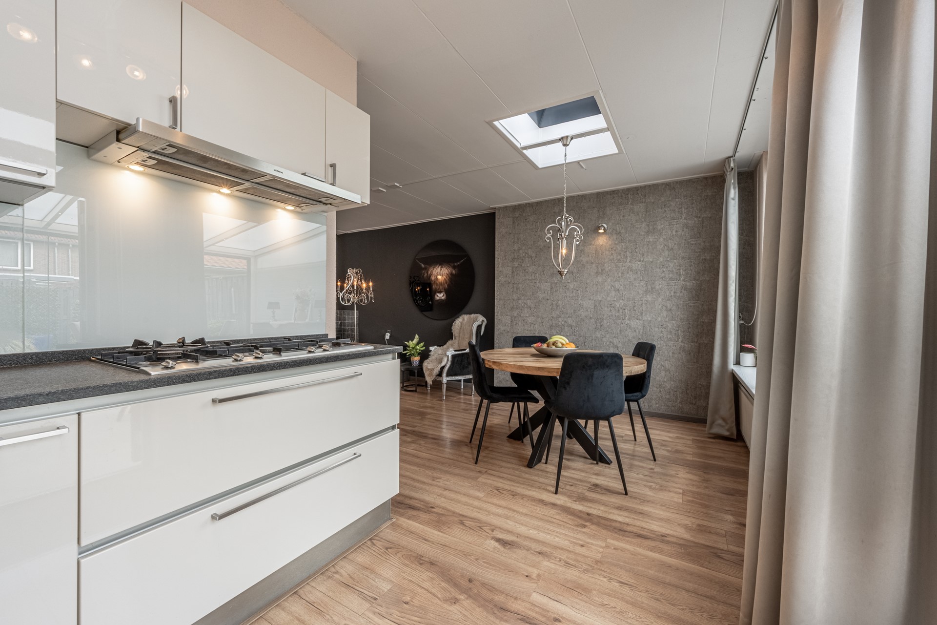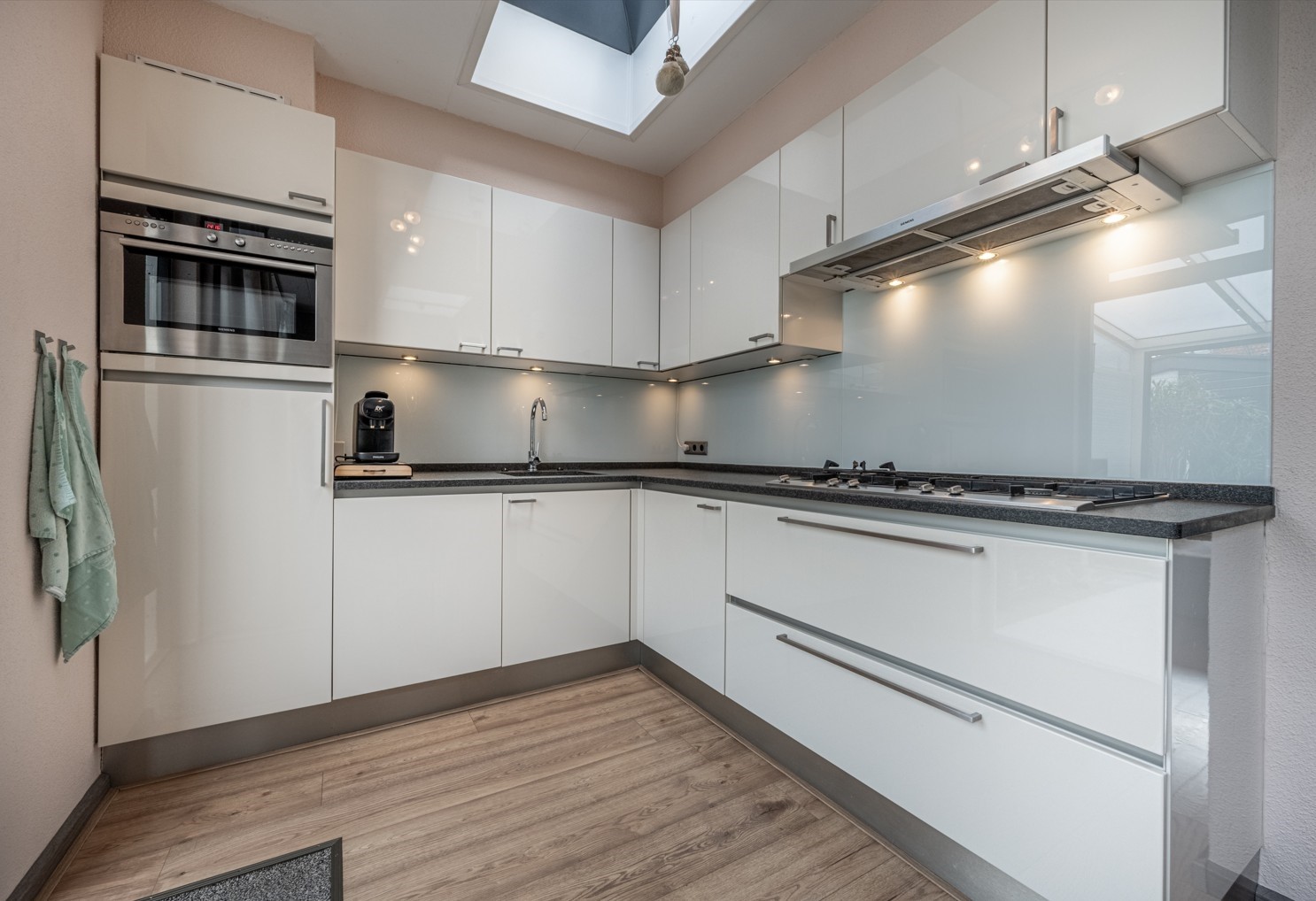 De open keuken ligt aan de achterzijde van de woning en is uitgevoerd in een moderne L-opstelling met diverse inbouwapparatuur. Vanuit de keuken loop je zo door naar de volledig afsluitbare serre – een heerlijke plek waar je het hele jaar door kunt genieten van het buitengevoel.