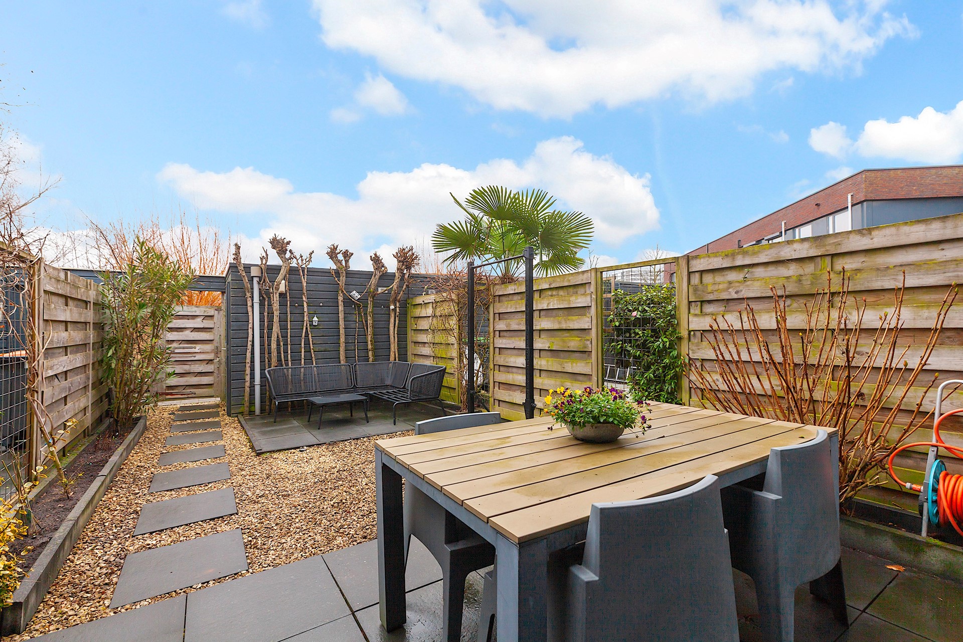 - Zonnige achtertuin met luxe zonnescherm met UV werend doek, sierbestrating en achterom