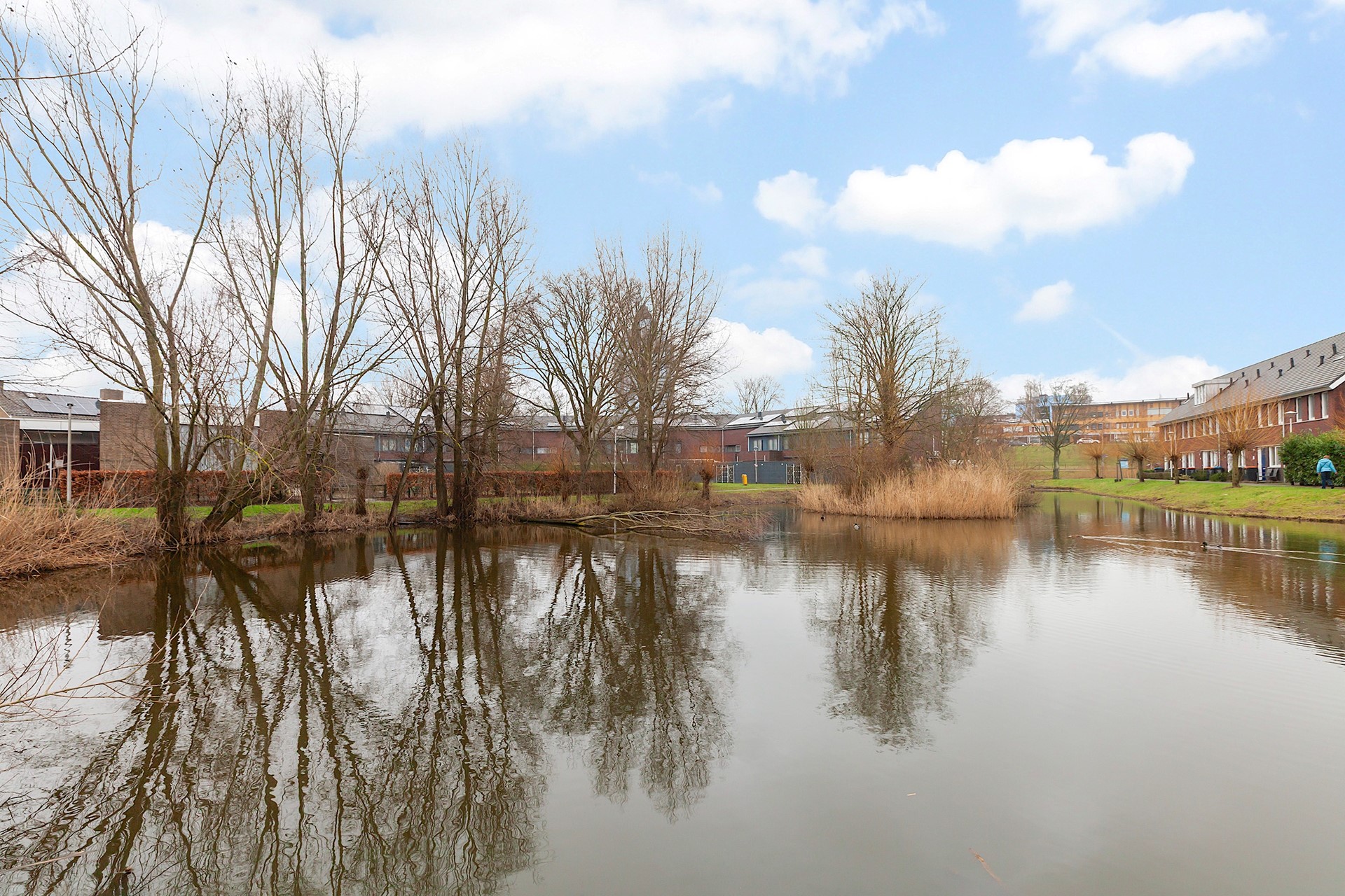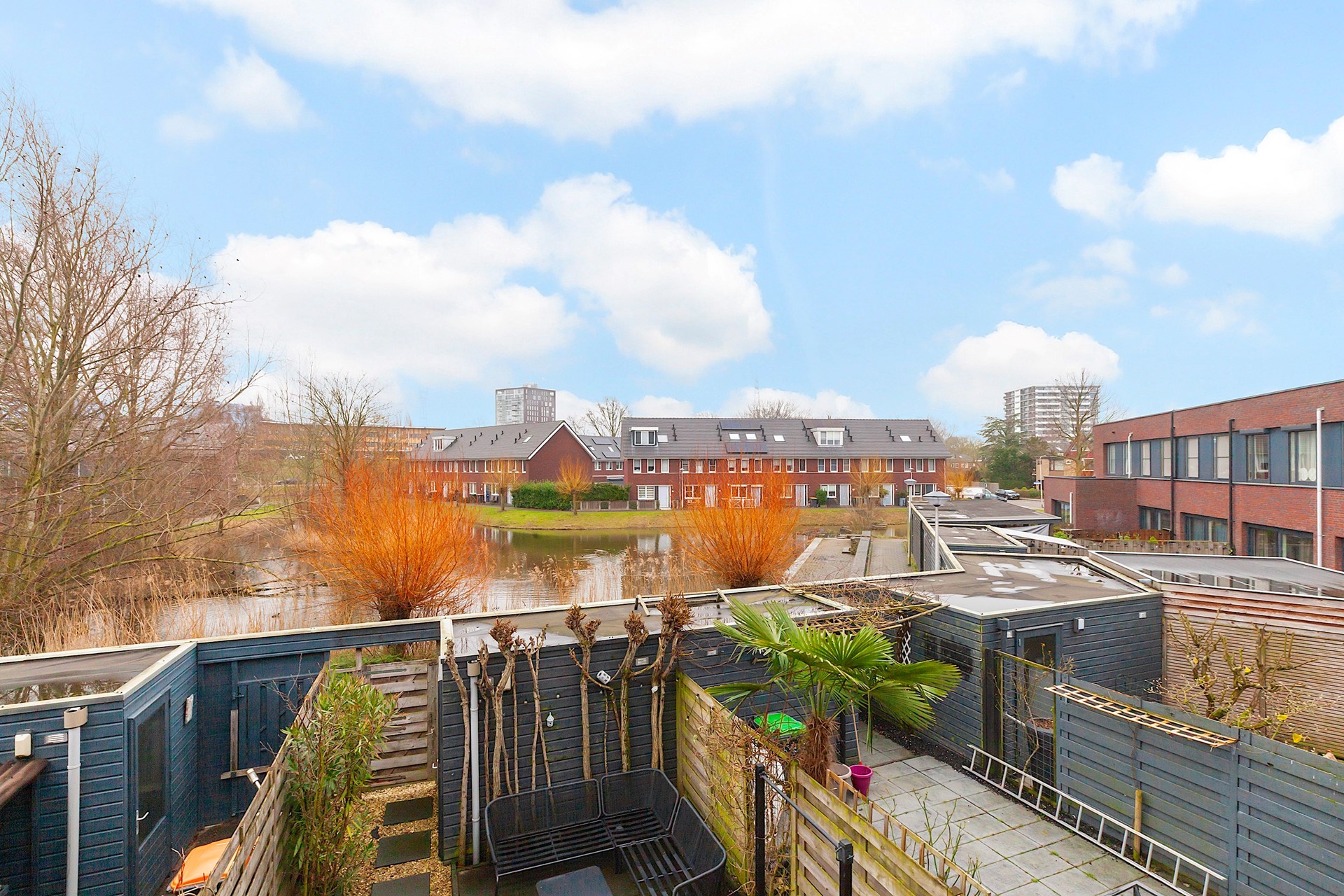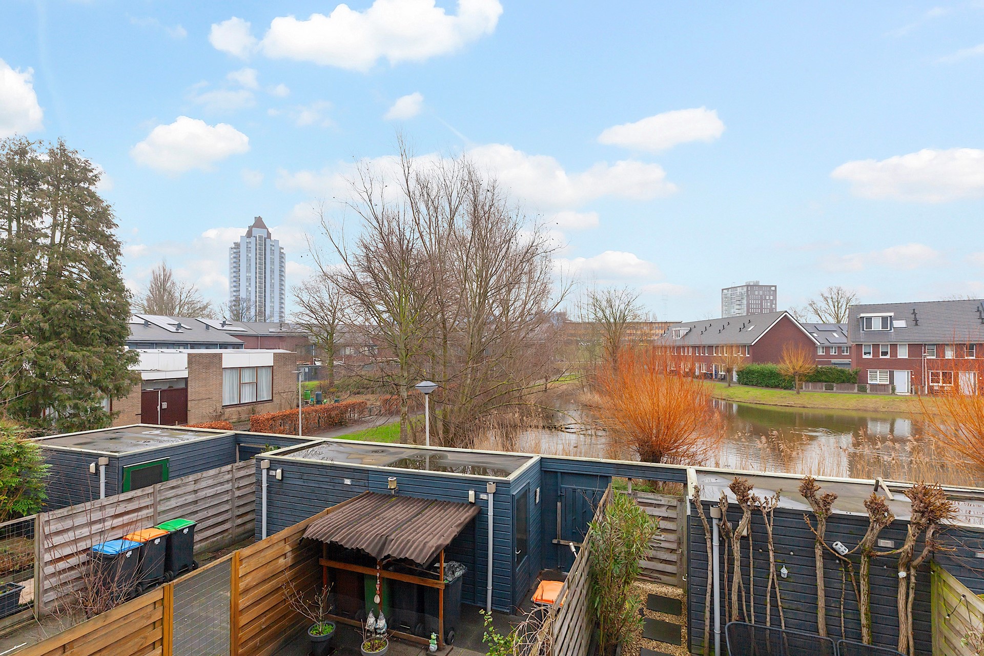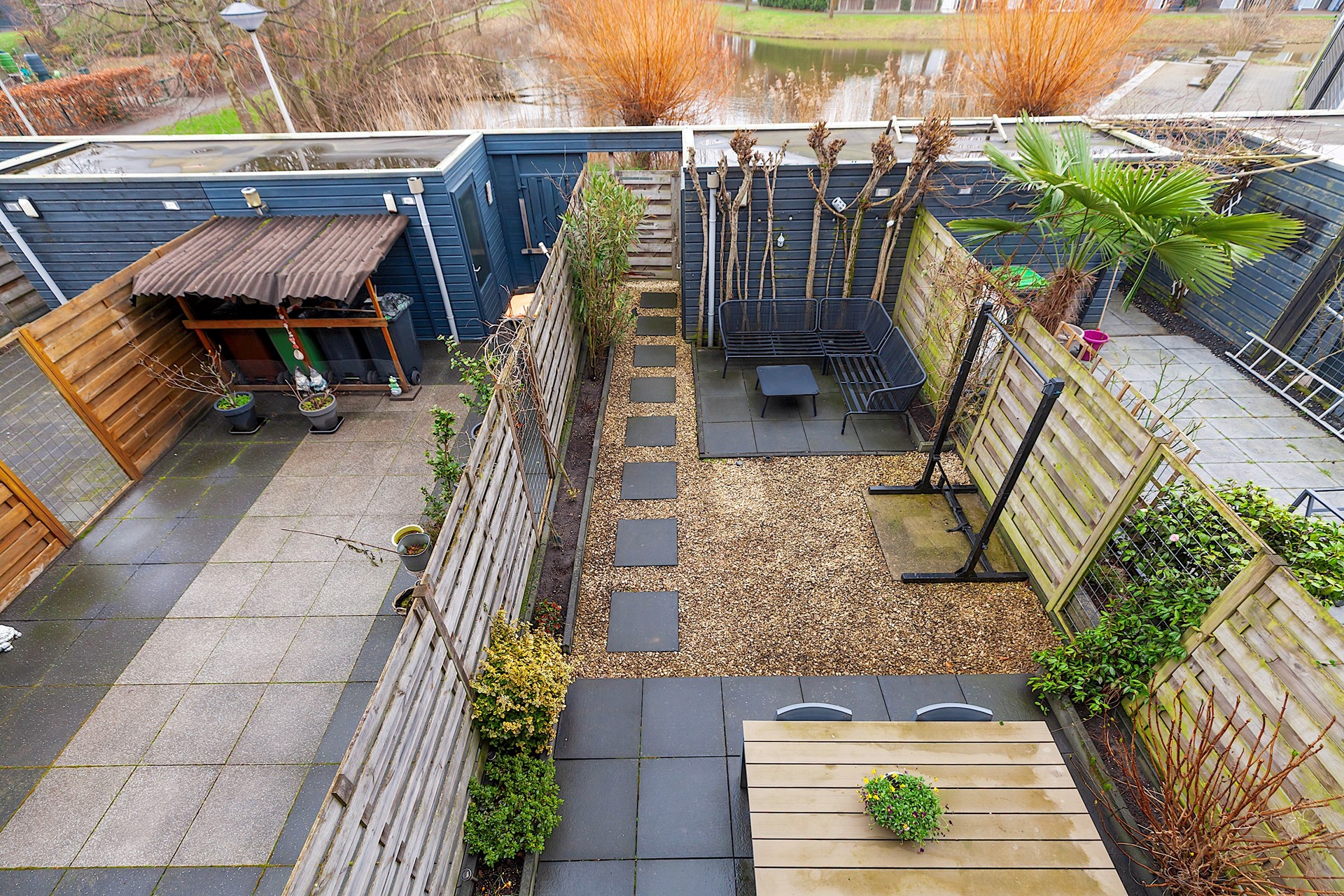 - De tuin heeft een ligging op het oosten en grenst aan een grote vijver