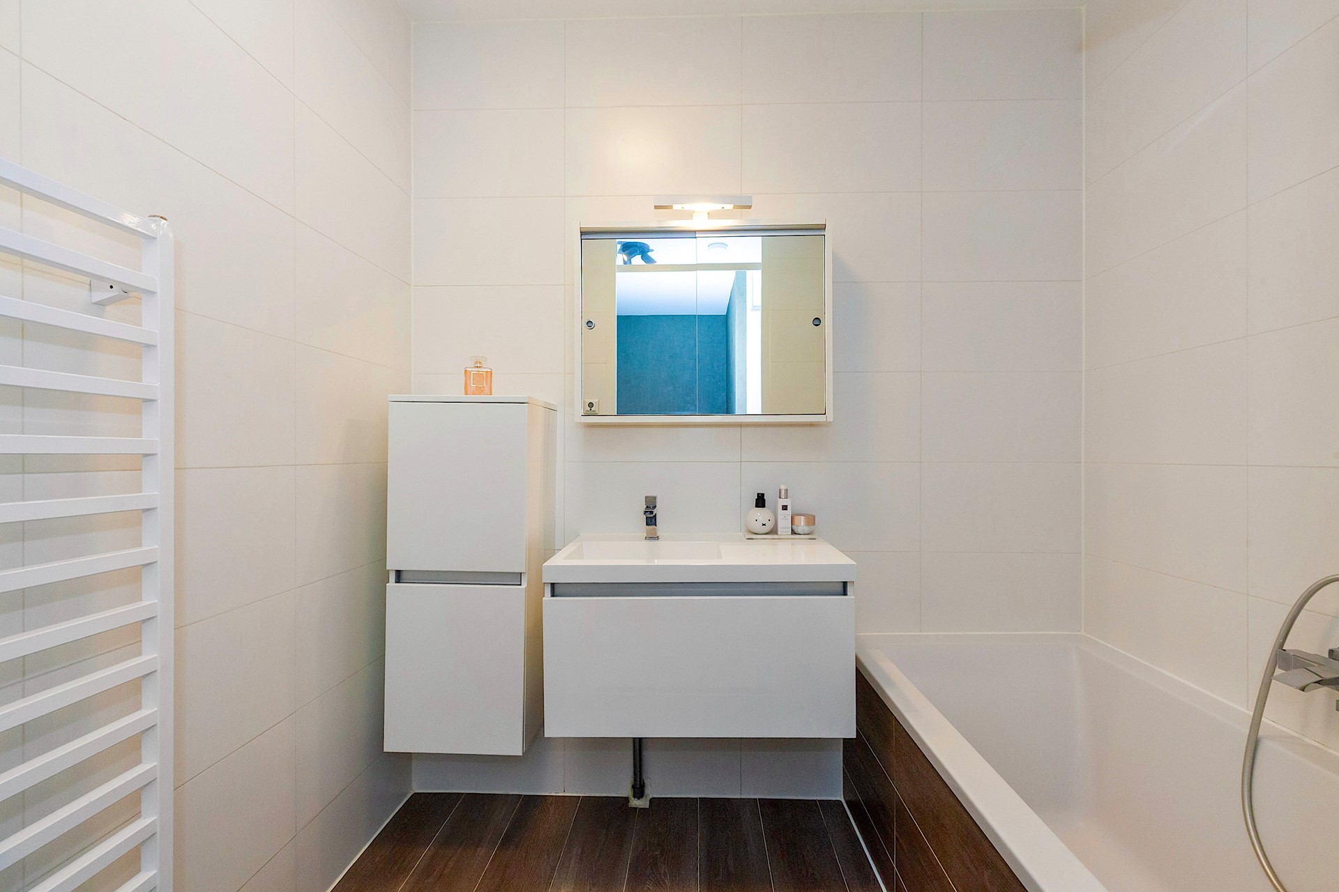 - Badkamer: Geheel betegelde moderne badkamer met bad/douche combinatie, regendouche, wastafel en design radiator
