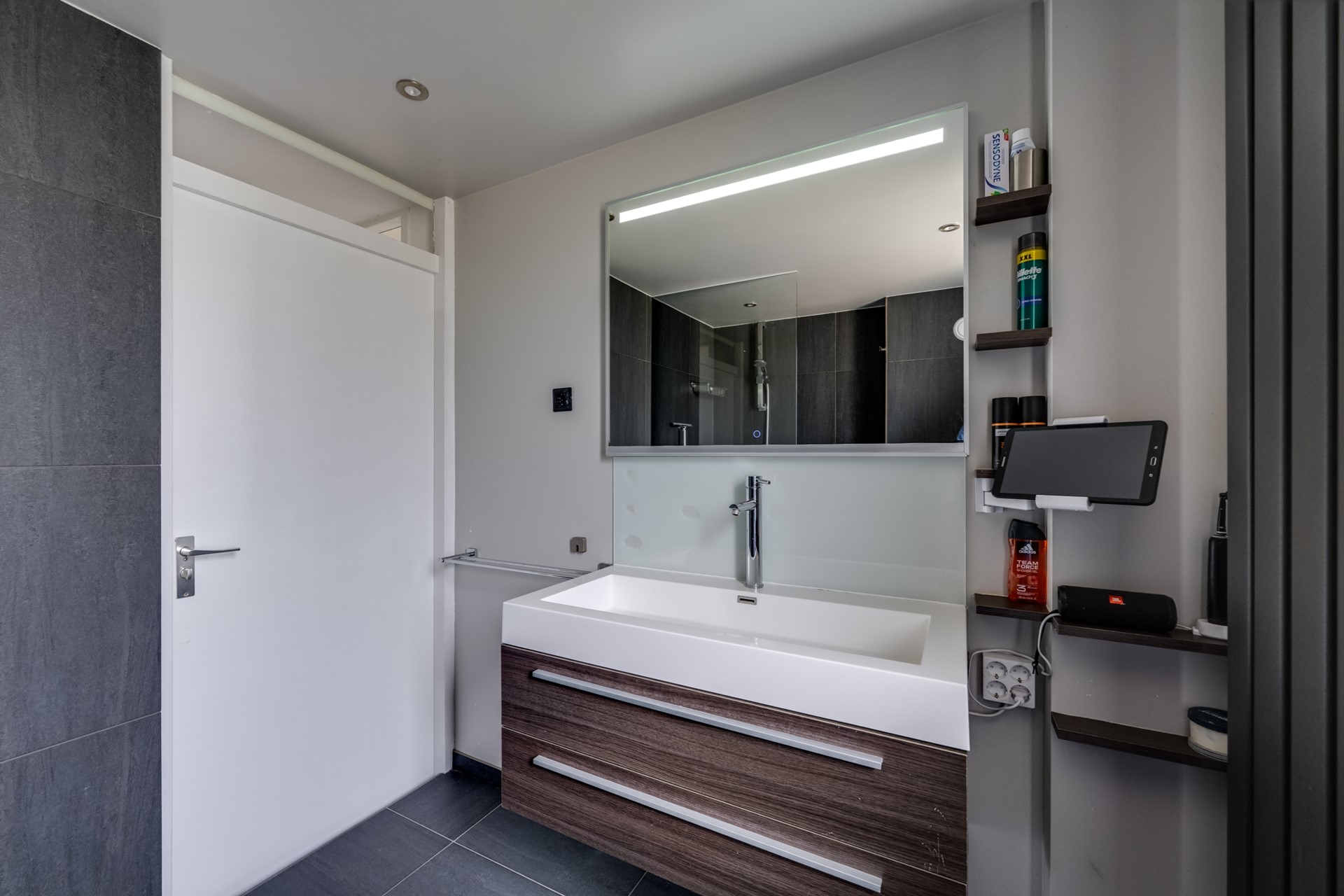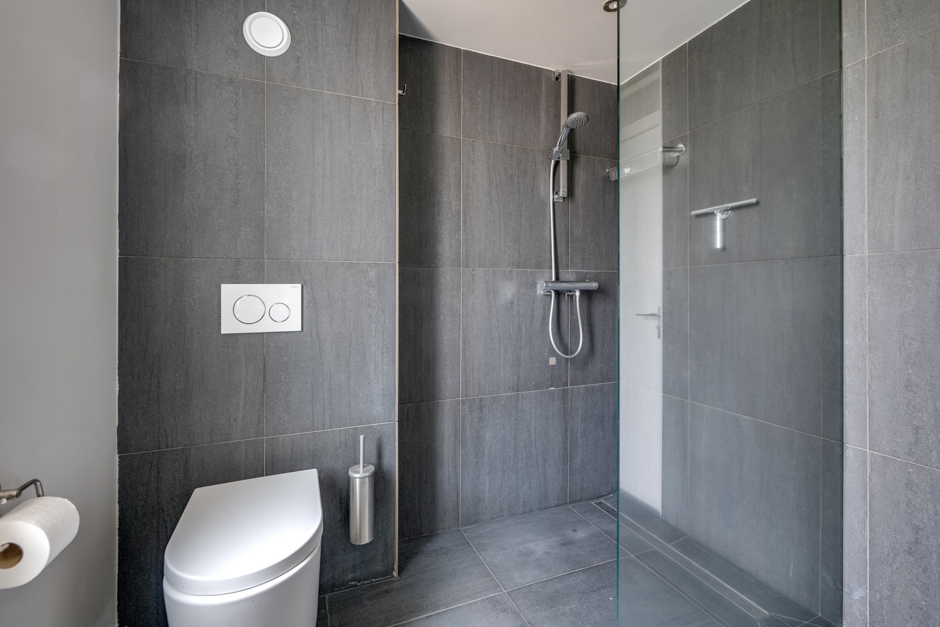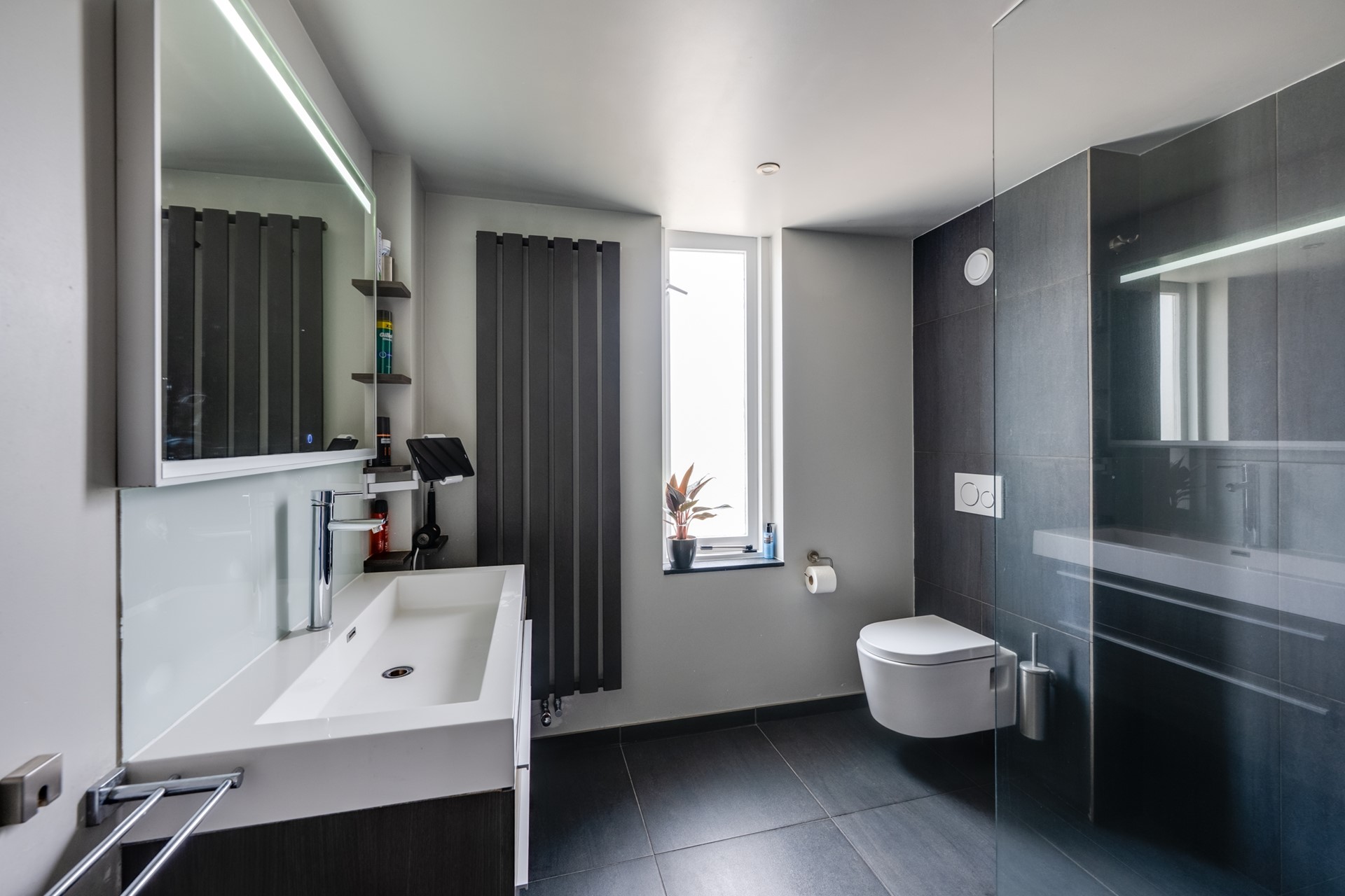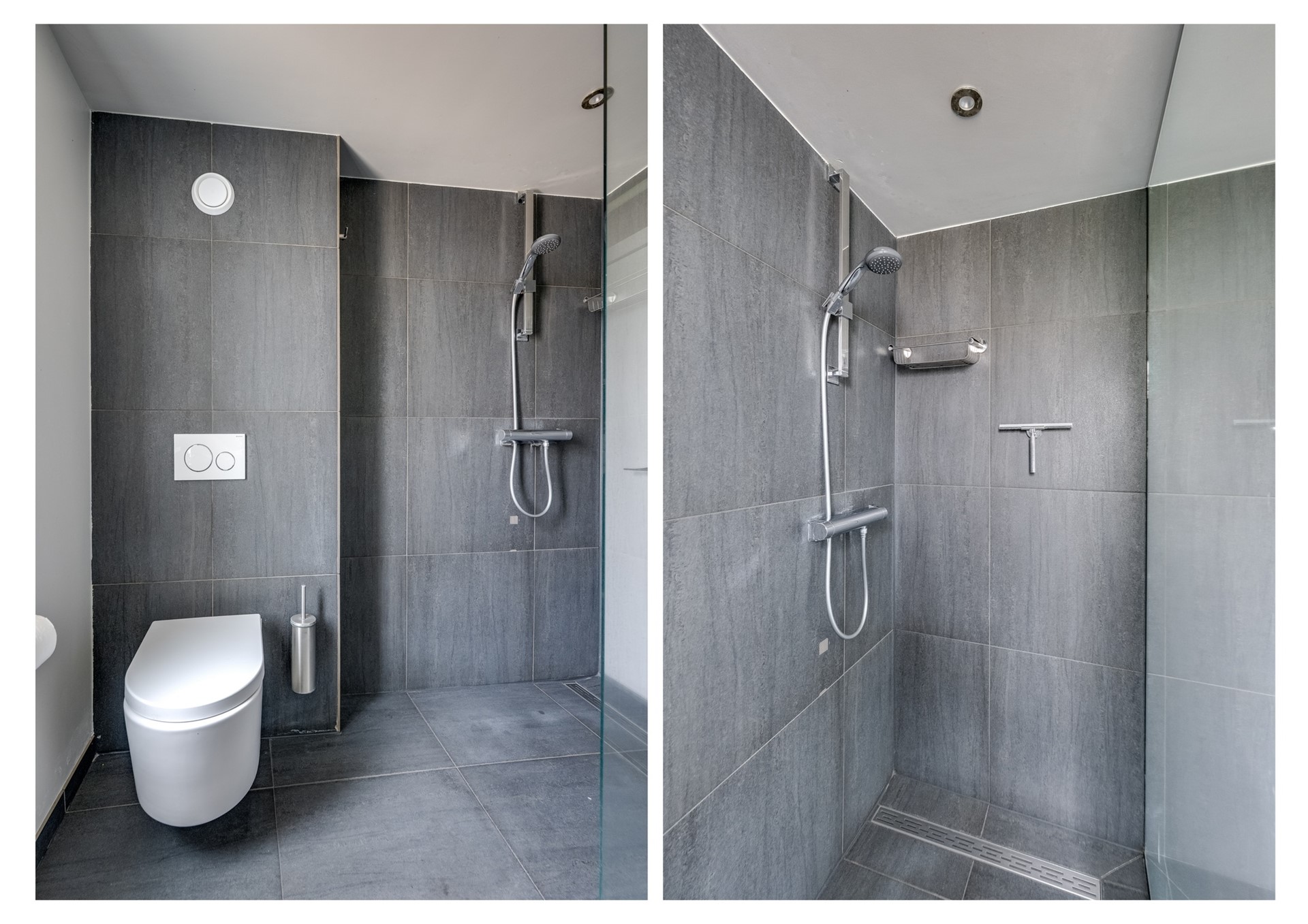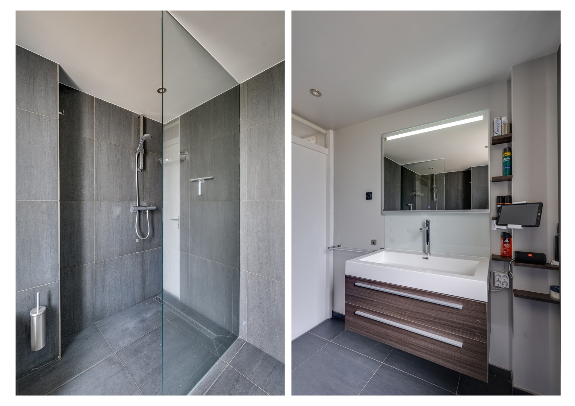 De badkamer (2,52 m. x 2,16 m.) ligt aan de voorzijde van de woning en heeft een inloopdouche v.v. thermostaatkraan en glazen wand. Verder vindt u hier een zwevend toilet en een wastafelmeubel met 2 lades. Er is elektra, ventilatie en er hangt een designradiator. De badkamer is gedeeltelijk betegeld en de wanden en plafond zijn verder v.v. glad stucwerk en inbouwspots.