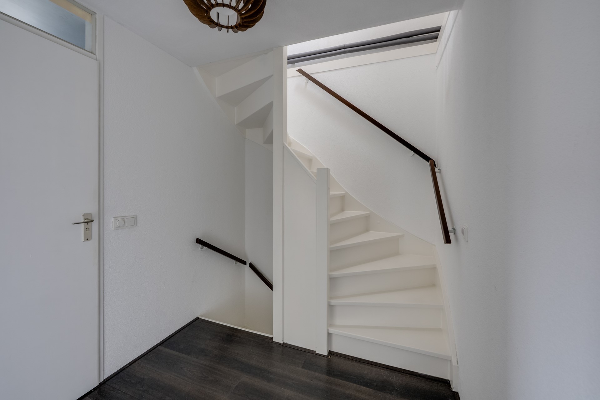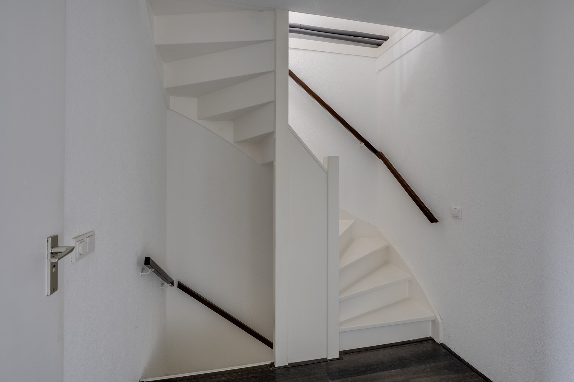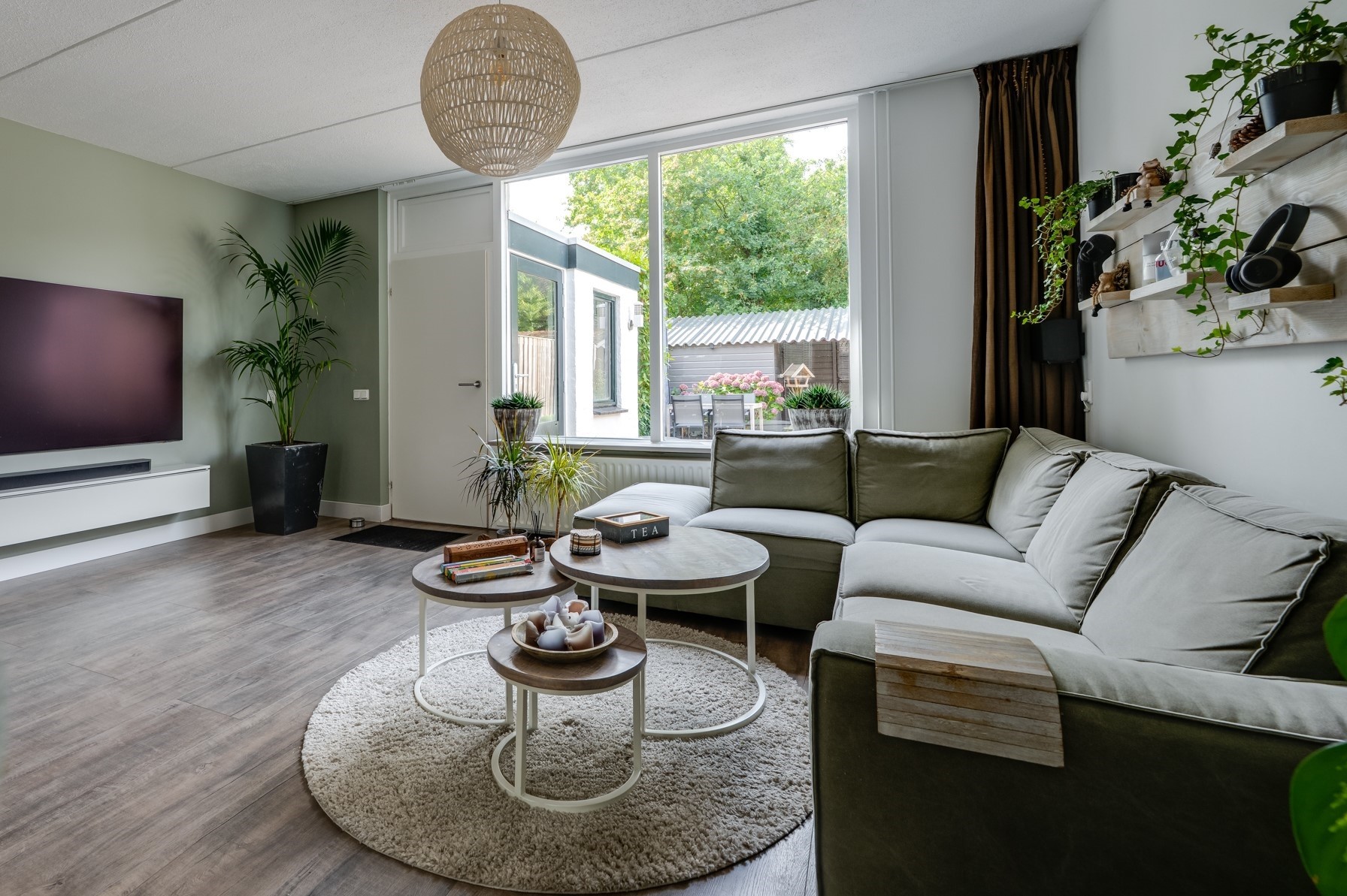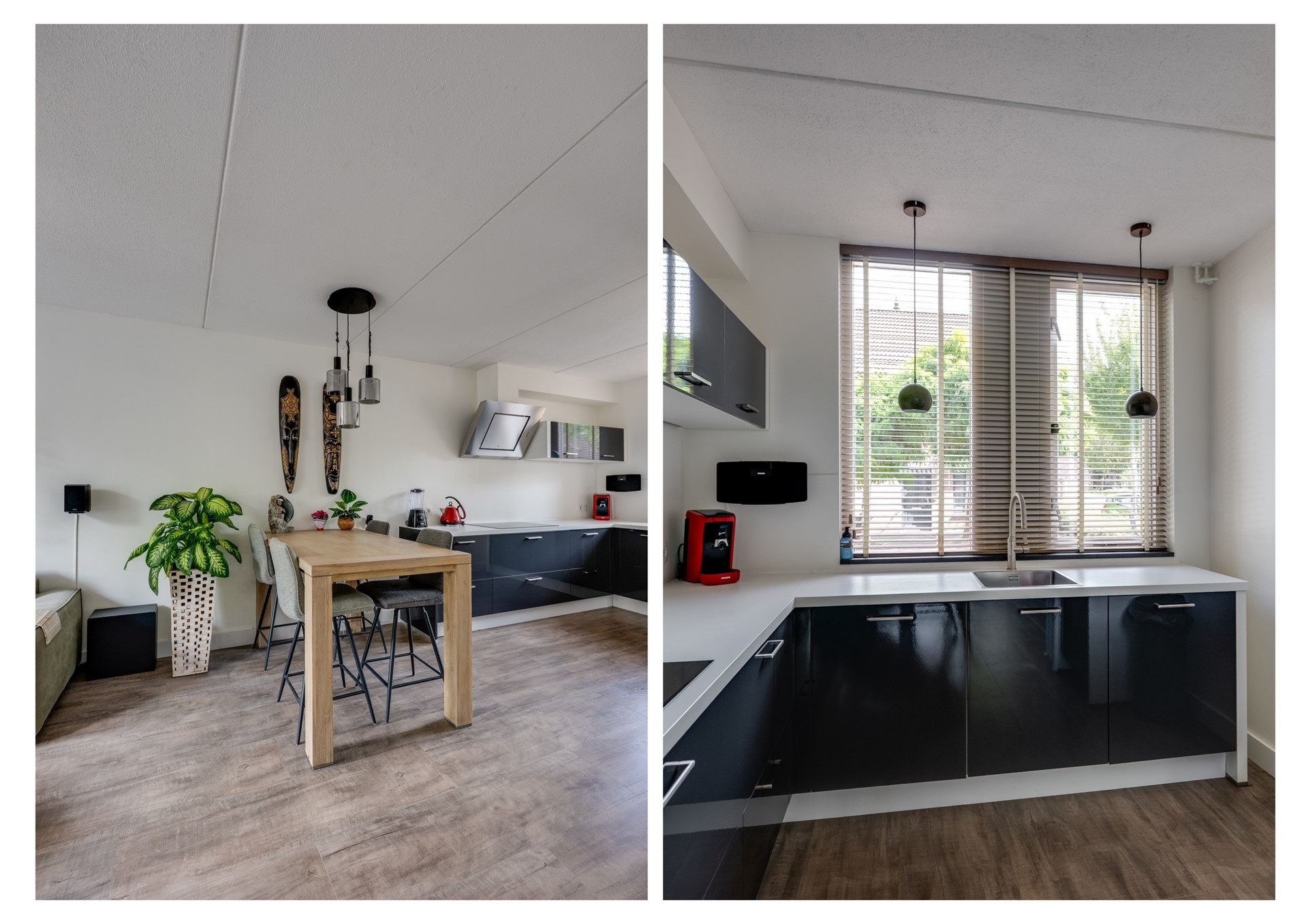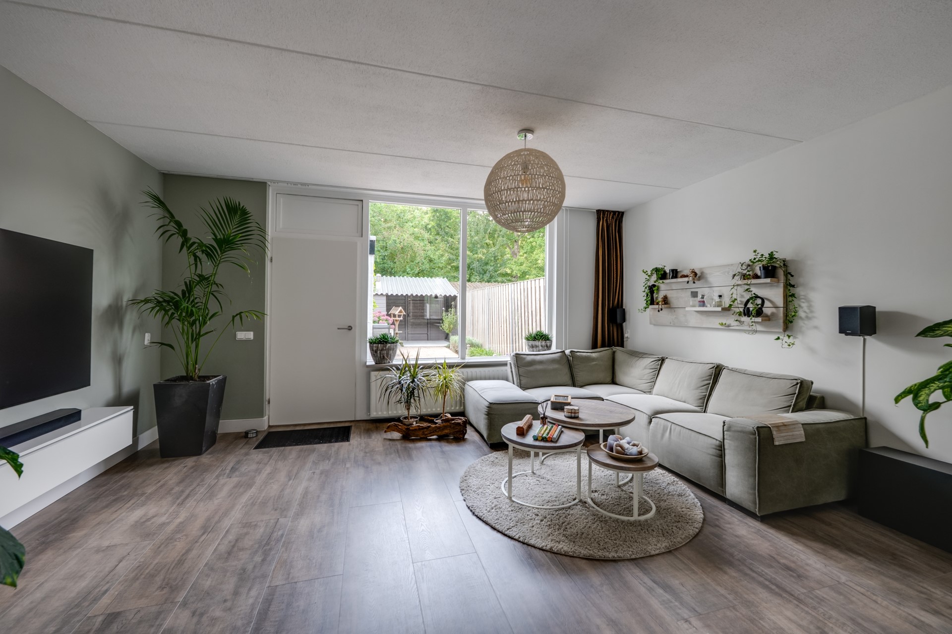 De woonkamer (5,93 m. x 5,11 m.) heeft aan de achterzijde van de woning het zitgedeelte met uitkijk op de tuin en aan de voorzijde de moderne, open keuken. Er ligt een brede, waterdichte laminaatvloer (2024) en wanden en het plafond zijn v.v. glad stucwerk. De hardhouten kozijnen zijn v.v. dubbel glas. Er is een loopdeur naar de bijkeuken en een andere deur brengt u bij de trapopgang naar de eerste verdieping. De trapkast met extra bergruimte is keurig afgewerkt en v.v. verlichting en elektra.