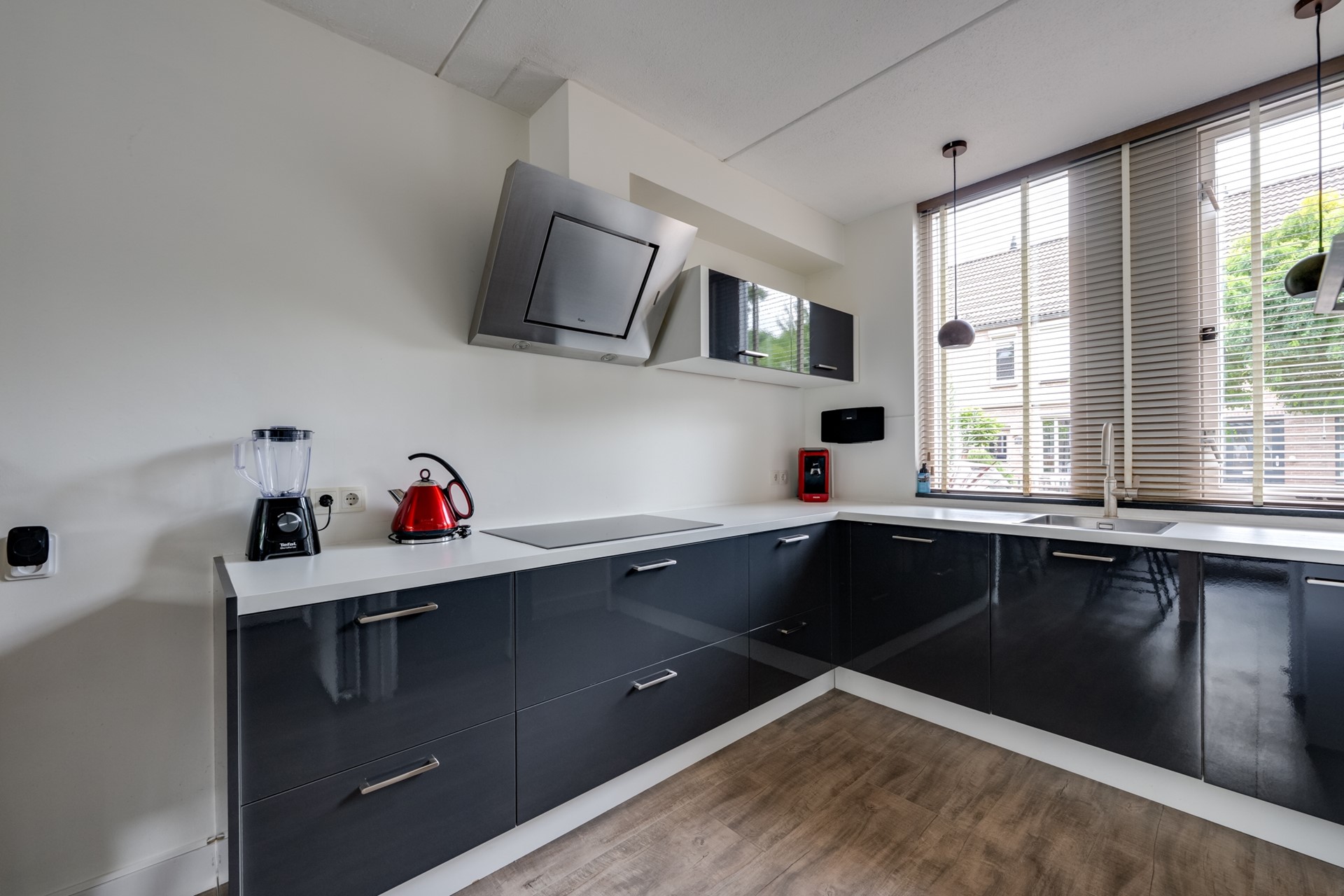 Deze moderne open keuken (2,70 m. x 2,20 m.) ligt aan de voorzijde van de woning en bestaat uit een hoekopstelling v.v. een koelkast, een 4 pits inductiekookplaat, een moderne afzuigkap, een combimagnetron en een vaatwasser. De wanden zijn glad gestuct en de hardhouten kozijnen v.v. dubbel glas.