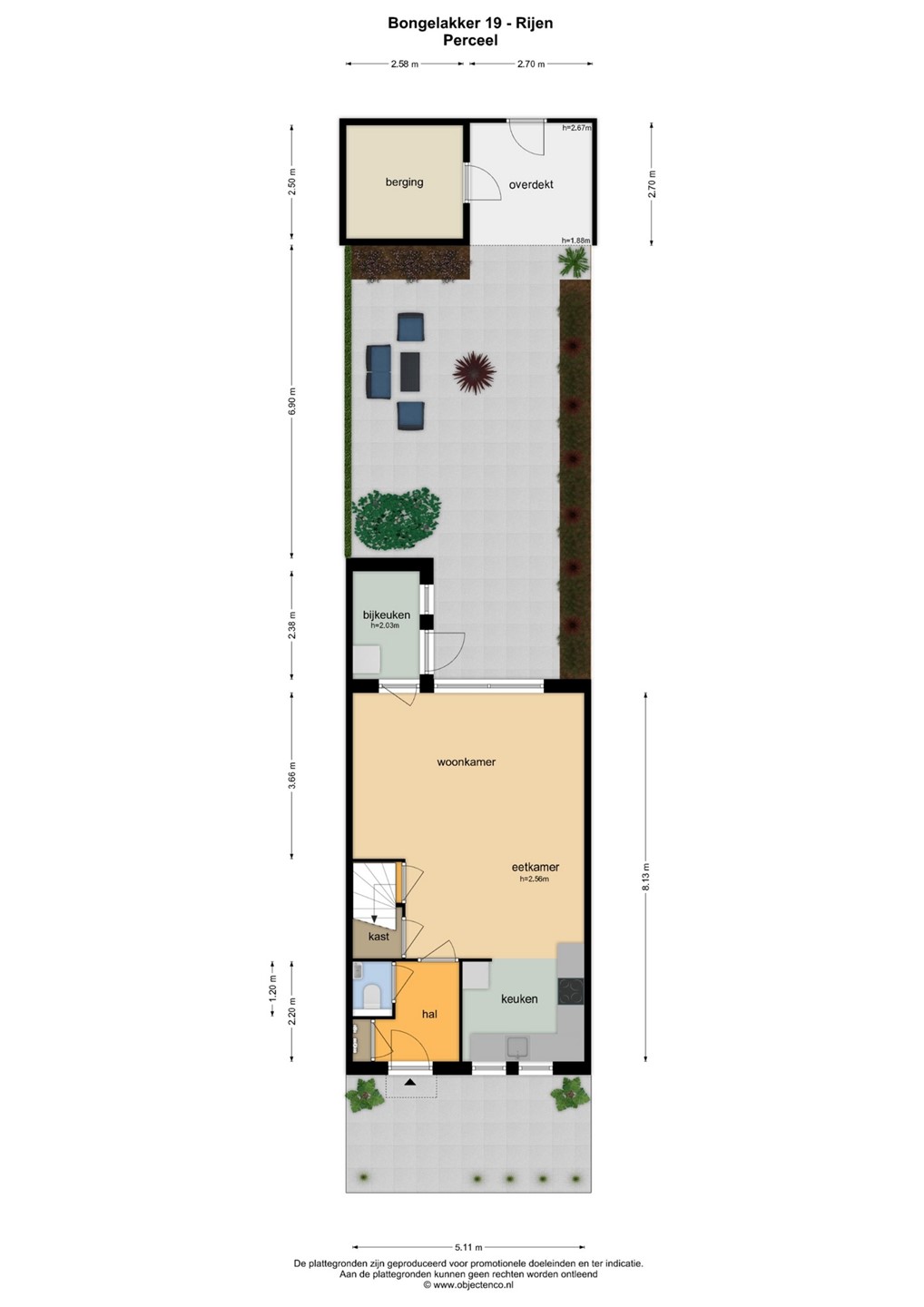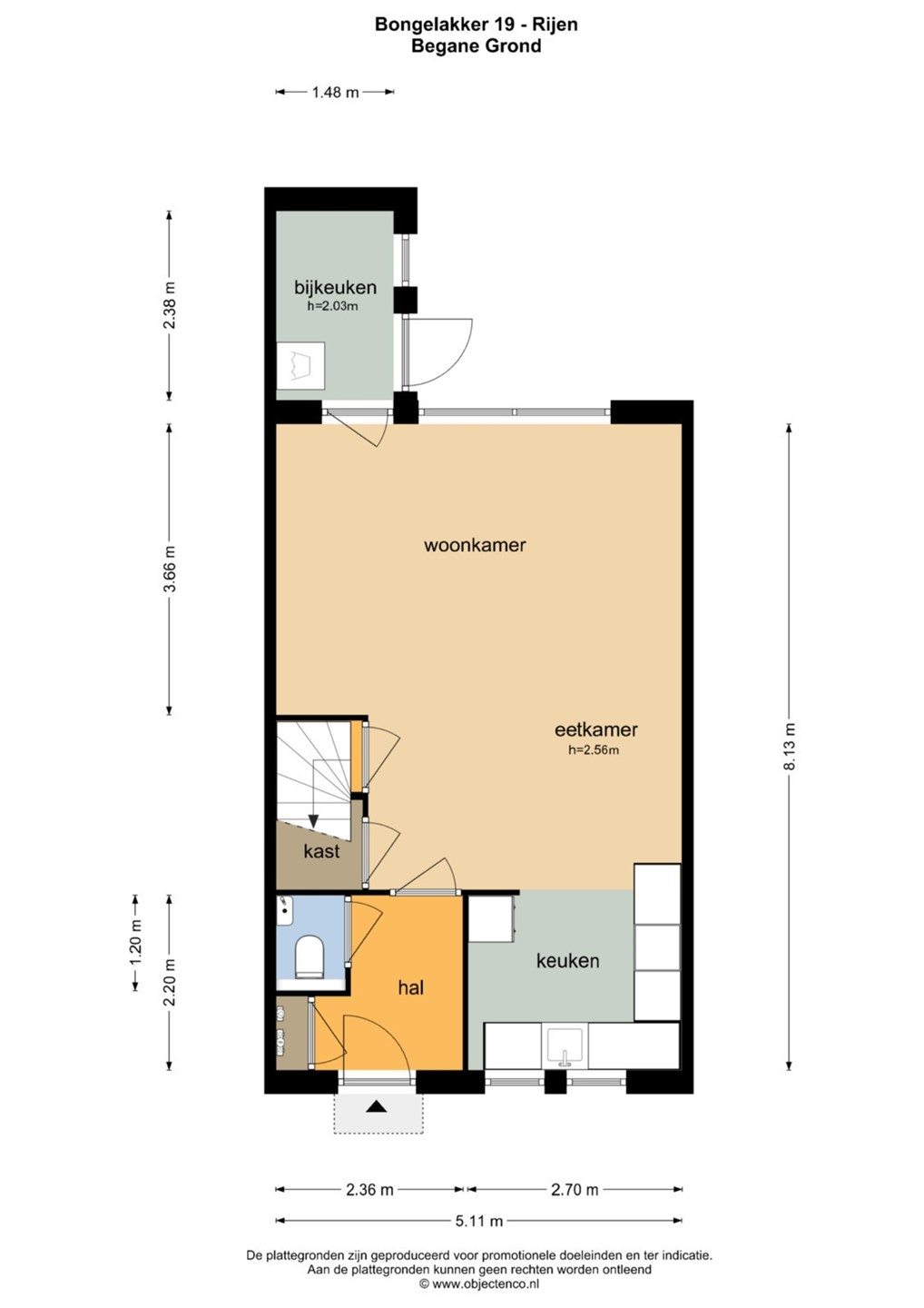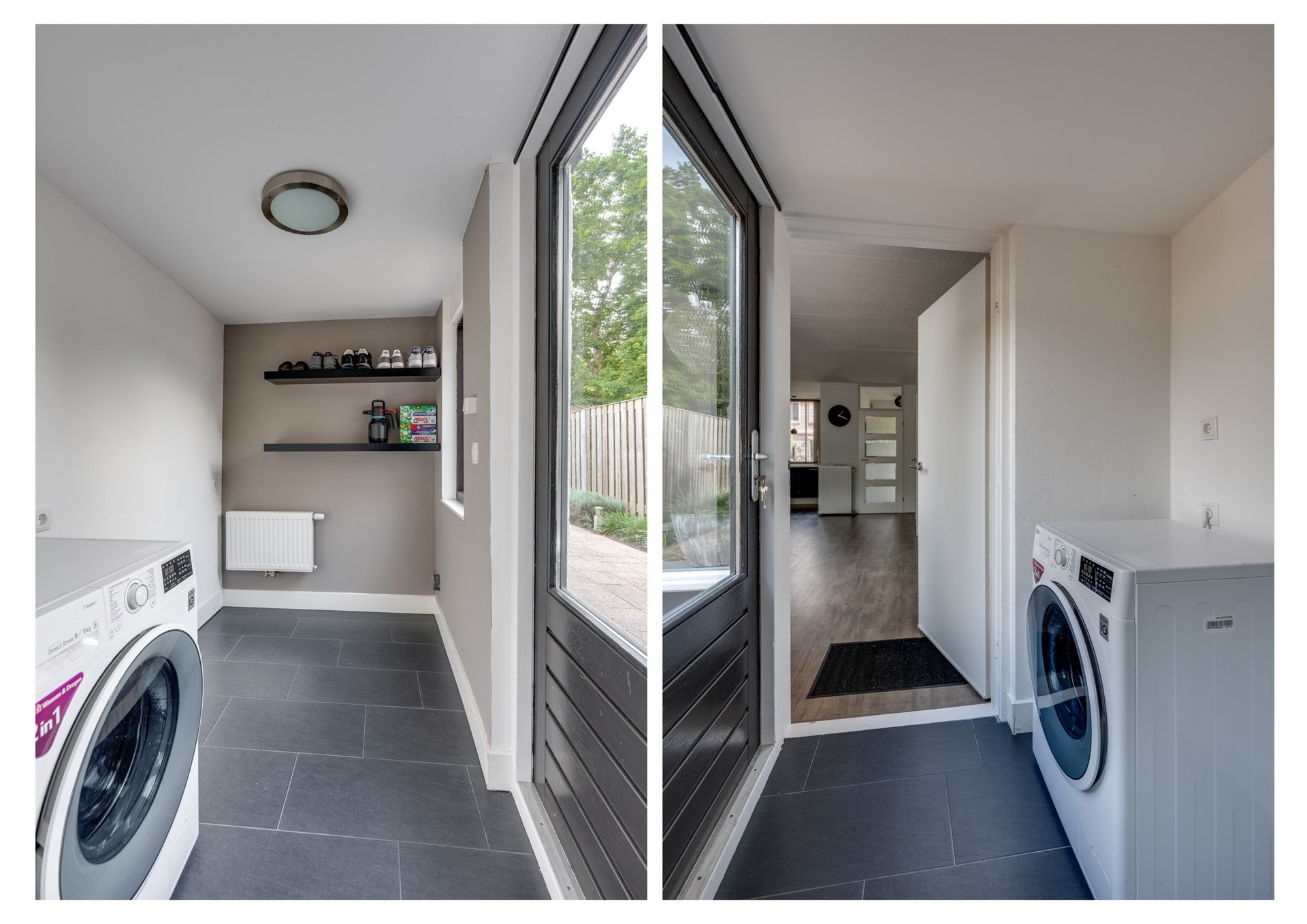 In de bijkeuken (2,38 m. x 1,48 m.) vindt u de wasaansluitingen en extra bergruimte. Er ligt een praktische tegelvloer en de wanden en het plafond zijn v.v. glad stucwerk. De ruit in het hardhouten kozijn is lek. Er is een loopdeur naar de achtertuin.