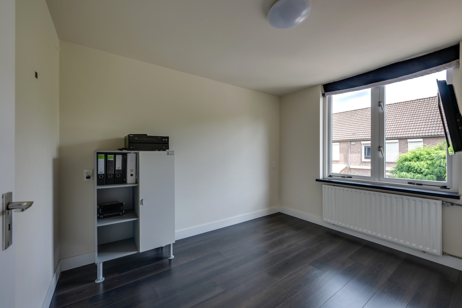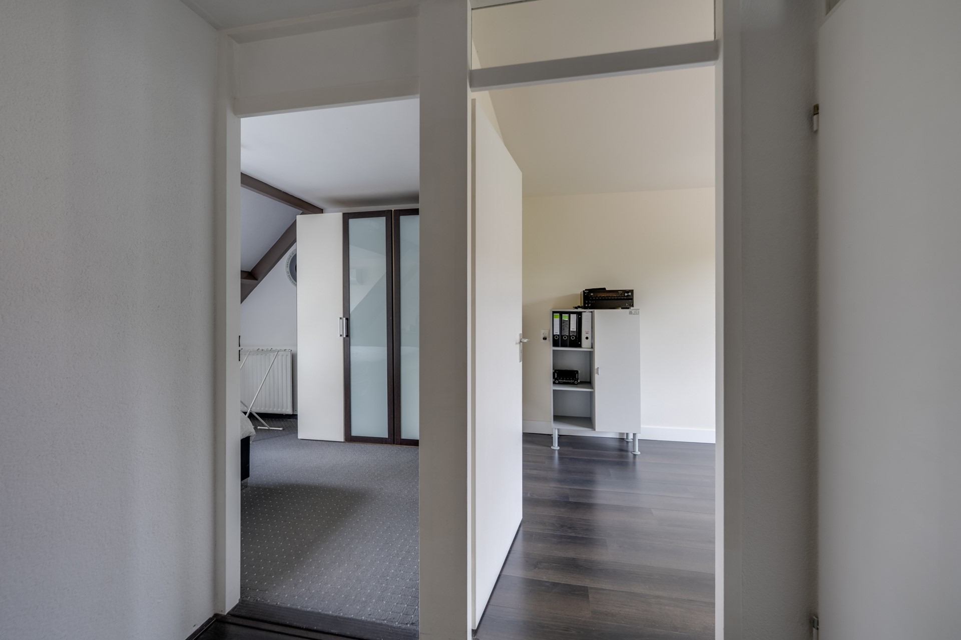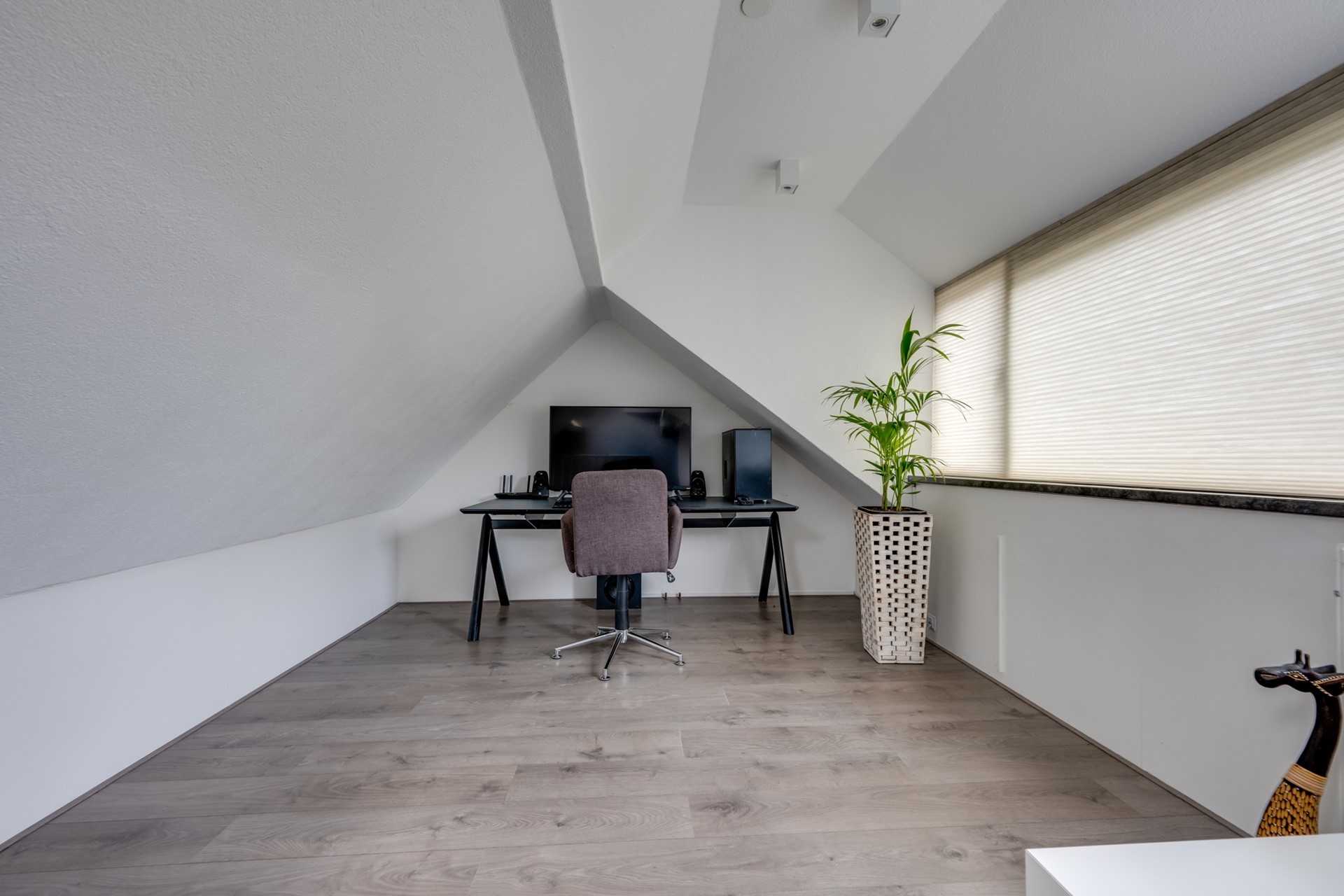 Via de trapopgang komt u op de bovenste verdieping. Hier hangt de cv-ketel (Remeha 2021). Deze ruimte (3,35 m. x 2,88 m.) wordt momenteel als kantoor gebruikt. Hier ligt een laminaatvloer. De wanden zijn weer v.v. glad stucwerk. Het hardhouten kozijn van de dakkapel, aan de voorzijde, is v.v. dubbel glas.