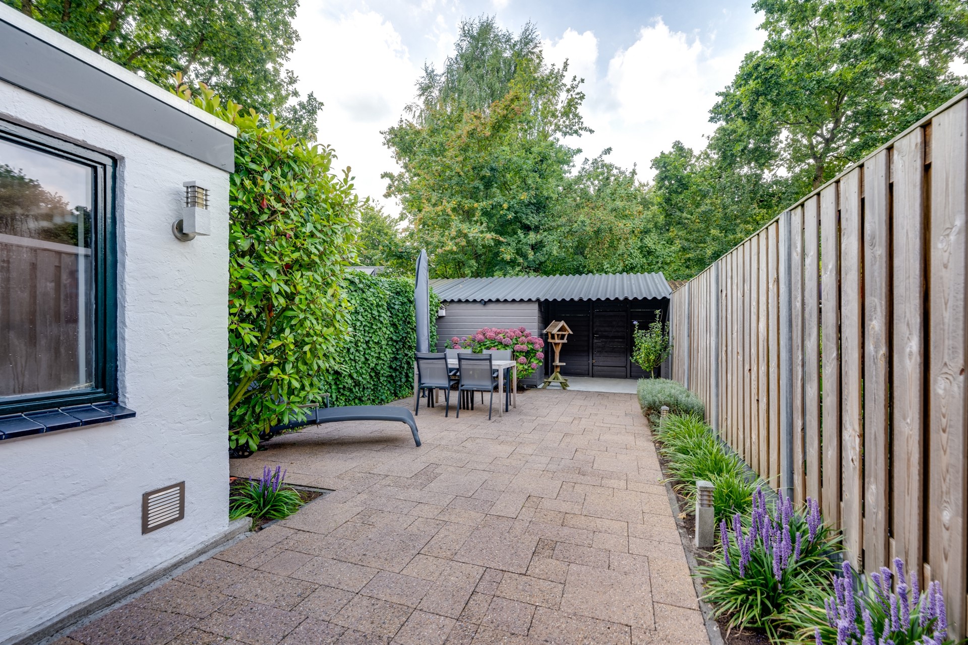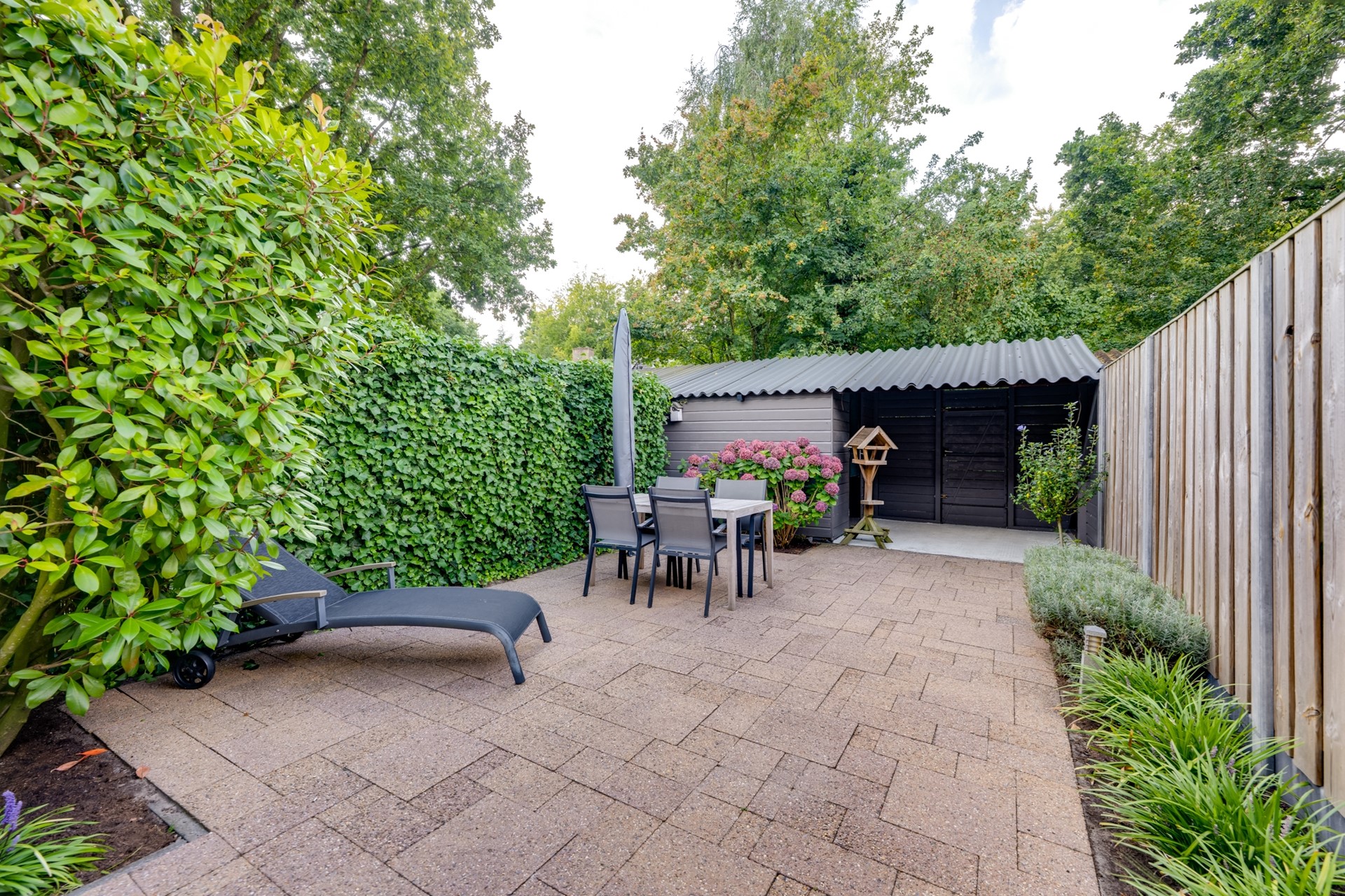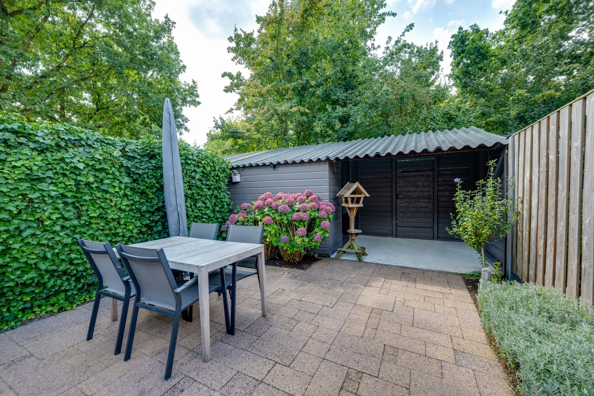De achtertuin (11,80 m. x 5,40 m.) ligt op het zuidwesten en ligt in een groene omgeving met veel privacy, omdat u geen directe achterburen heeft. De achtertuin is v.v. sierbestrating, vaste beplanting, tuinverlichting en een buitenkraan. Achter in de tuin staat een berging v.v. elektra met daarnaast een kleine overdekt gedeelte. De tuin is via een poort aan de achterzijde te bereiken, waar u ook de speelvelden en speeltuin treft.