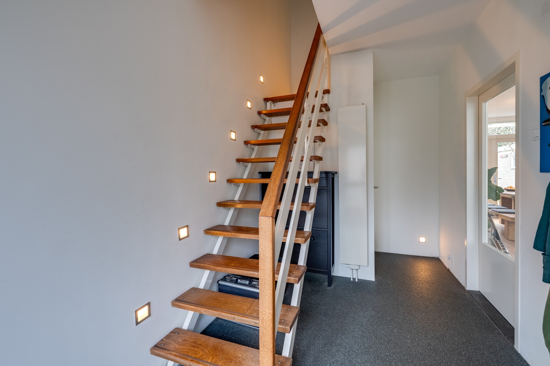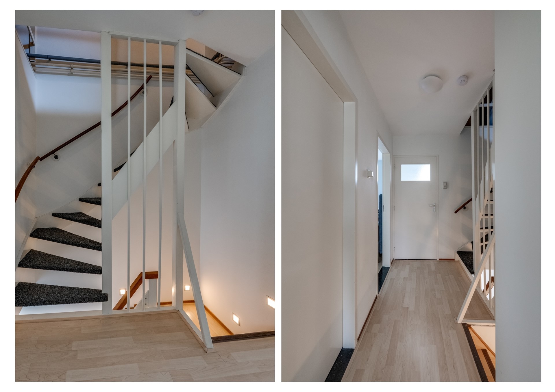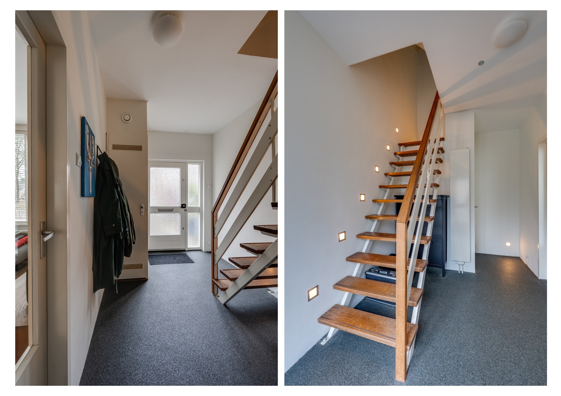 De entree is voorzien van een slijtvaste grindvloer, garderobe, meterkast (6 groepen, 2 aardlekschakelaars) en deels betegelde toiletruimte met zwevend closet en fonteintje. U vindt hier ook de trap naar de eerste etage, met inbouwverlichting.