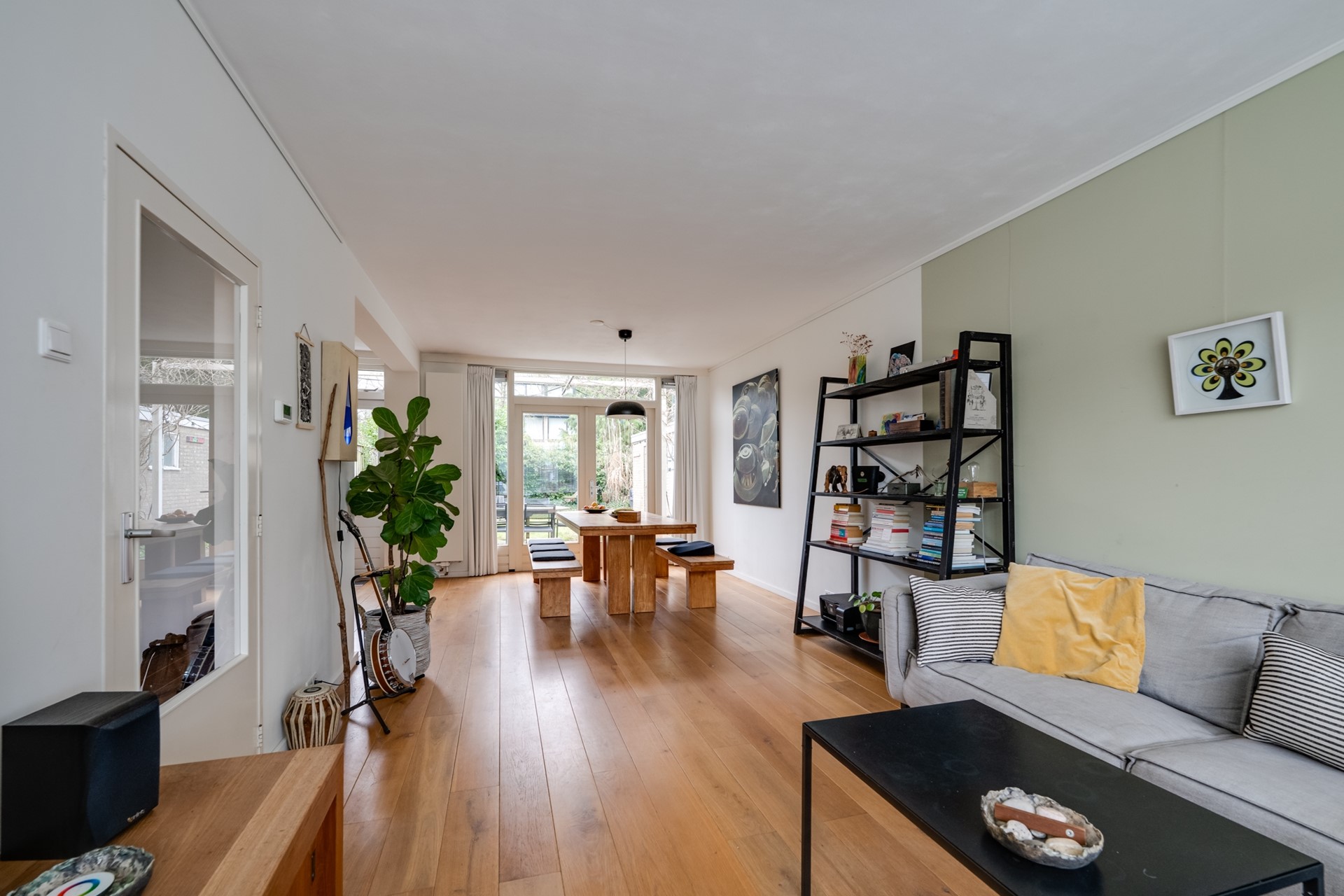 De woonkamer (7,90 m. x 3,63 m.) heeft veel lichtinval aan de voor- en achterzijde door de grote houten en witte aluminium kozijnen v.v. dubbel glas. Er ligt een volle houten vloer en de wanden en plafond zijn glad afgewerkt. Via de openslaande tuindeuren (HR++) en achterdeur kunt u de tuin betreden.