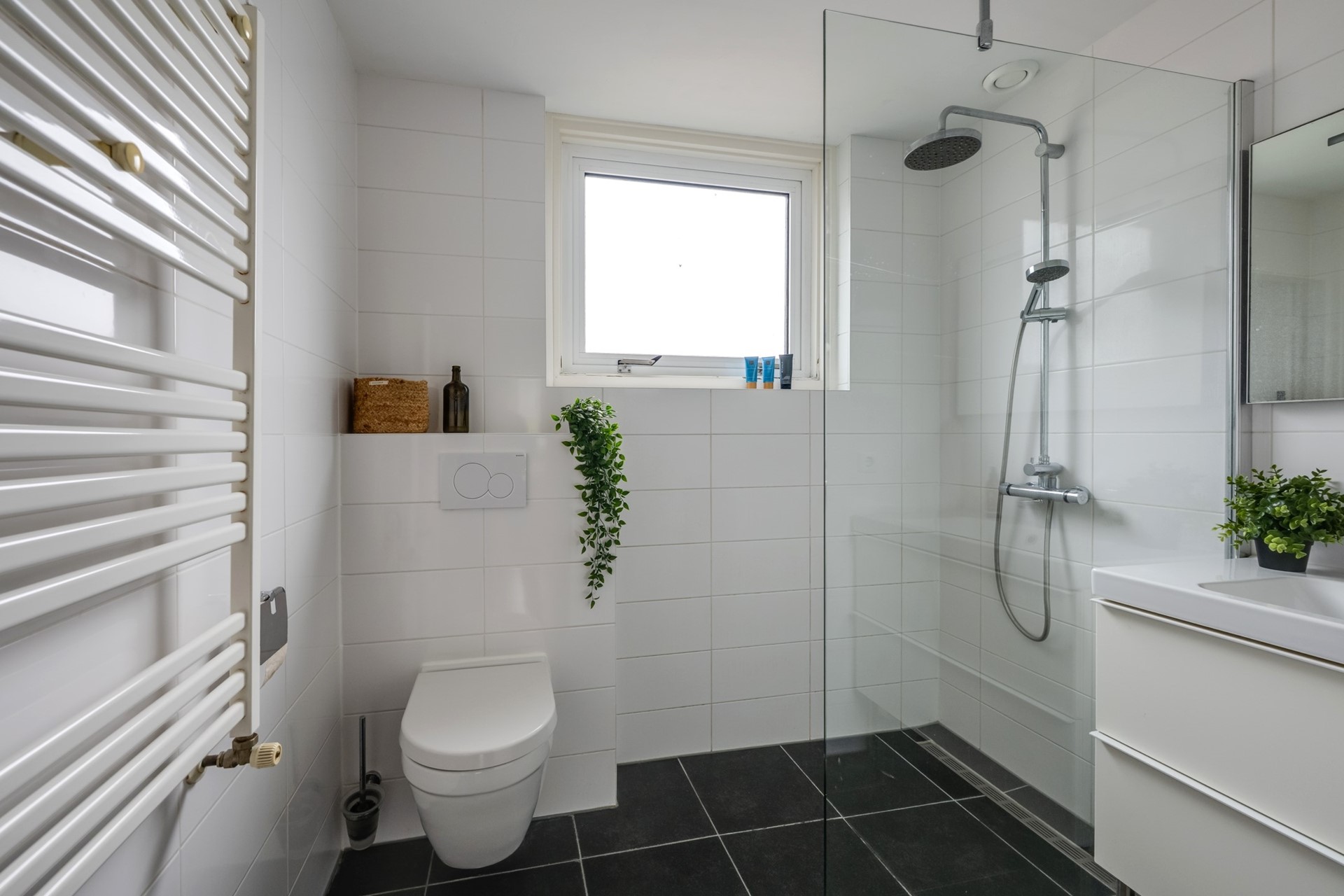 De geheel betegelde badkamer (2,16 m. x 1,80 m.) is uitgerust met een inloopdouche v.v. thermostaatkraan, een zwevend toilet en een wastafelmeubel v.v. 2 lades. Er hangt een designradiator en er zijn 2 elektrapunten aanwezig.