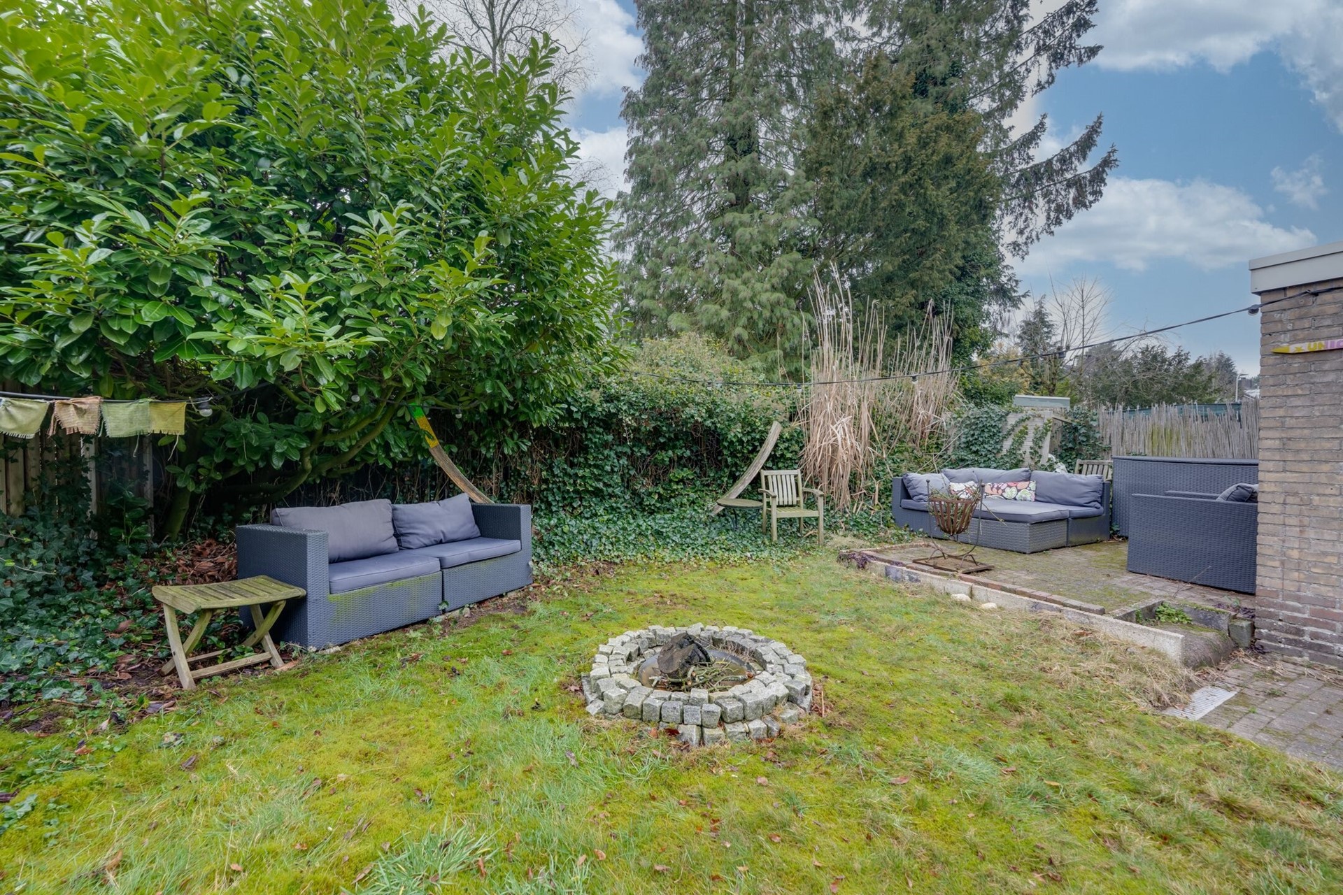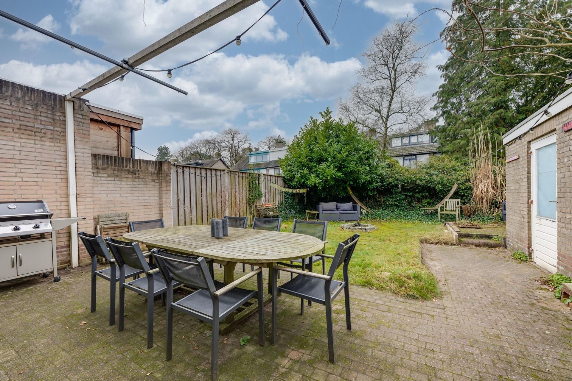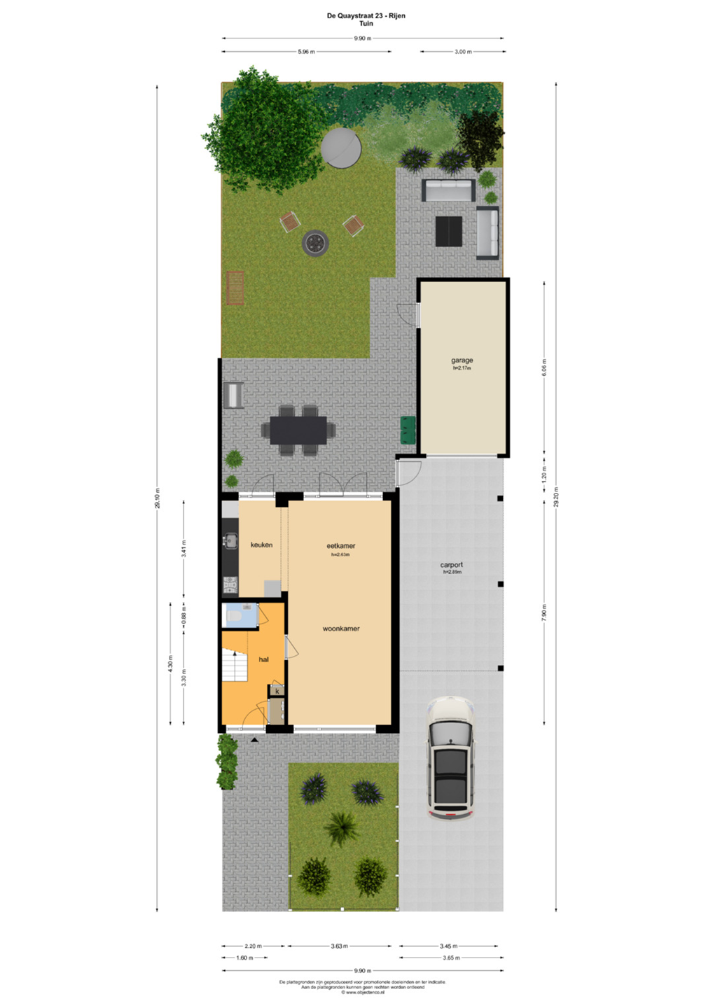 De tuin (ca. 15 meter diep en 9,90 / 5,96 m. breed) ligt op het (zuid)westen. De tuin is v.v. sierbestrating, een gazon, vaste beplanting en een buitenkraan. U heeft toegang tot de garage en via een zijpoort kunt u naar de oprit met carport.