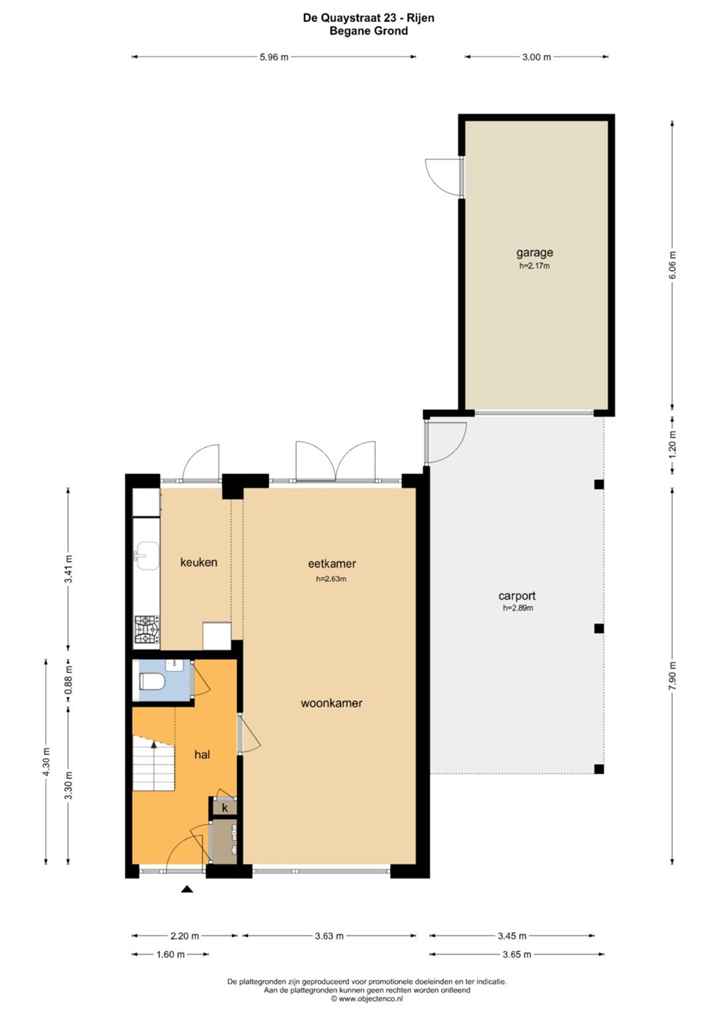 De garage (6,06 m. x 3 m. x 2,17 hoog) is v.v. elektra en er is een stalen kanteldeur en loopdeur naar de tuin. Voor de garage vindt u de oprit (ca. 15 meter lang) met carport (ca. 7,50 m. lang x 3,45 m. breed en 2,89 m. hoog). U kunt in de garage 1 auto parkeren en op de oprit nog eens 3 auto’s. Onder de carport past hoogstwaarschijnlijk ook uw caravan of camper.