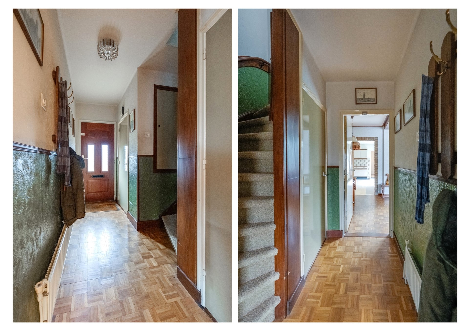U komt binnen in de hal met de garderobe, het staand toilet met fonteintje, de trapkast, de trap naar de eerste etage en de deur naar de woonkamer. Hier bevindt zich ook de meterkast (7 groepen / 2 aardlekschakelaars).