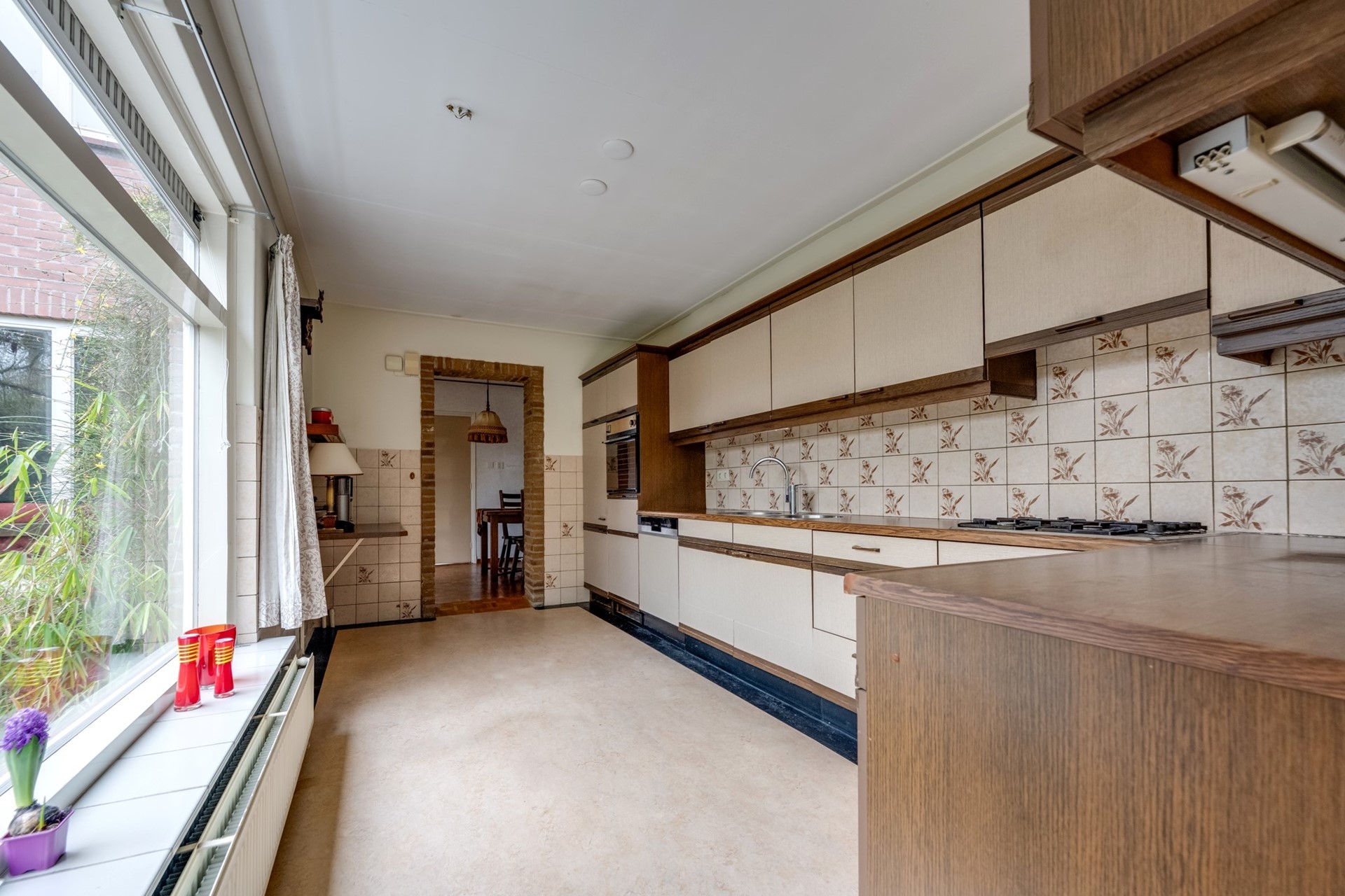 De aangebouwde keuken (4,80 m. x 2,70 m.) heeft een keukenblok v.v. een koelkast, 4 pits gaskookplaat, afzuigkap, oven, een vaatwasser (2025) en een dubbele spoelbak. De hardhouten kozijnen zijn v.v. dubbel glas. Op de vloer ligt een vinylvloer en de wanden zijn deels betegeld. U kunt vanuit de keuken naar de bijkeuken.